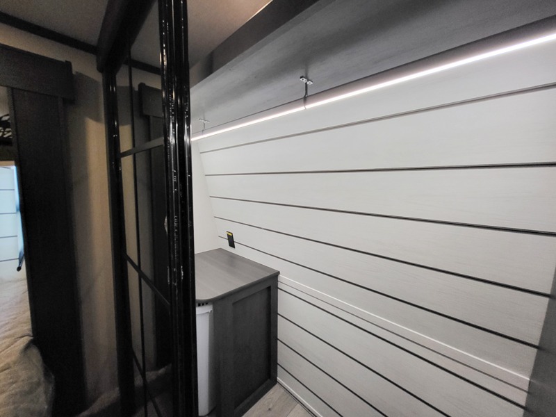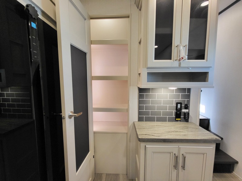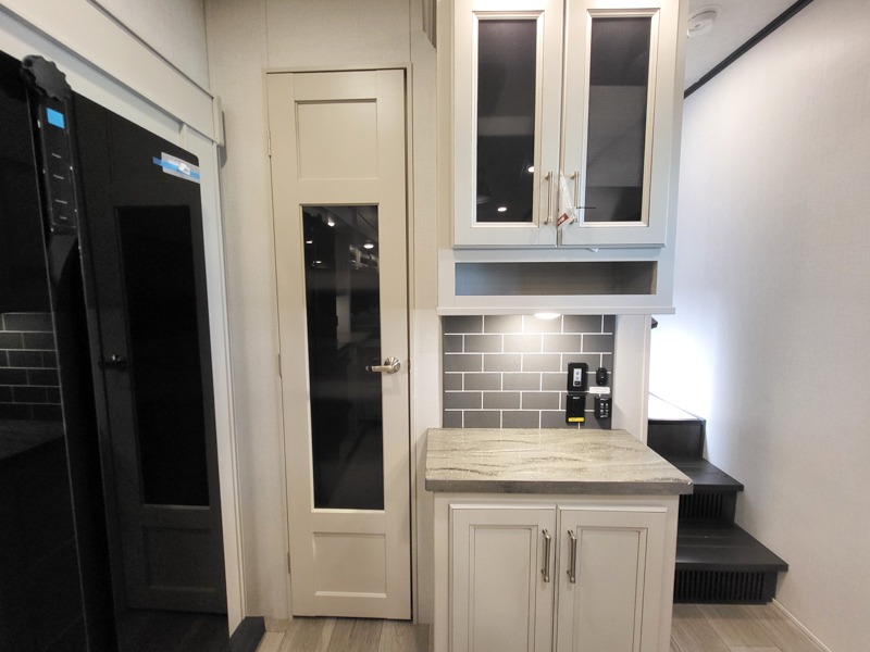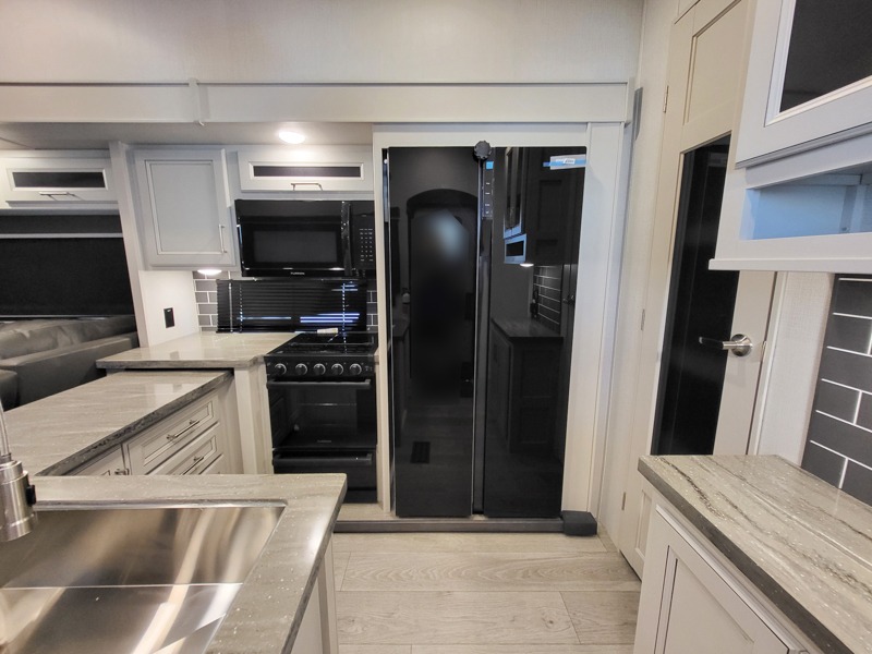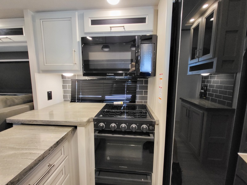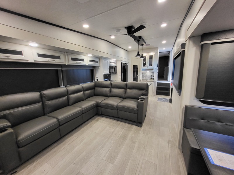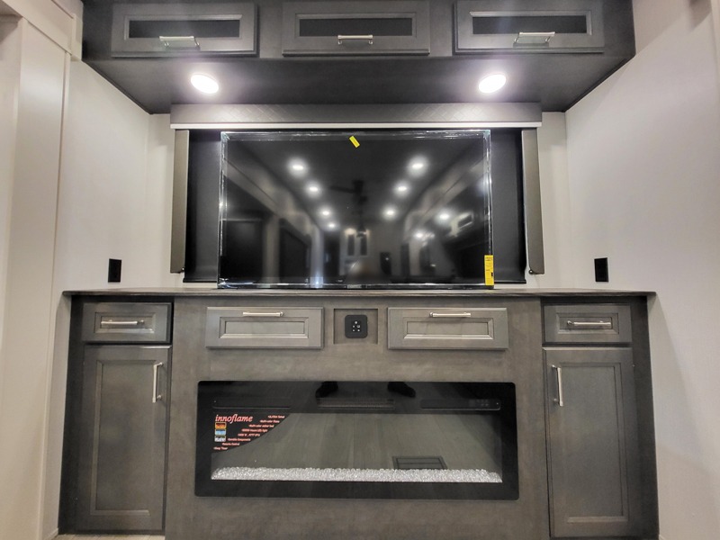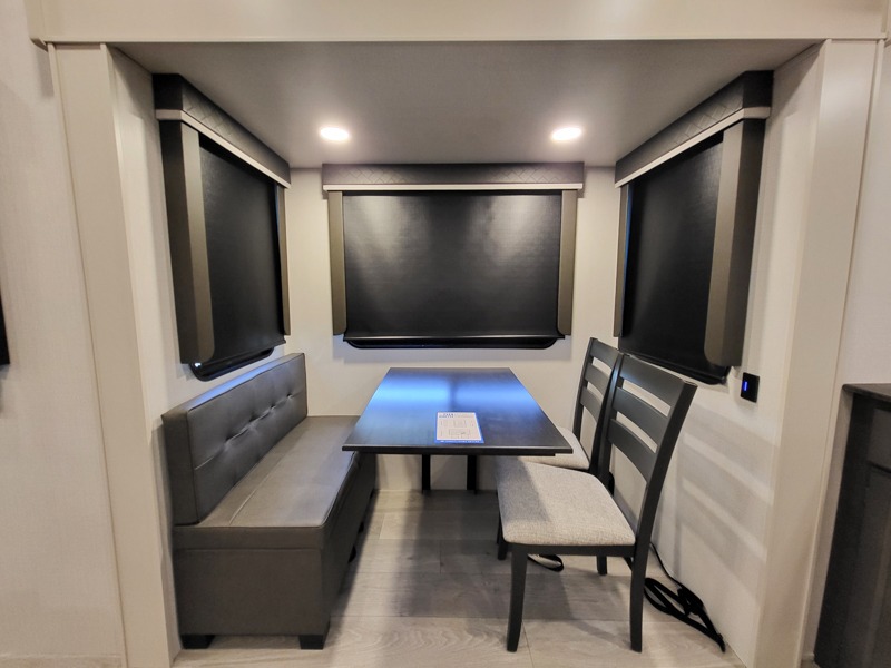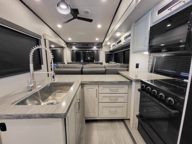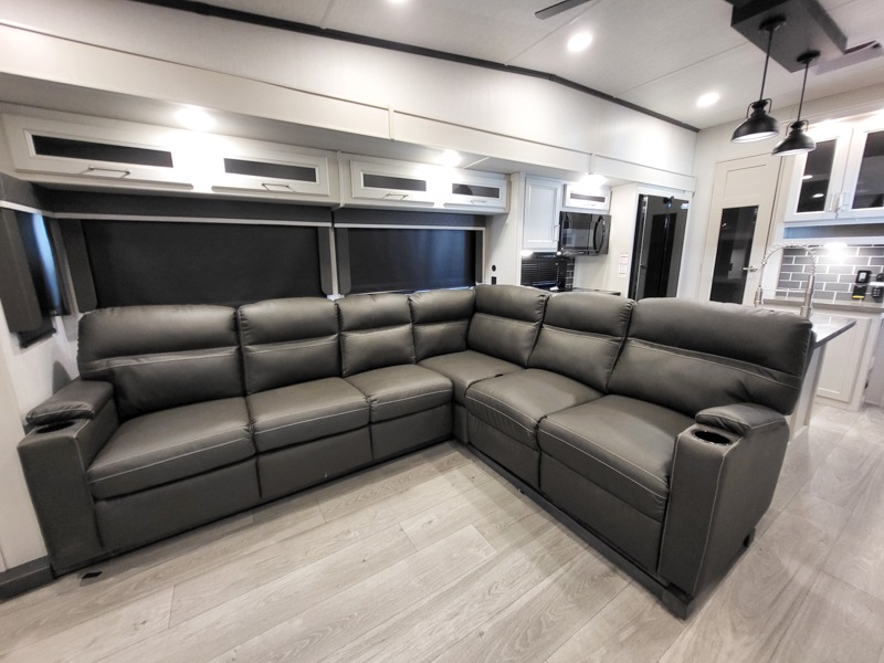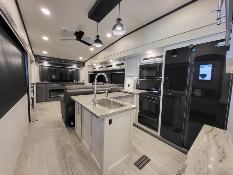Time at the campground will be spent in comfort thanks to this fifth wheel that can sleep four to six people comfortably. The rear living area/den includes a huge L-shaped sofa with theater seats and a king tri-fold sofa, plus a free-standing dinette with an ottoman on one side, a fireplace, and an LED HDTV for movie nights. The chef of your group will love the additional counter space in the kitchen, along with a 21" Furrion range, plus a pantry and 16 cu. ft. 12V refrigerator. The full bath allows you to clean up each day and the front private bedroom will provide you with your own space at night. Here, you'll find a queen bed slide out that can optioned out for a king bed, plus a full height wardrobe, a second wardrobe with washer and dryer prep, and a dresser with a sliding top and hidden storage for valuables!