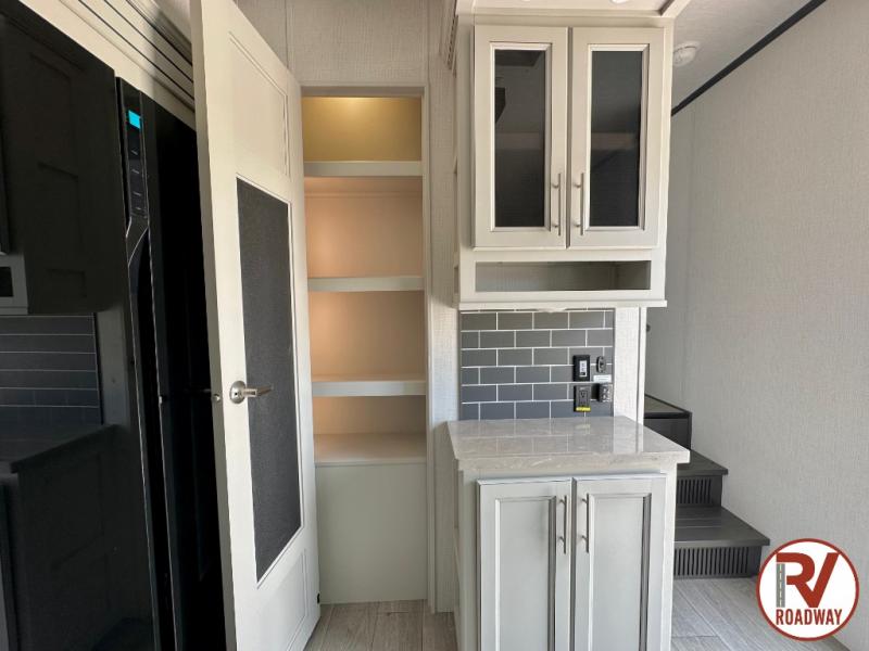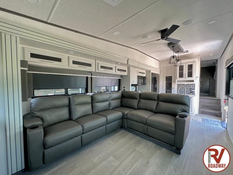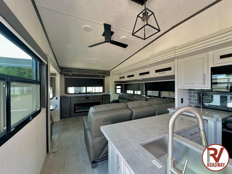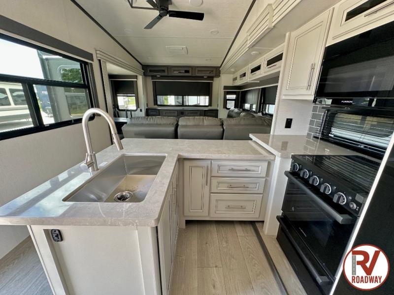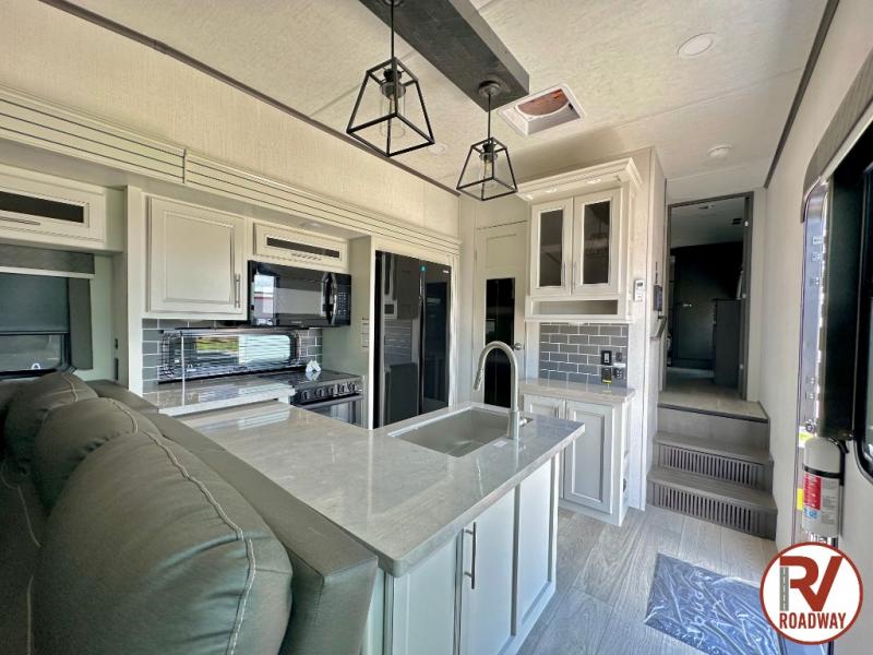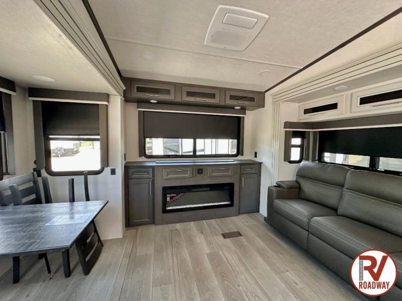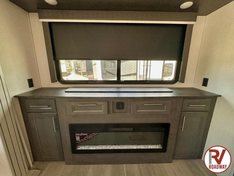 Time at the campground will be spent in comfort thanks to this fifth wheel that can sleep four to six people comfortably. The rear living area/den includes a huge L-shaped sofa with theater seats and a king tri-fold sofa, plus a free-standing dinette with an ottoman on one side, a fireplace, and an LED HDTV for movie nights. The chef of your group will love the additional counter space in the kitchen, along with a 21" Furrion range, plus a pantry and 16 cu. ft. 12V refrigerator. The full bath allows you to clean up each day and the front private bedroom will provide you with your own space at night. Here, you'll find a queen bed slide out that can optioned out for a king bed, plus a full height wardrobe, a second wardrobe with washer and dryer prep, and a dresser with a sliding top and hidden storage for valuables!
