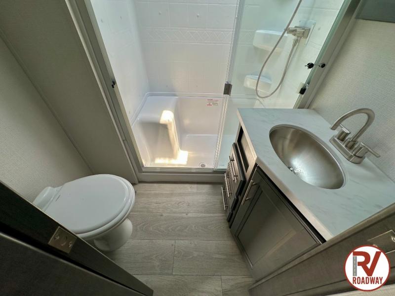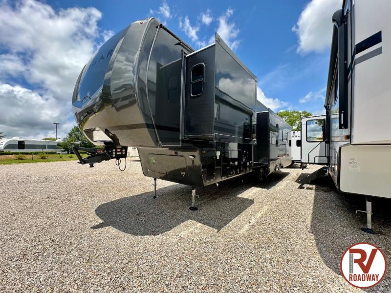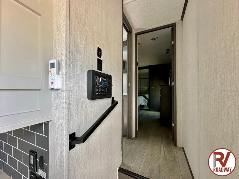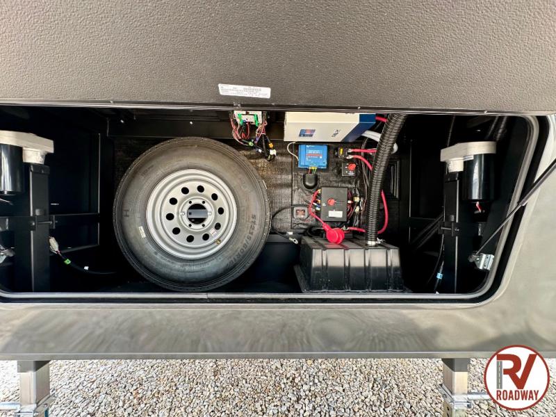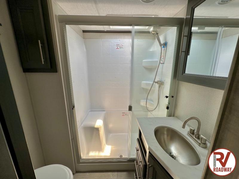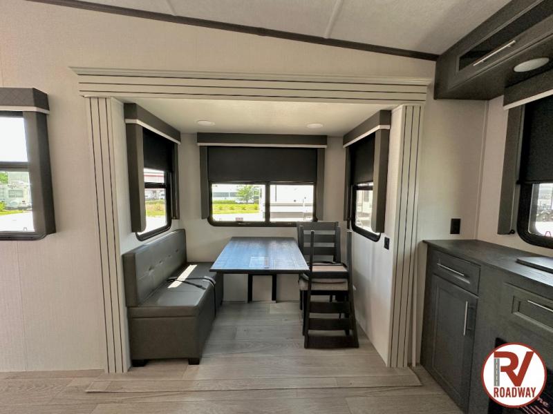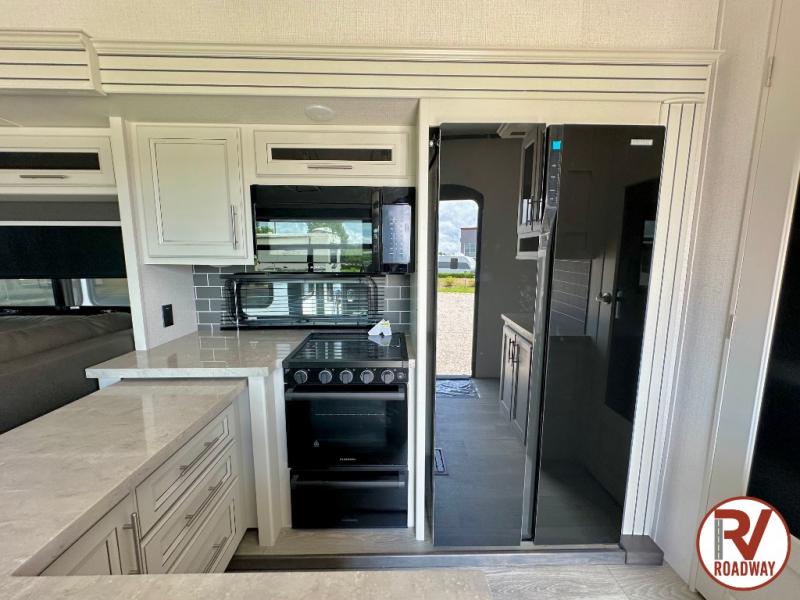 Time at the campground will be spent in comfort thanks to this fifth wheel that can sleep four to six people comfortably. The rear living area/den includes a huge L-shaped sofa with theater seats and a king tri-fold sofa, plus a free-standing dinette with an ottoman on one side, a fireplace, and an LED HDTV for movie nights. The chef of your group will love the additional counter space in the kitchen, along with a 21" Furrion range, plus a pantry and 16 cu. ft. 12V refrigerator. The full bath allows you to clean up each day and the front private bedroom will provide you with your own space at night. Here, you'll find a queen bed slide out that can optioned out for a king bed, plus a full height wardrobe, a second wardrobe with washer and dryer prep, and a dresser with a sliding top and hidden storage for valuables!