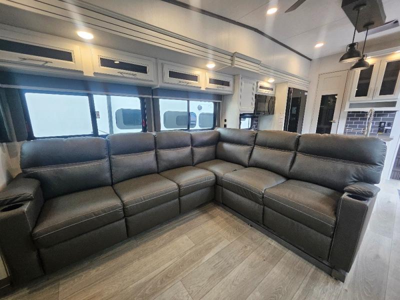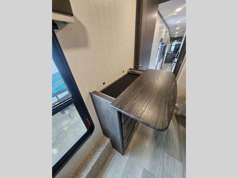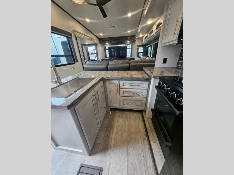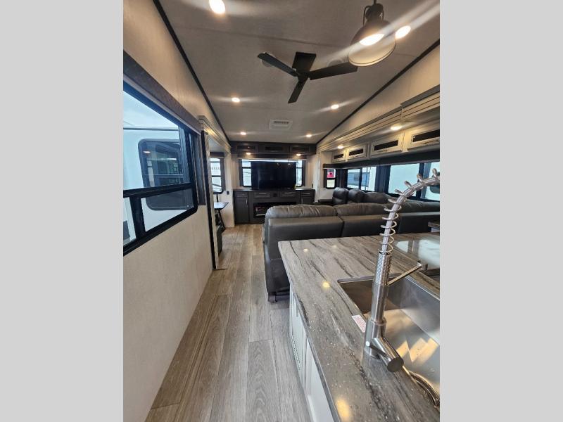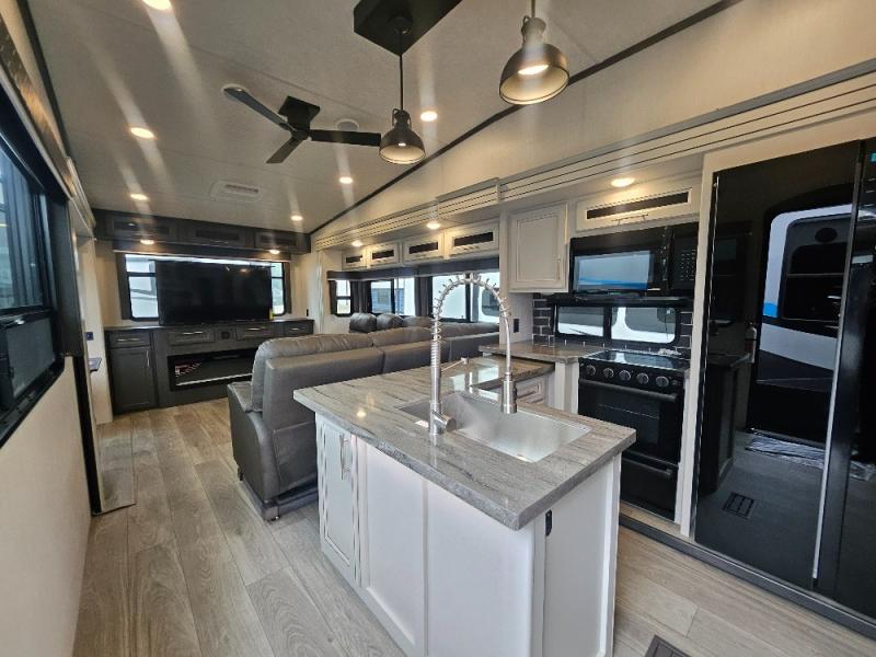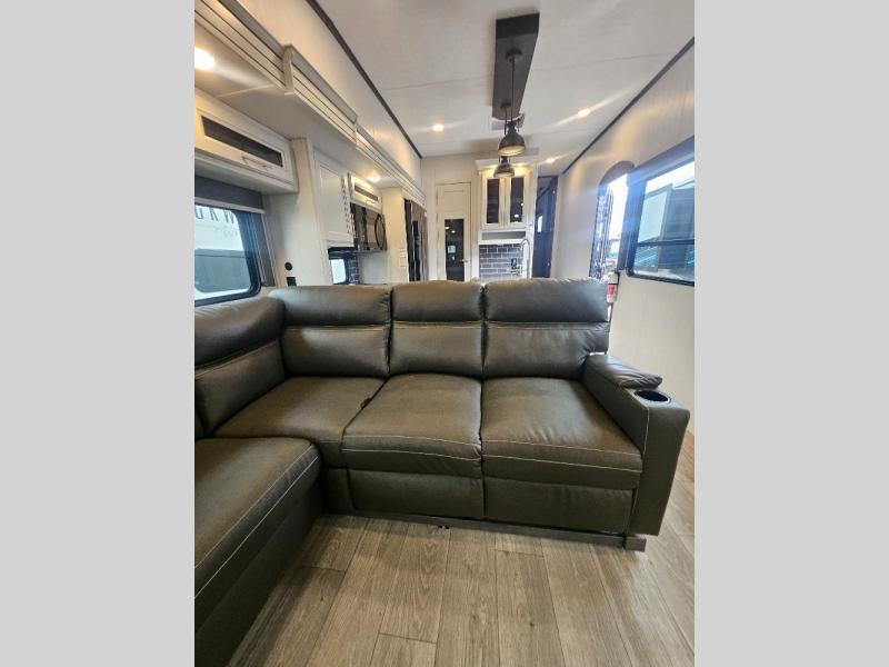 Time at the campground will be spent in comfort thanks to this fifth wheel that can sleep four to six people comfortably. The rear living area/den includes a huge L-shaped sofa with theater seats and a king tri-fold sofa, plus a free-standing dinette with an ottoman on one side, a fireplace, and an LED HDTV for movie nights. The chef of your group will love the additional counter space in the kitchen, along with a 21" Furrion range, plus a pantry and 16 cu. ft. 12V refrigerator. The full bath allows you to clean up each day and the front private bedroom will provide you with your own space at night. Here, you'll find a queen bed slide out that can optioned out for a king bed, plus a full height wardrobe, a second wardrobe with washer and dryer prep, and a dresser with a sliding top and hidden storage for valuables!