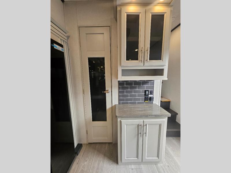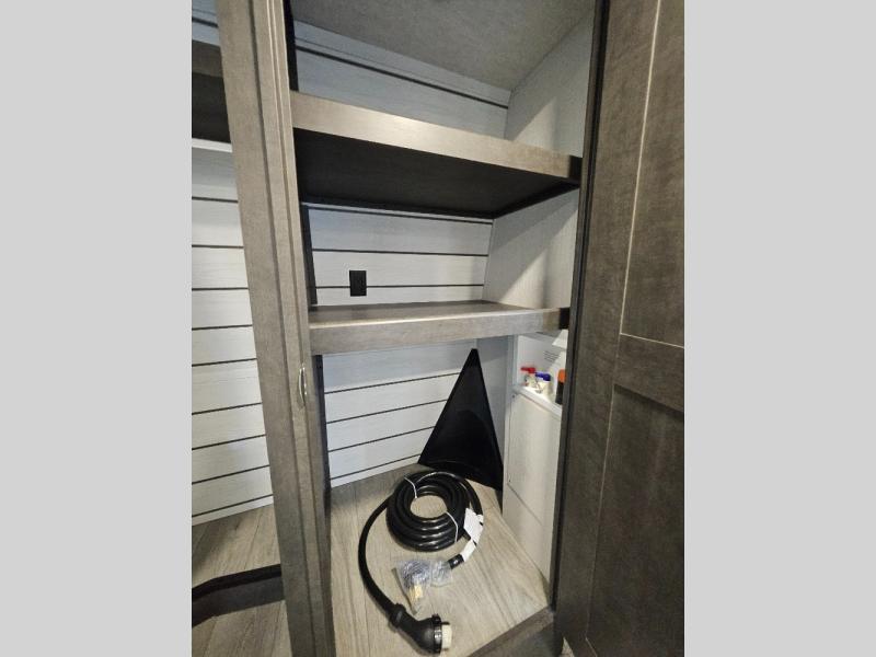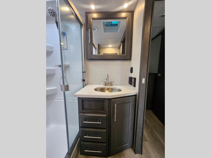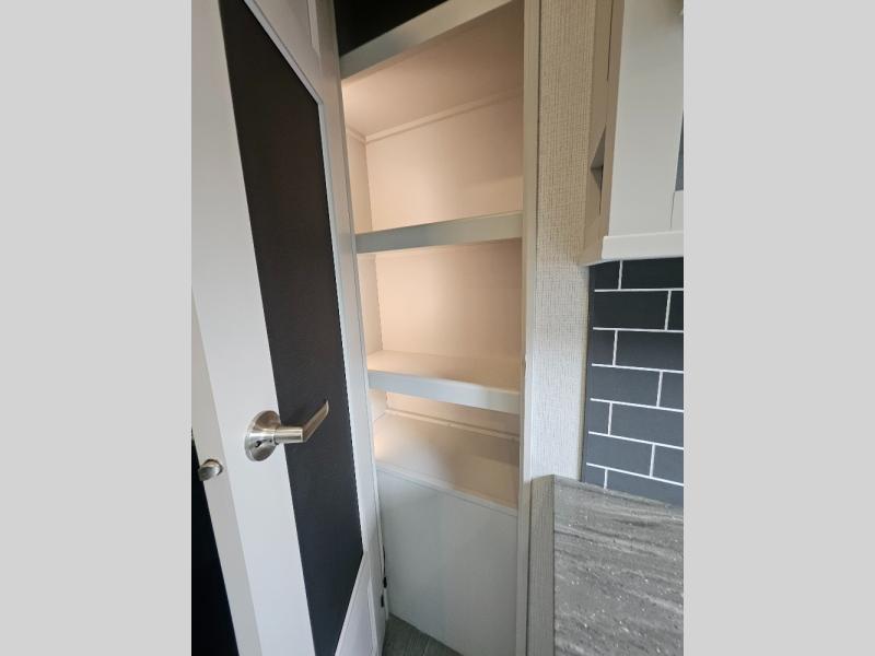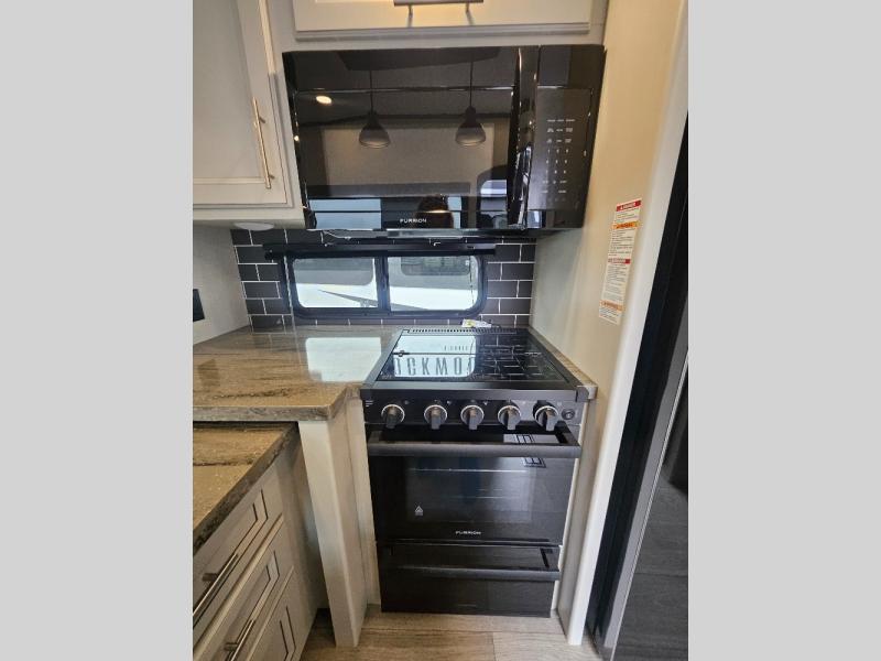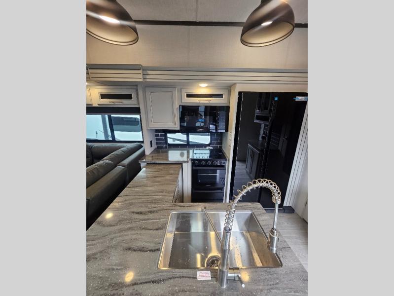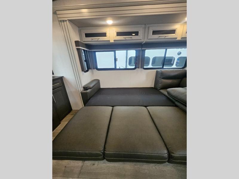 Time at the campground will be spent in comfort thanks to this fifth wheel that can sleep four to six people comfortably. The rear living area/den includes a huge L-shaped sofa with theater seats and a king tri-fold sofa, plus a free-standing dinette with an ottoman on one side, a fireplace, and an LED HDTV for movie nights. The chef of your group will love the additional counter space in the kitchen, along with a 21" Furrion range, plus a pantry and 16 cu. ft. 12V refrigerator. The full bath allows you to clean up each day and the front private bedroom will provide you with your own space at night. Here, you'll find a queen bed slide out that can optioned out for a king bed, plus a full height wardrobe, a second wardrobe with washer and dryer prep, and a dresser with a sliding top and hidden storage for valuables!