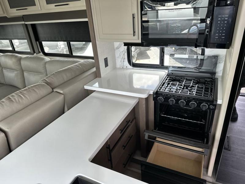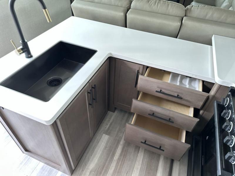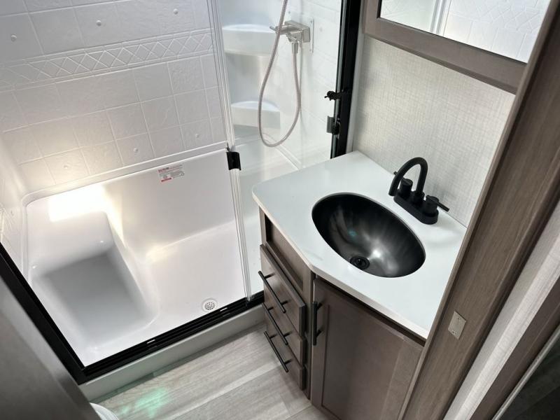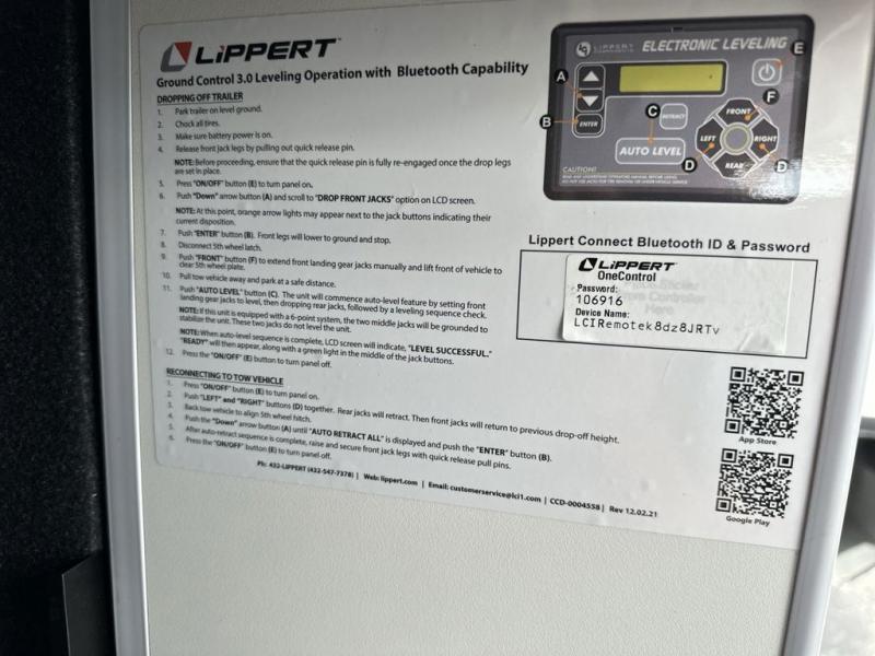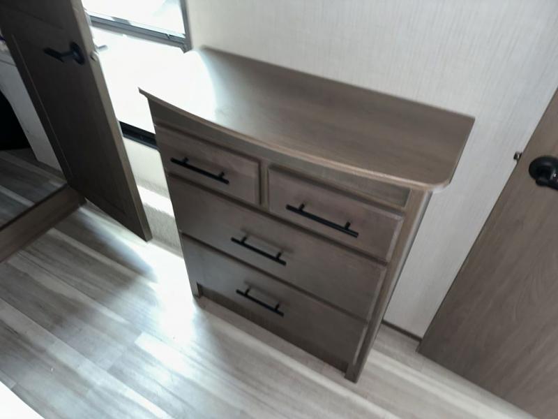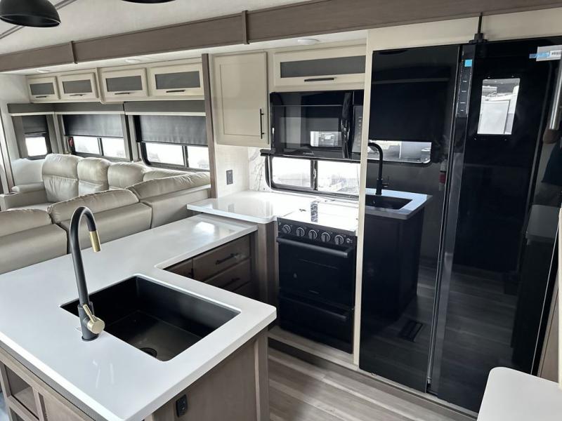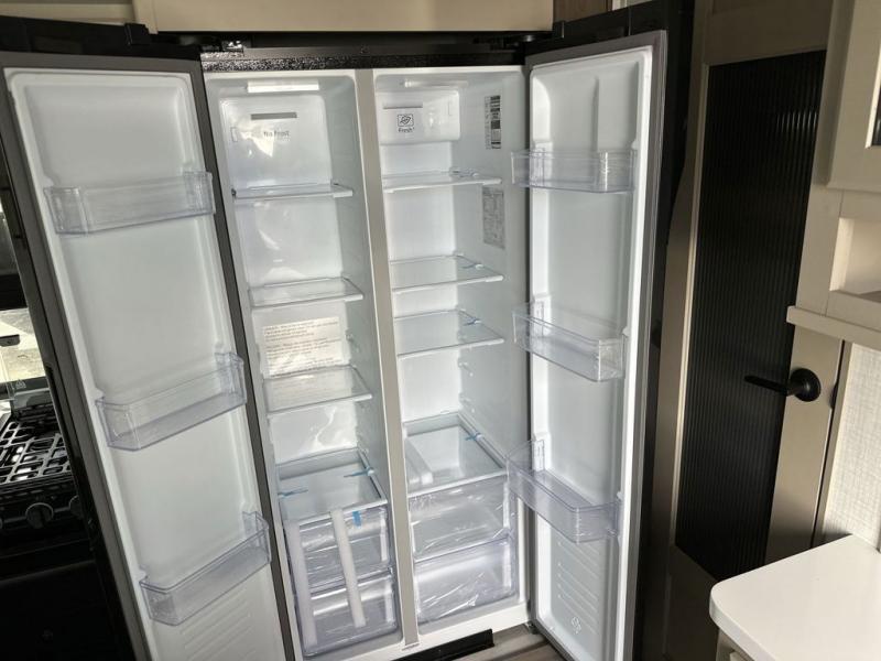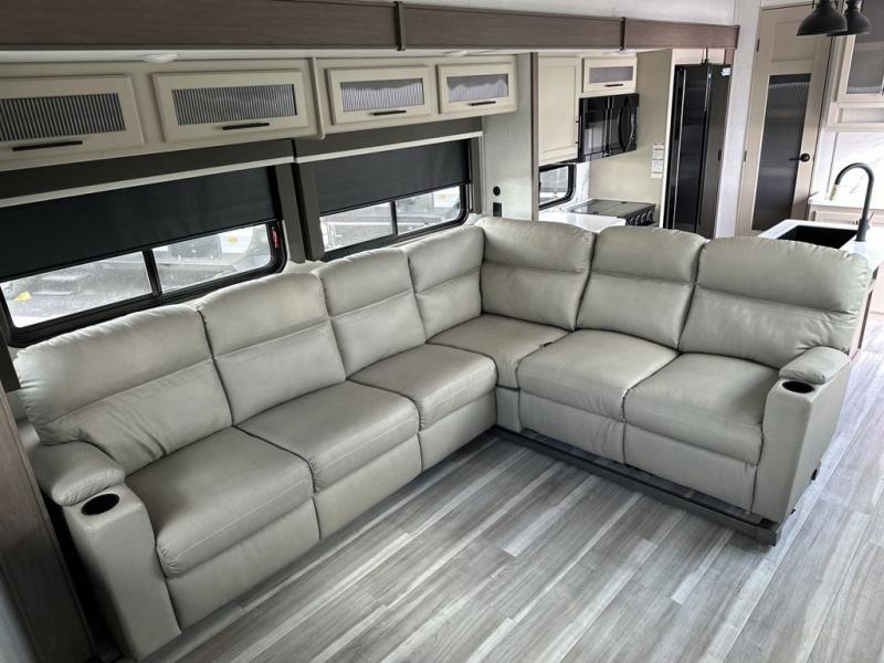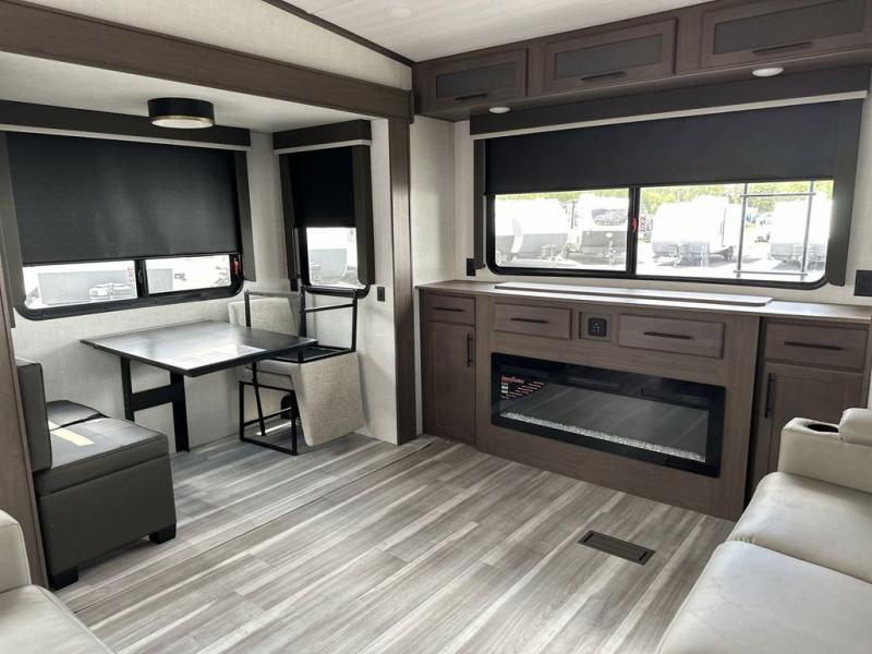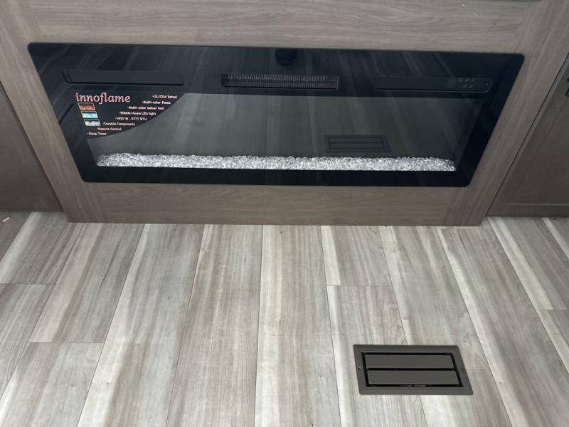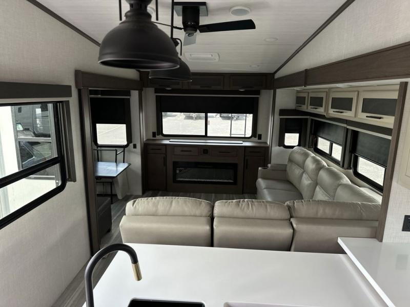 Time at the campground will be spent in comfort thanks to this fifth wheel that can sleep four to six people comfortably. The rear living area/den includes a huge L-shaped sofa with theater seats and a king tri-fold sofa, plus a free-standing dinette with an ottoman on one side, a fireplace, and an LED HDTV for movie nights. The chef of your group will love the additional counter space in the kitchen, along with a 21" Furrion range, plus a pantry and 16 cu. ft. 12V refrigerator. The full bath allows you to clean up each day and the front private bedroom will provide you with your own space at night. Here, you'll find a queen bed slide out that can optioned out for a king bed, plus a full height wardrobe, a second wardrobe with washer and dryer prep, and a dresser with a sliding top and hidden storage for valuables!