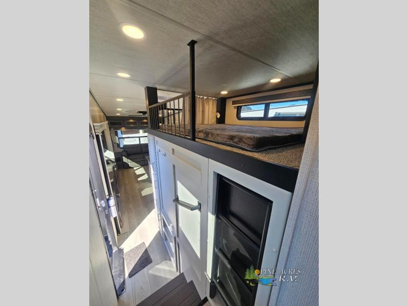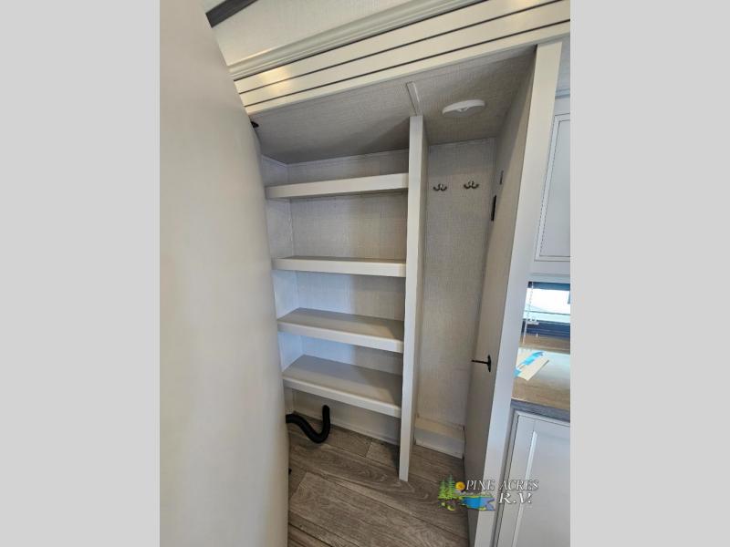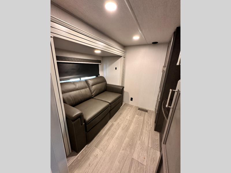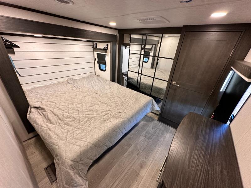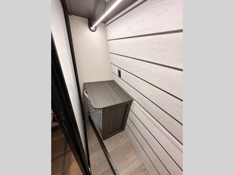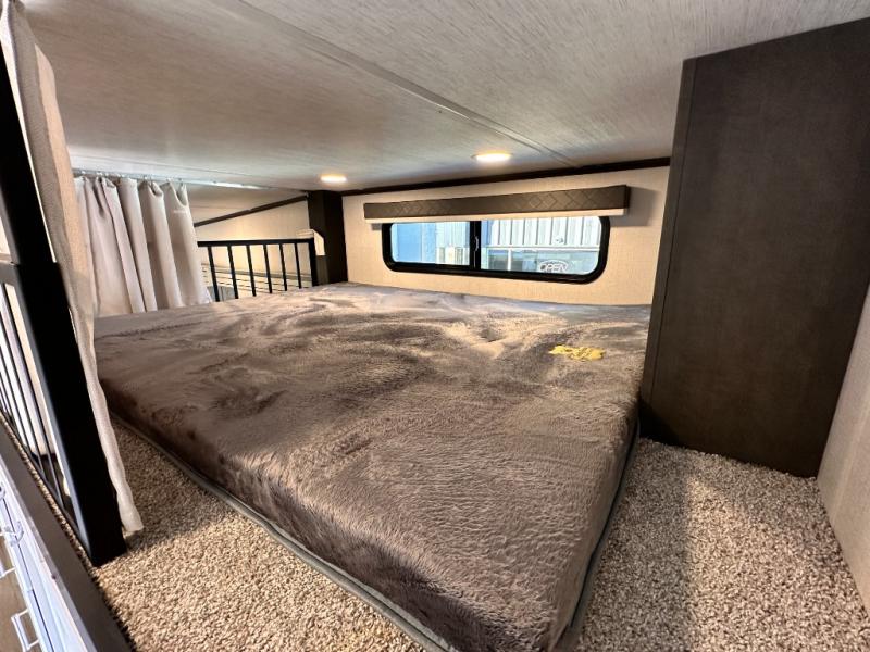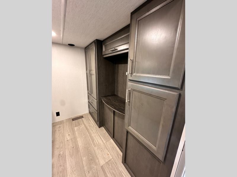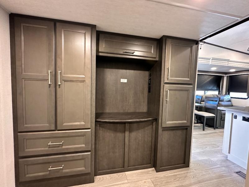 You'll love having an extra room that you can decide what to do with on this Cougar fifth wheel! There is a tri-fold sleeper sofa here, a desk plus two wardrobes for storage. Above this room is a loft which adds more sleeping space without taking up precious interior living space. And speaking of space, you'll find more of it in the main living area when you push out the opposing slides. A second tri-fold sleeper sofa sits in the living area, and there is also theater seating that you can rest on in front of the entertainment center with a hidden pantry and cordless vacuum prep behind. The full bathroom has a linen closet for your towels and washcloths, and there is also great storage in the front private bedroom with the under-bed storage, dresser with a sliding top, and a full-height wardrobe. Outside, you'll find two power awnings, an unobstructed pass-thru storage, and an outdoor kitchen prep area!