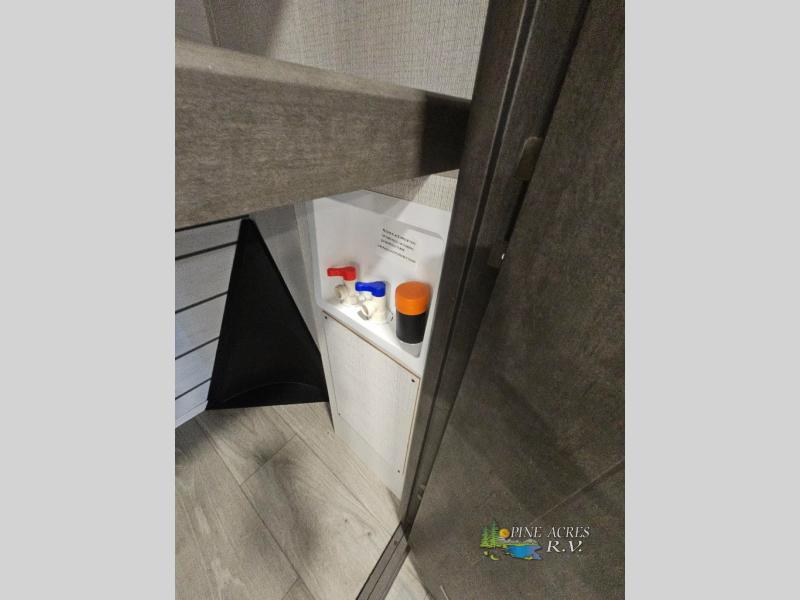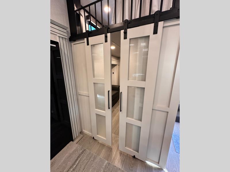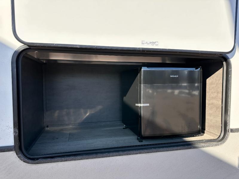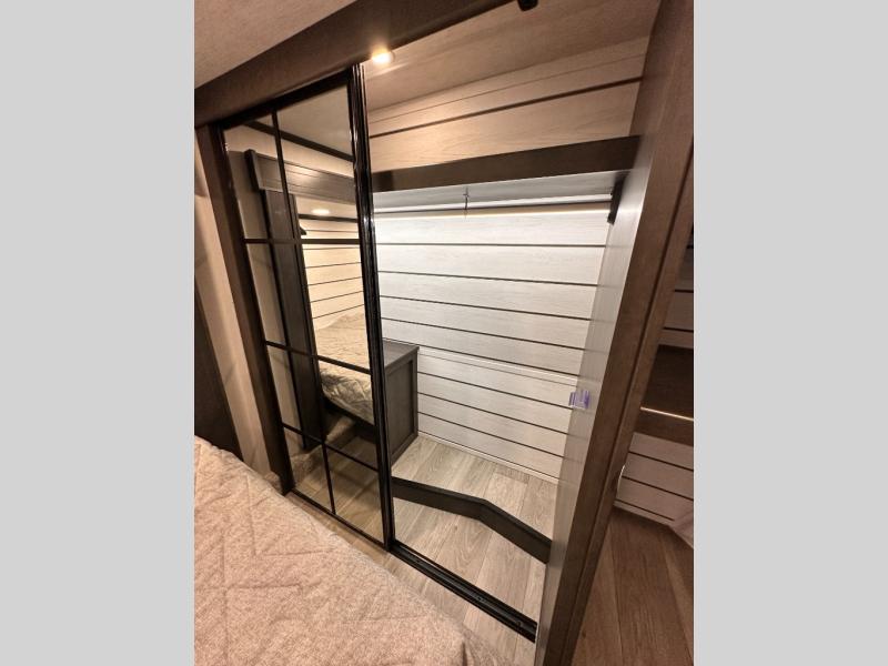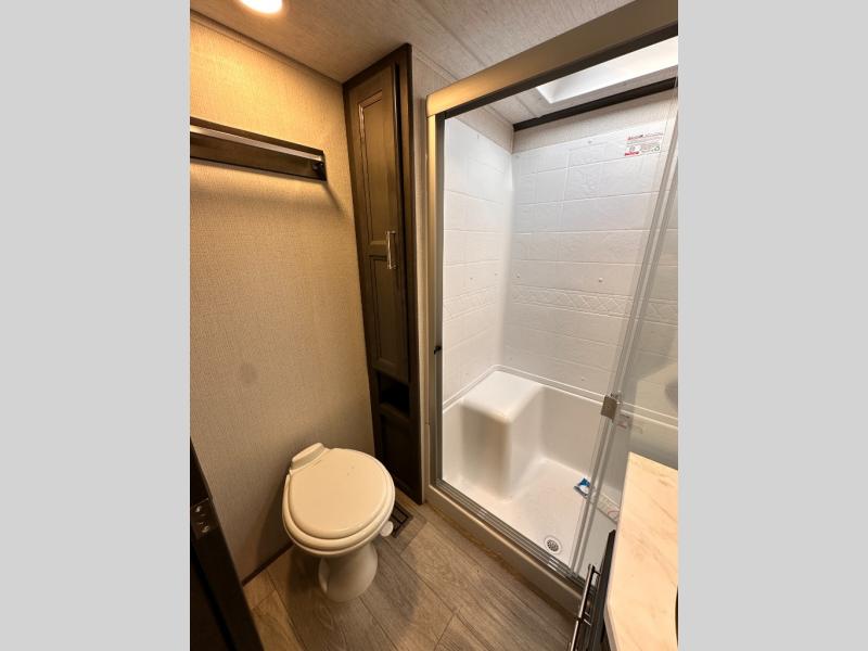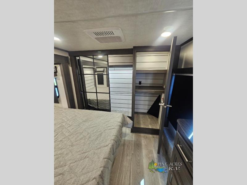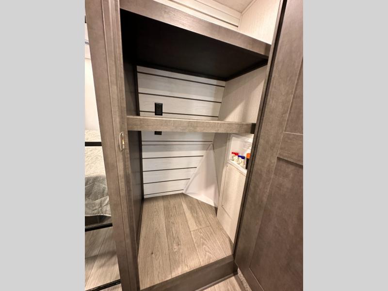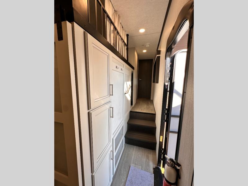 You'll love having an extra room that you can decide what to do with on this Cougar fifth wheel! There is a tri-fold sleeper sofa here, a desk plus two wardrobes for storage. Above this room is a loft which adds more sleeping space without taking up precious interior living space. And speaking of space, you'll find more of it in the main living area when you push out the opposing slides. A second tri-fold sleeper sofa sits in the living area, and there is also theater seating that you can rest on in front of the entertainment center with a hidden pantry and cordless vacuum prep behind. The full bathroom has a linen closet for your towels and washcloths, and there is also great storage in the front private bedroom with the under-bed storage, dresser with a sliding top, and a full-height wardrobe. Outside, you'll find two power awnings, an unobstructed pass-thru storage, and an outdoor kitchen prep area!