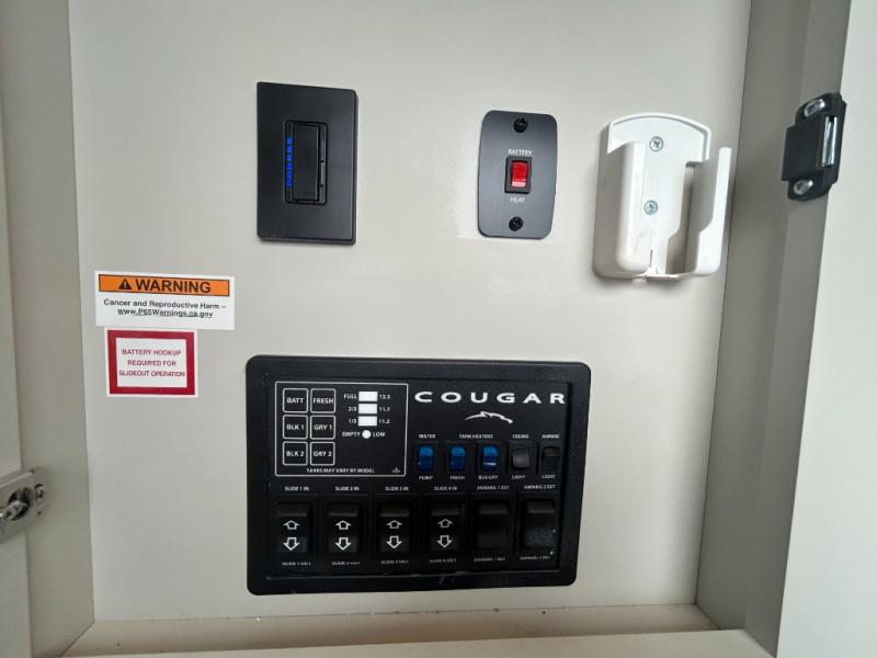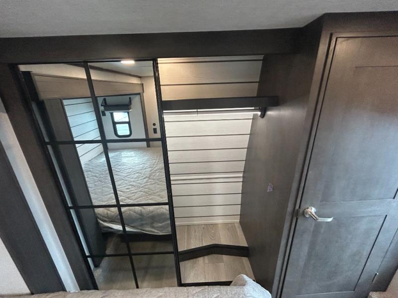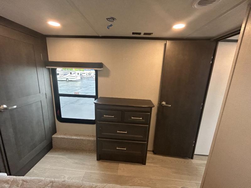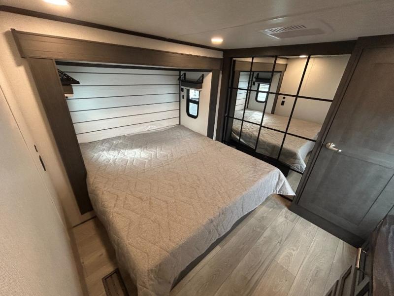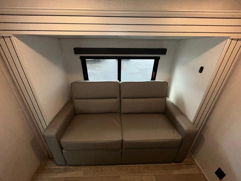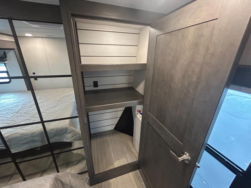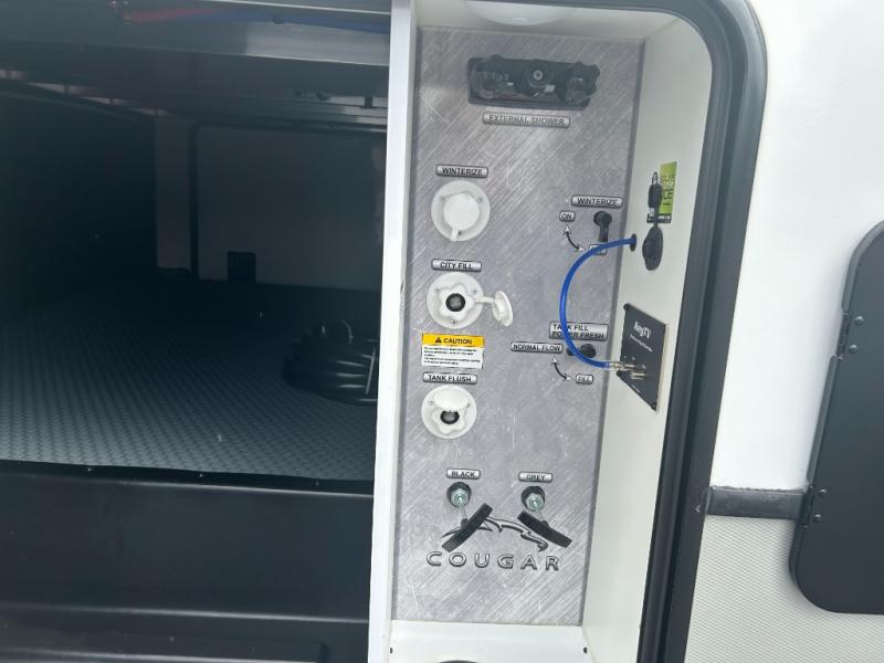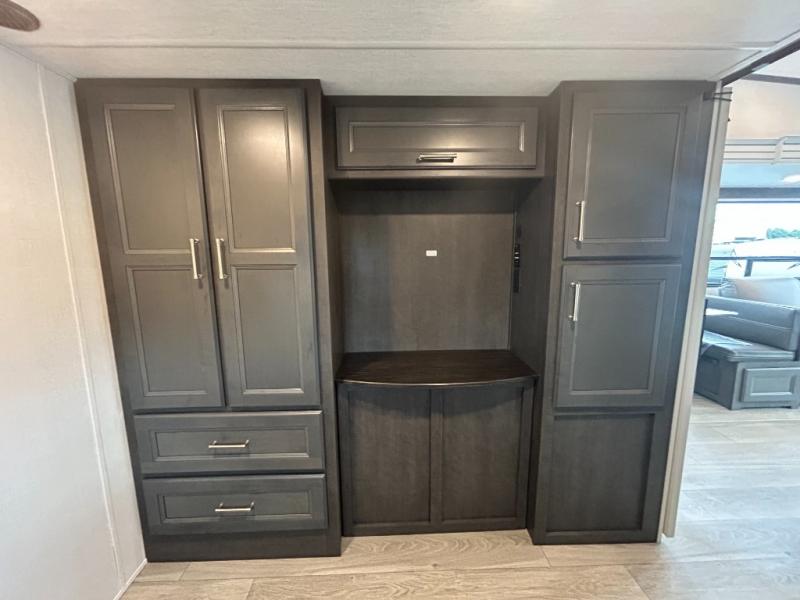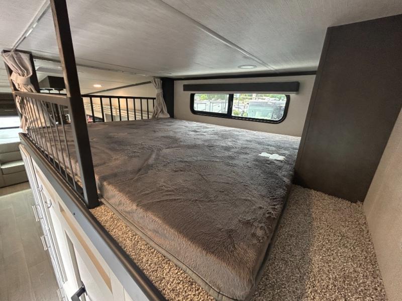 You'll love having an extra room that you can decide what to do with on this Cougar fifth wheel! There is a tri-fold sleeper sofa here, a desk plus two wardrobes for storage. Above this room is a loft which adds more sleeping space without taking up precious interior living space. And speaking of space, you'll find more of it in the main living area when you push out the opposing slides. A second tri-fold sleeper sofa sits in the living area, and there is also theater seating that you can rest on in front of the entertainment center with a hidden pantry and cordless vacuum prep behind. The full bathroom has a linen closet for your towels and washcloths, and there is also great storage in the front private bedroom with the under-bed storage, dresser with a sliding top, and a full-height wardrobe. Outside, you'll find two power awnings, an unobstructed pass-thru storage, and an outdoor kitchen prep area!