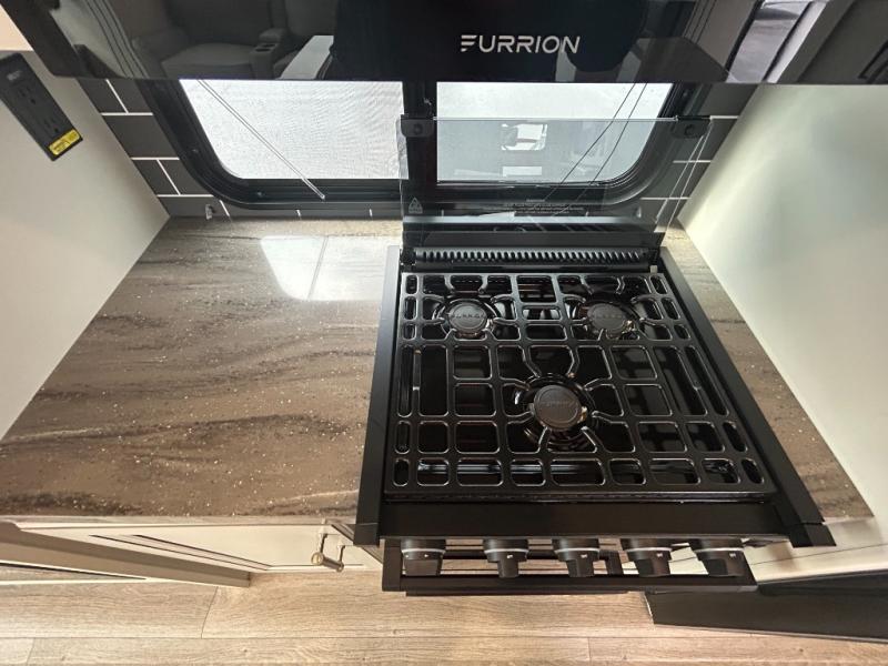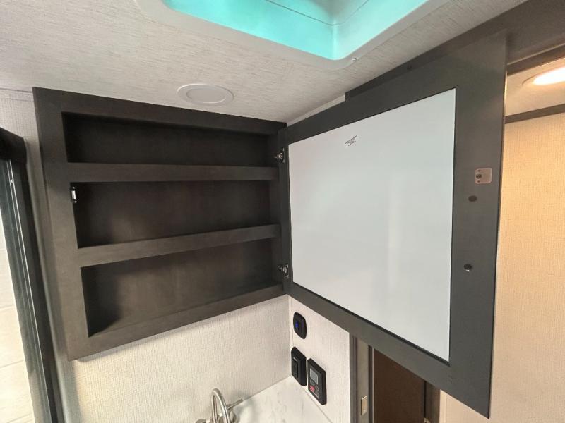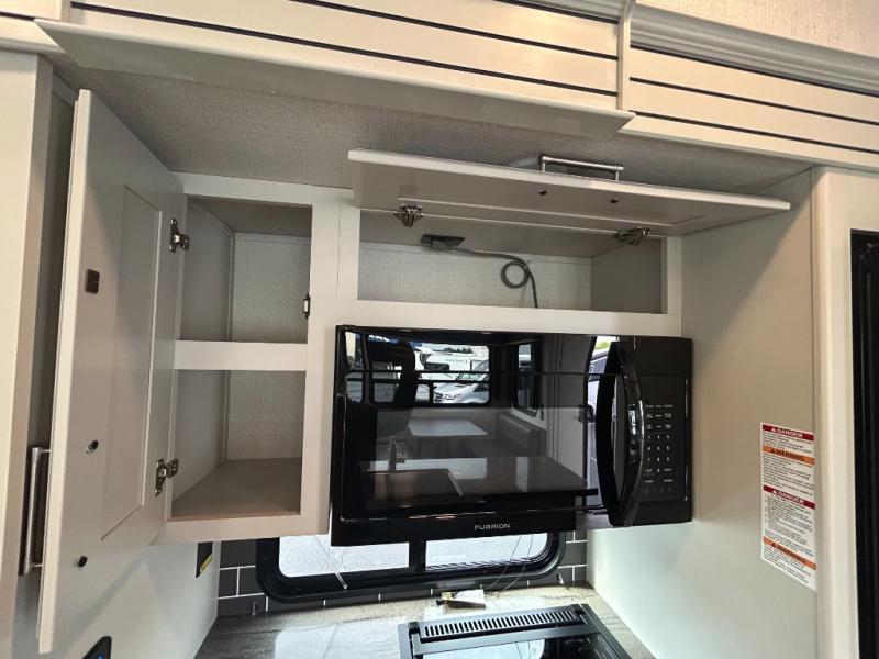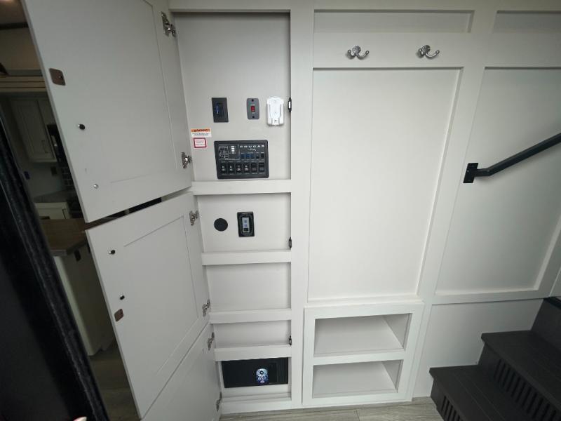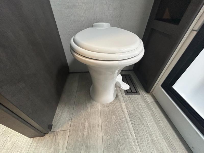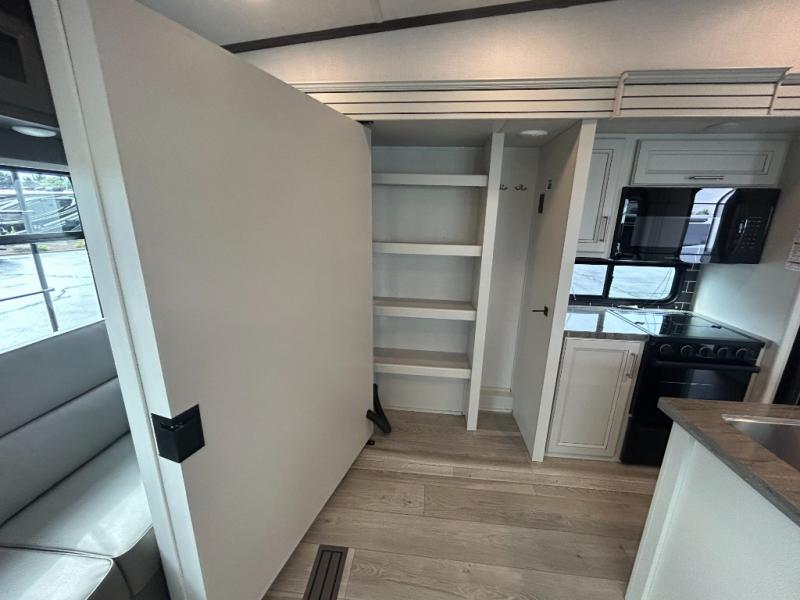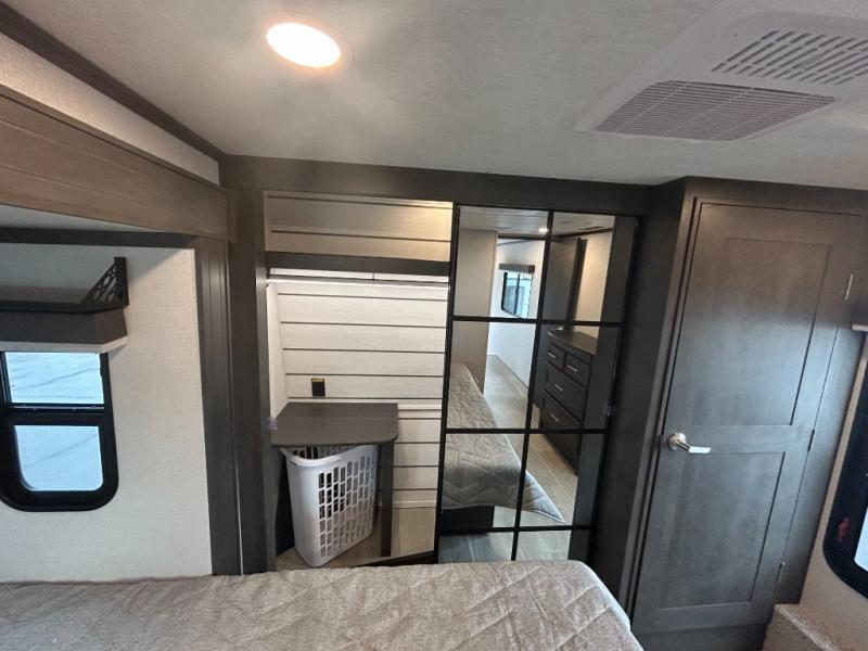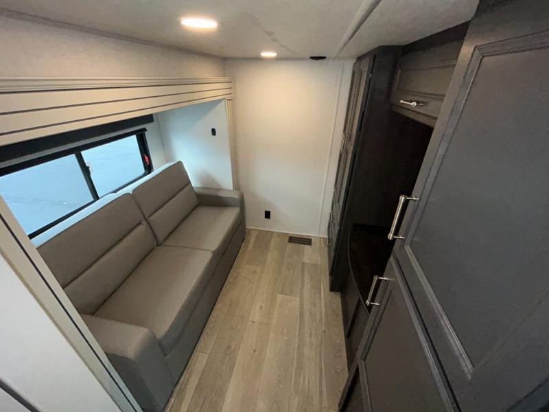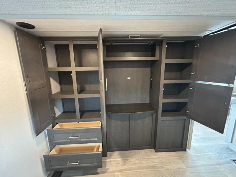 You'll love having an extra room that you can decide what to do with on this Cougar fifth wheel! There is a tri-fold sleeper sofa here, a desk plus two wardrobes for storage. Above this room is a loft which adds more sleeping space without taking up precious interior living space. And speaking of space, you'll find more of it in the main living area when you push out the opposing slides. A second tri-fold sleeper sofa sits in the living area, and there is also theater seating that you can rest on in front of the entertainment center with a hidden pantry and cordless vacuum prep behind. The full bathroom has a linen closet for your towels and washcloths, and there is also great storage in the front private bedroom with the under-bed storage, dresser with a sliding top, and a full-height wardrobe. Outside, you'll find two power awnings, an unobstructed pass-thru storage, and an outdoor kitchen prep area!