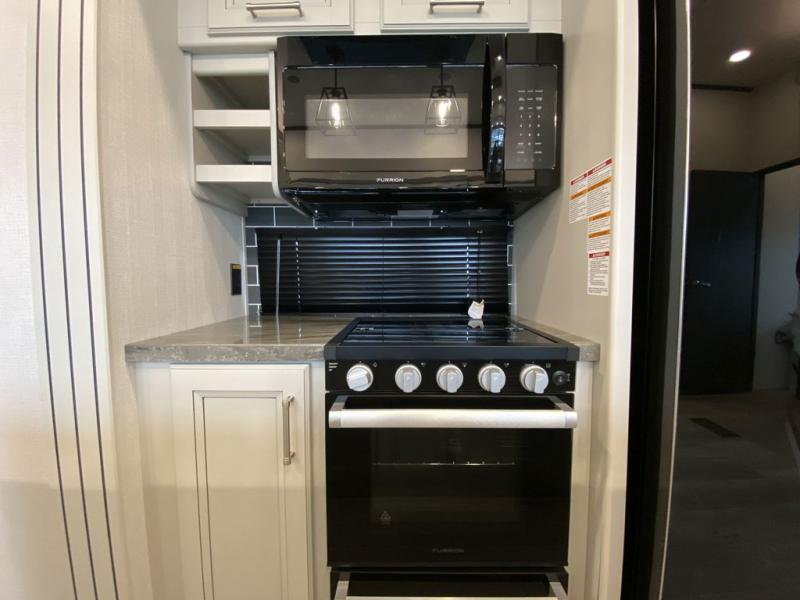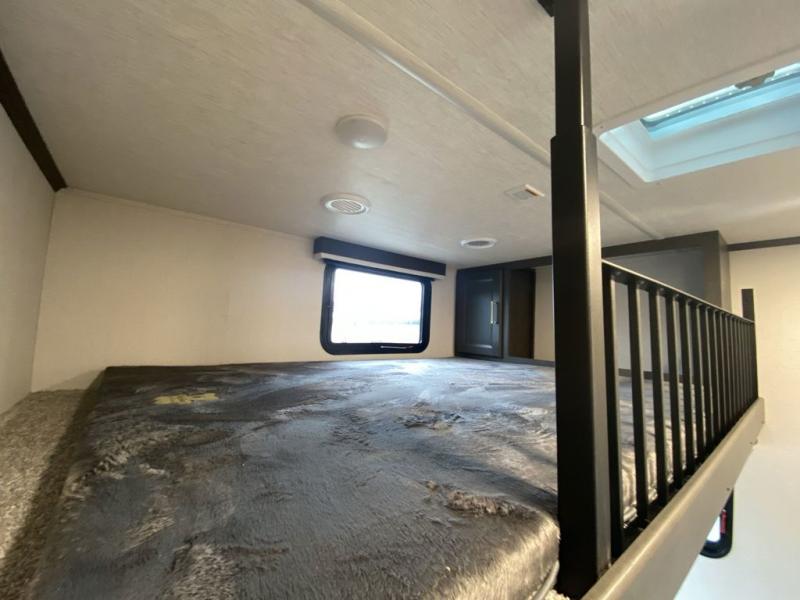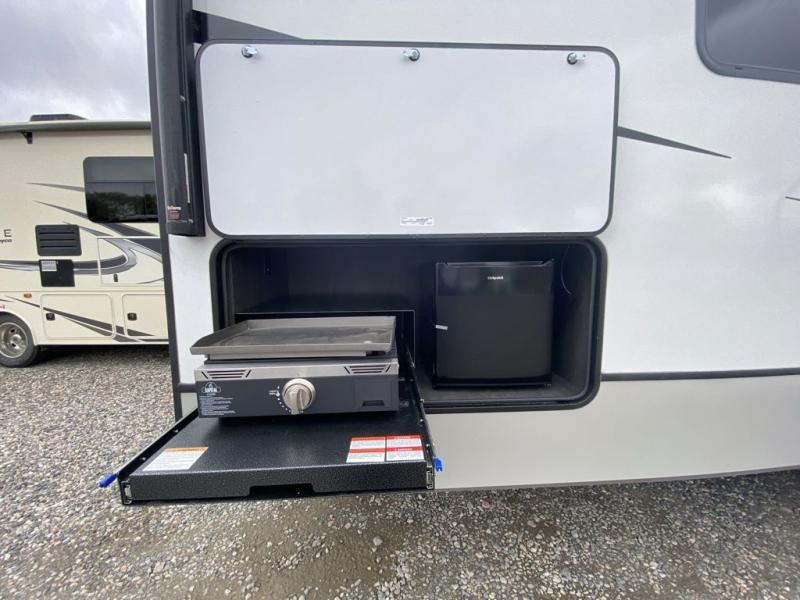 You'll want to pounce on this Cougar fifth wheel because of its amazing sleeping accommodations! Not only is there a master suite up front, but there is also a bedroom suite in the back. This rear suite has a 54" x 74" bed with a 54" x 74" loft bed above it. Plus, the second exterior entry door leads into the half bathroom, so you can exit the fifth wheel from this rear bedroom too. When you do exit, you'll be right next to the outdoor kitchen with a griddle and mini refrigerator, and the two 12' power awnings will protect you while you're outside. A 68" tri-fold sleeper sofa and booth dinette adds more sleeping space, and it also gives you a comfortable place to watch the LED HDTV at night. A kitchen island will be helpful to use while you're cooking, and the 16 cu. ft. 12V refrigerator will hold perishables for the whole week!