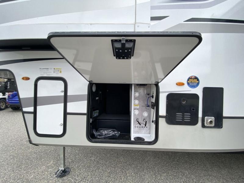 Spend more time having fun and less time worrying about your RV with the Keystone Cougar fifth wheel! These units have all that you will need for excellent vacations. The interior comes with 5/8" one-piece DynaSpan® flooring, tall slide outs for added comfort and head room, night roller shades throughout, and residential, raised-panel hardwood cabinet doors and drawers. You will also enjoy decorative crown molding, a 5,500 BTU electric fireplace with thermostat control and remote, and a Max Air exhaust fan with rain sensor. The exterior is also fully outfitted with a convenience center, friction-hinge entry door, electric four-point auto leveling system, and Lippert SolidStep® on the main entry. Each model is available with the optional Hero Edition. By choosing this edition, you can help support our nation's heros and their families by contributing to the Wounded Warrior Project. This optional package features an industry exclusive full-body paint matte finish, frameless windows, a glass entry door, blackout rims, and green LED exterior accent lighting; see dealer for more details!