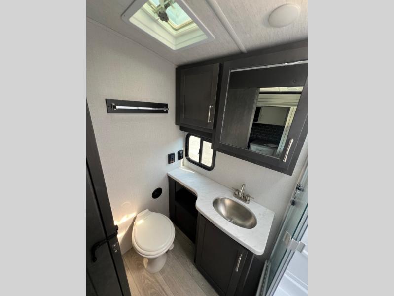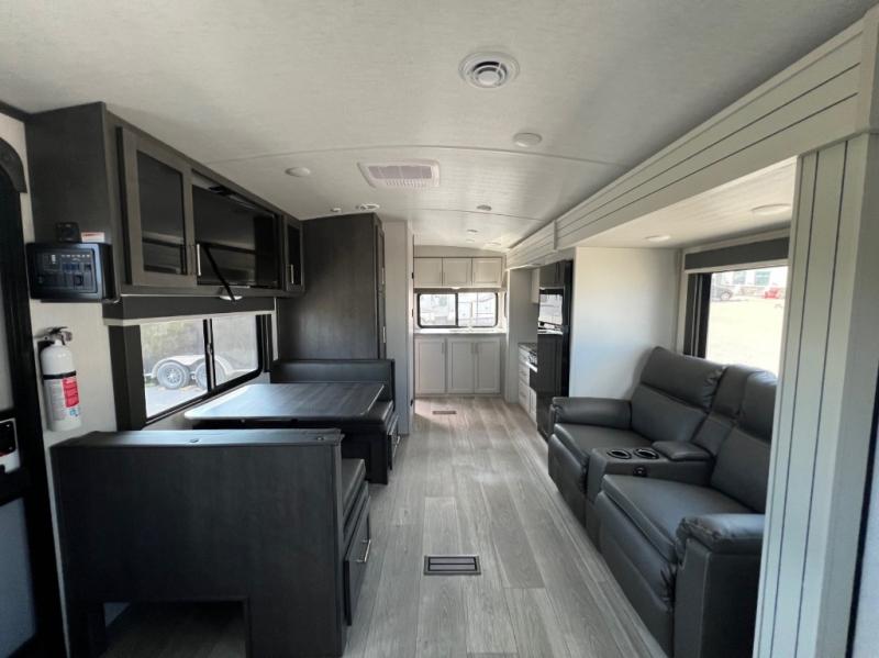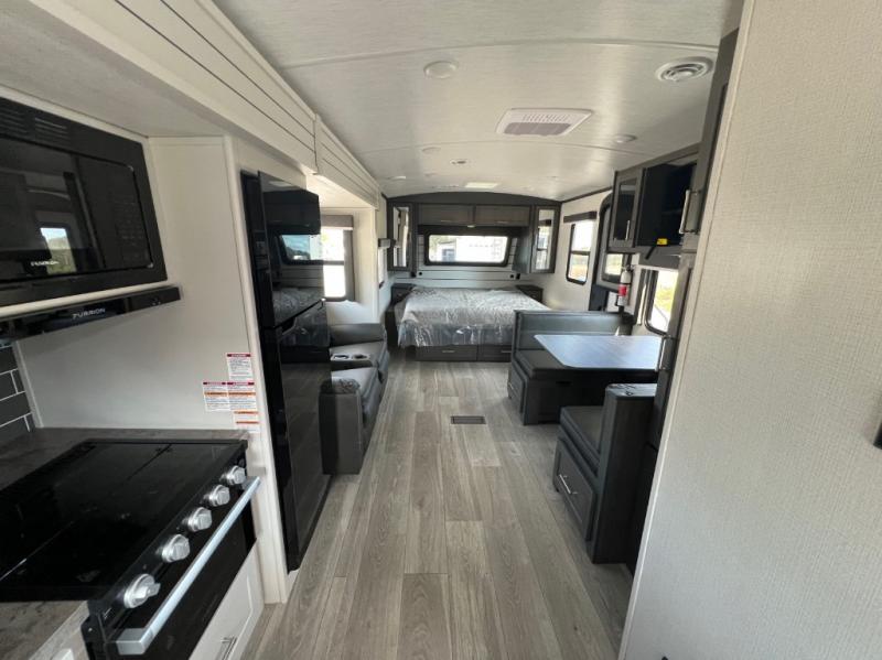 With a king-size bed, this Cougar Half-Ton travel trailer shows that you can still be comfortable even while you're away from home! The bed has wardrobes and nightstands on either side to keep your belongings tidy. There is a convenient shoe cubby right as you enter the unit to keep this space picked up as well. Right next to the booth dinette is the pantry, and next to the pantry is the full bathroom which is certainly one of the most valuable features to any trailer.