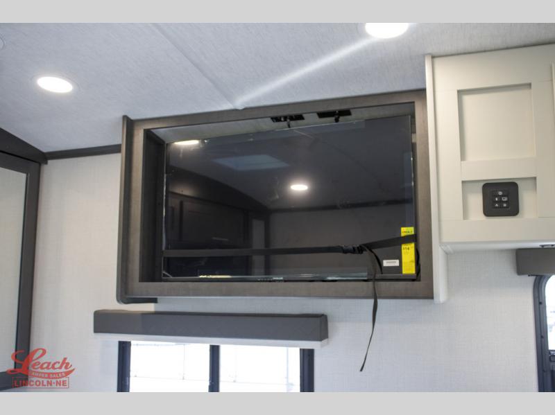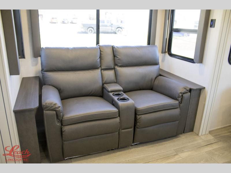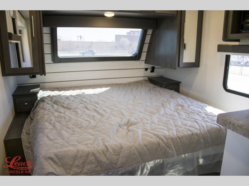 Imagine waking up from your own king bed to enjoy a hike, a bike ride, or a relaxing time outside under the 16' power awning while you wait for your spouse to wake up. With this Cougar Half-Ton travel trailer, you can make breakfast inside with full amenities and eat at the U-shaped dinette while looking out at the views. There is even a bar top where you can set out more snacks and have more prep space. The front bedroom includes a king bed, dual wardrobes and dual nightstands, plus a TV for movie night.