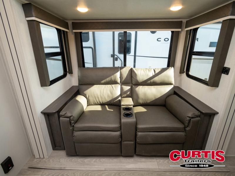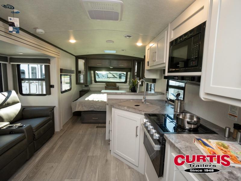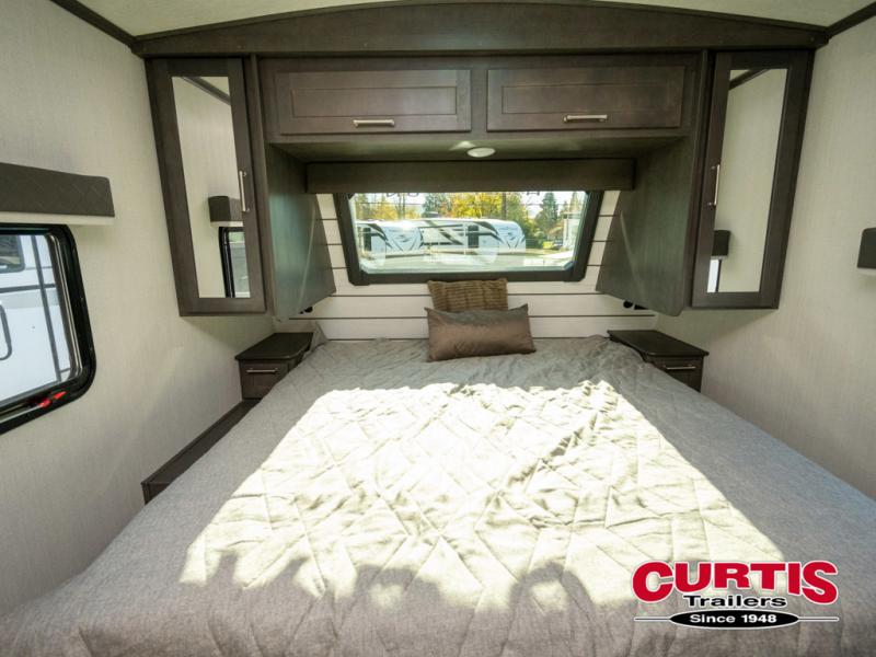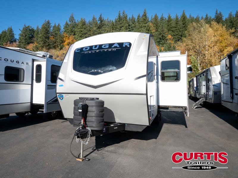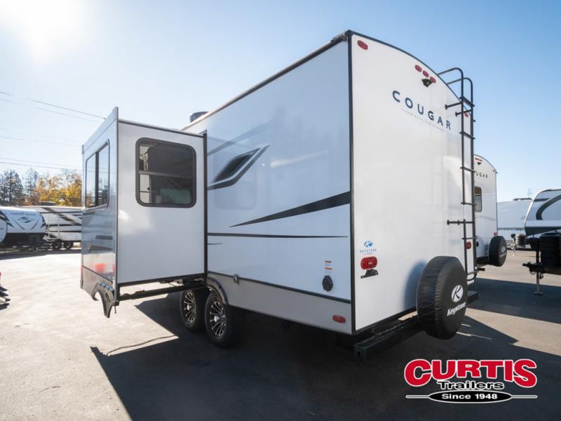 Imagine waking up from your own king bed to enjoy a hike, a bike ride, or a relaxing time outside under the 16' power awning while you wait for your spouse to wake up. With this Cougar Half-Ton travel trailer, you can make breakfast inside with full amenities and eat at the U-shaped dinette while looking out at the views. You will be able to get cleaned up in the full bathroom without having to wait your turn for the public facilities. The front bedroom includes a king bed with dual wardrobes and nightstands, and there is a bar top in the kitchen for a little more counter space!