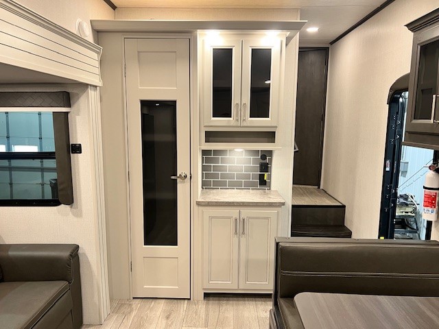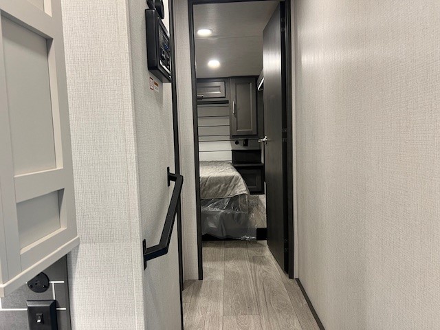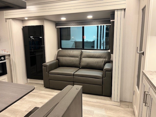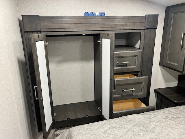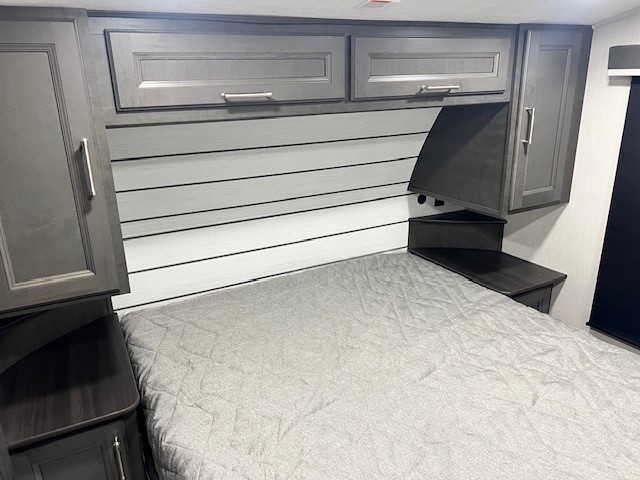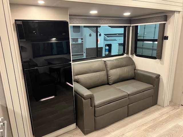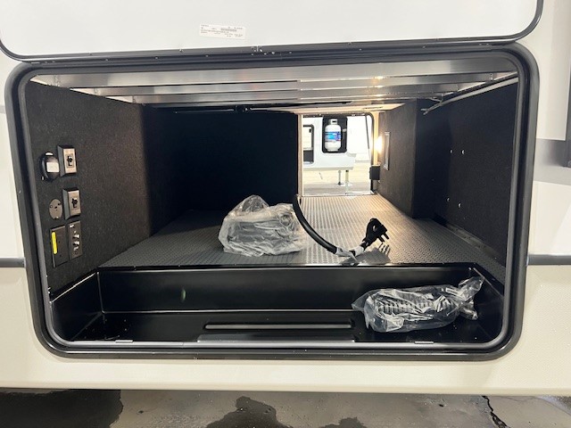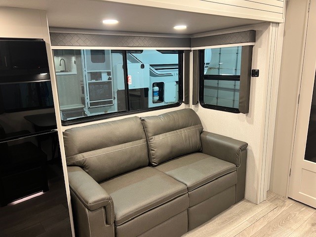 If you are looking for a fifth wheel that sleeps four to six with inside and outside cooking then check this unit out! This unit offers a short, mid-living layout with a bedroom wardrobe slide and combined 12 volt refrigerator and 68" tri-fold sofa sleeper slide for added floorspace to move about. Up front, you will enjoy a private bedroom with a queen bed and bedside wardrobe/nightstands as well as a larger wardrobe that slides out along the curbside wall. A complete bath provides a large shower, toilet and sink, plus linen storage which you are sure to appreciate as you travel. There are plenty of options for this unit making it easy to customize to your use and style. The theater seating and free standing dinette options can be selected in place of the sleeper sofa and booth dinette if you prefer. If you enjoy spending time outdoors, imagine making breakfast for your friends and family using the outside griddle. There is also a 16' awning to create even more living space to enjoy, and the unobstructed pass-through storage compartment can easily house all of your outdoor camping gear like lawn chairs and yard games.