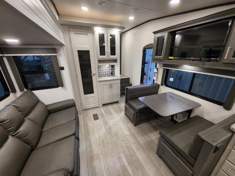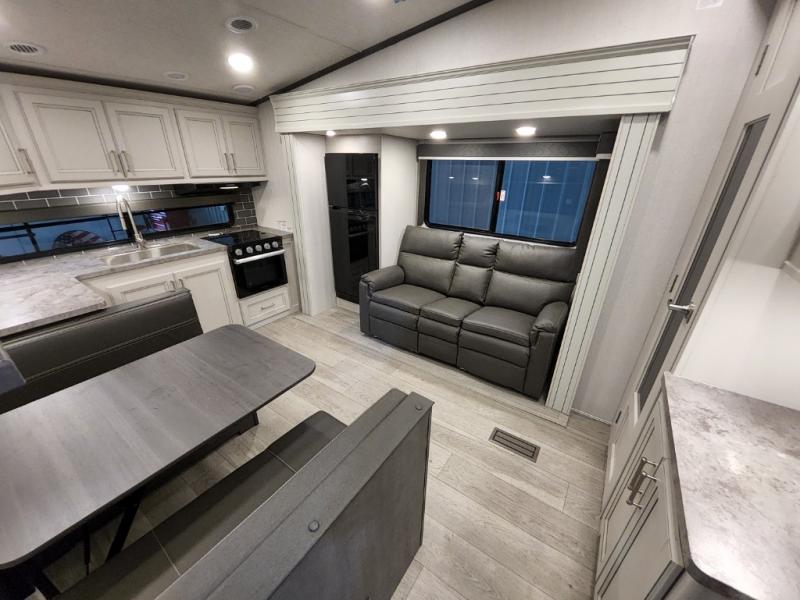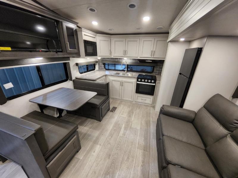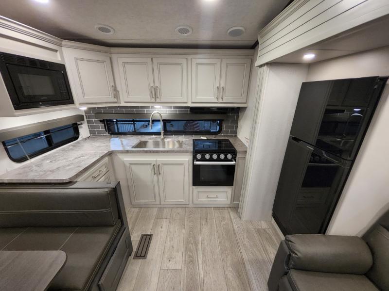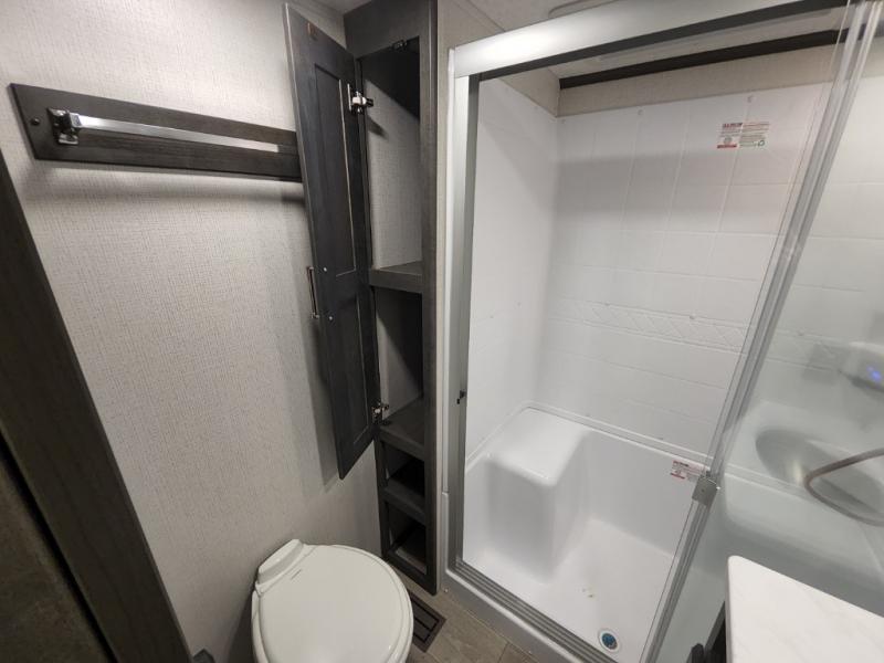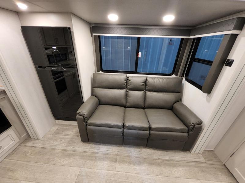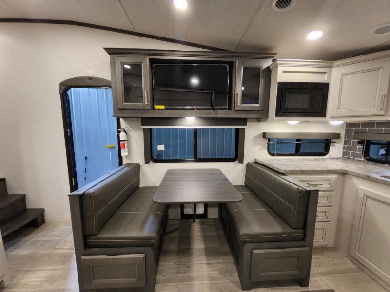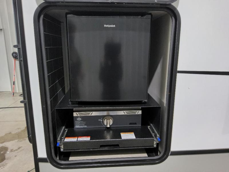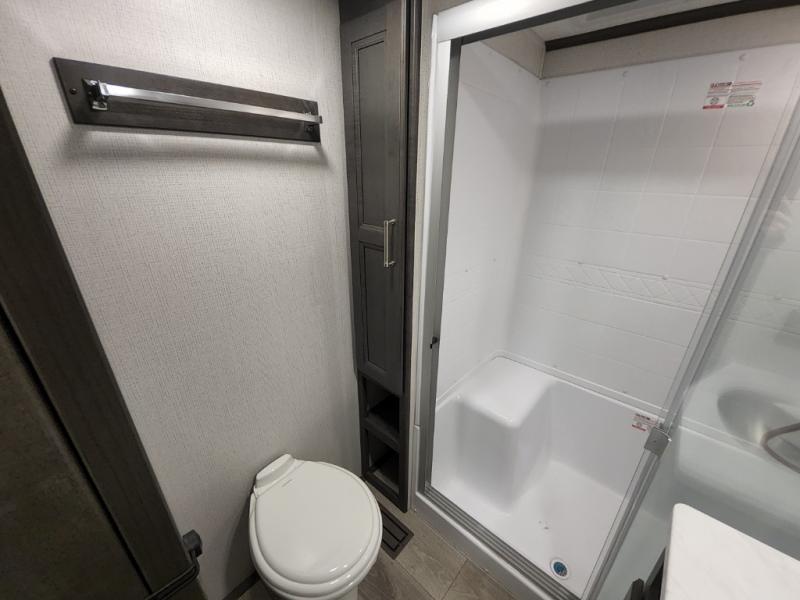 If you are looking for a fifth wheel that sleeps four to six with inside and outside cooking then check this unit out! This unit offers a short, mid-living layout with a bedroom wardrobe slide and combined 12 volt refrigerator and 68" tri-fold sofa sleeper slide for added floorspace to move about. Up front, you will enjoy a private bedroom with a queen bed and bedside wardrobe/nightstands as well as a larger wardrobe that slides out along the curbside wall. A complete bath provides a large shower, toilet and sink, plus linen storage which you are sure to appreciate as you travel. There are plenty of options for this unit making it easy to customize to your use and style. The theater seating and free standing dinette options can be selected in place of the sleeper sofa and booth dinette if you prefer. If you enjoy spending time outdoors, imagine making breakfast for your friends and family using the outside griddle. There is also a 16' awning to create even more living space to enjoy, and the unobstructed pass-through storage compartment can easily house all of your outdoor camping gear like lawn chairs and yard games.