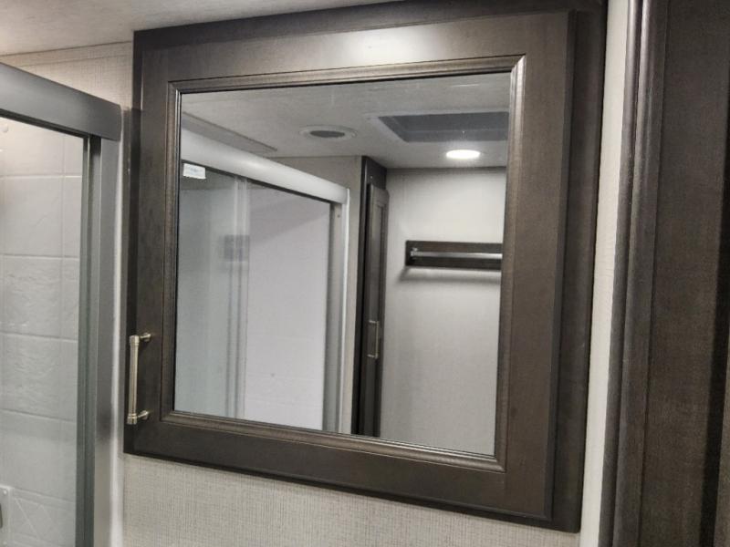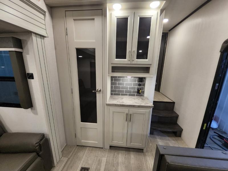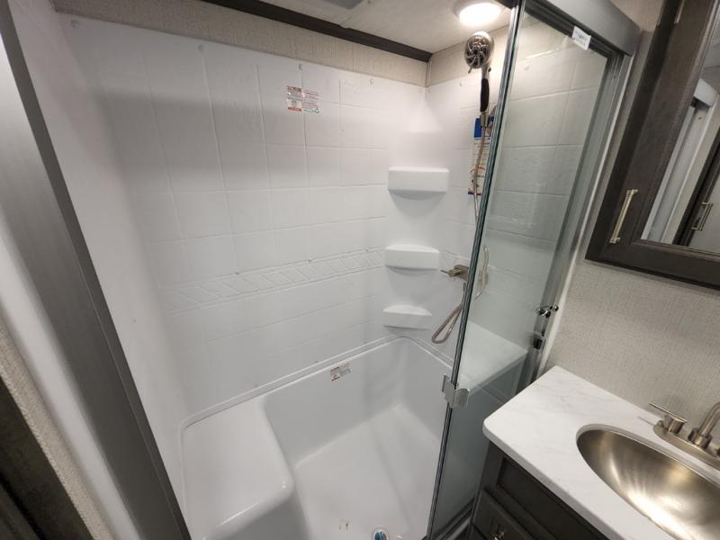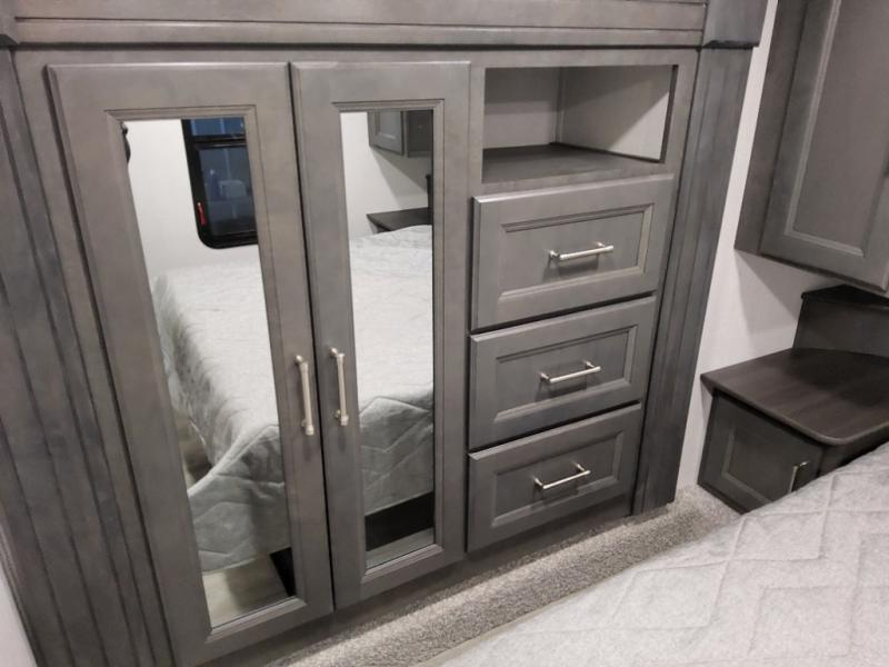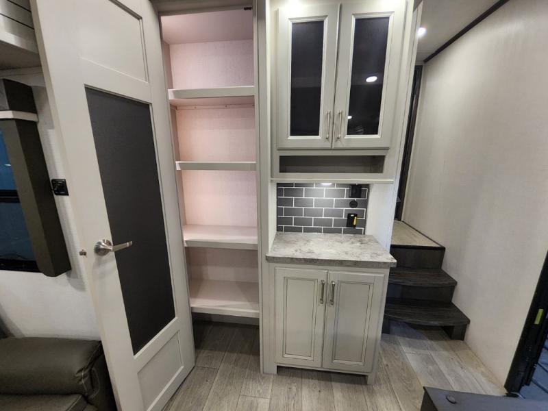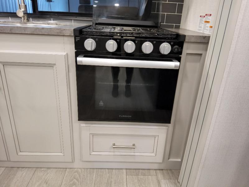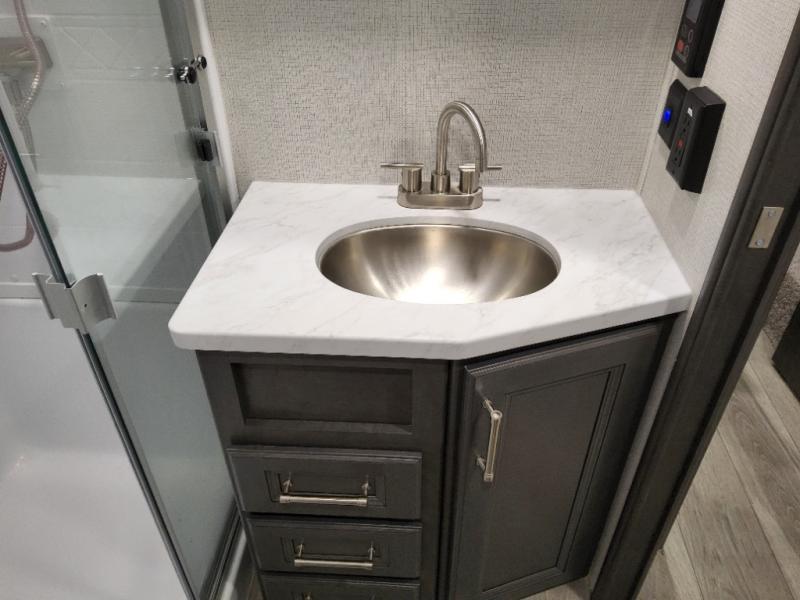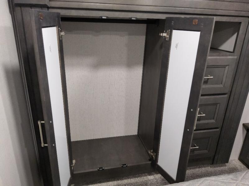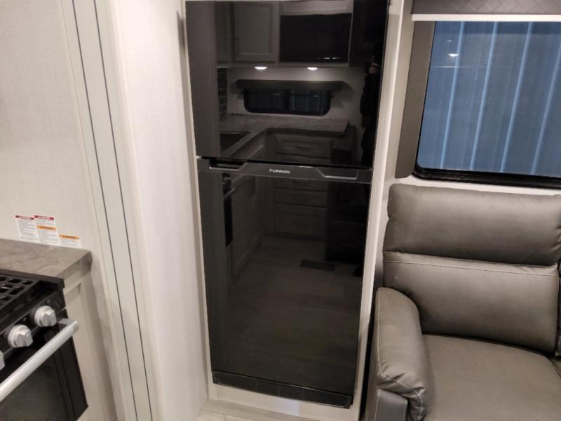 If you are looking for a fifth wheel that sleeps four to six with inside and outside cooking then check this unit out! This unit offers a short, mid-living layout with a bedroom wardrobe slide and combined 12 volt refrigerator and 68" tri-fold sofa sleeper slide for added floorspace to move about. Up front, you will enjoy a private bedroom with a queen bed and bedside wardrobe/nightstands as well as a larger wardrobe that slides out along the curbside wall. A complete bath provides a large shower, toilet and sink, plus linen storage which you are sure to appreciate as you travel. There are plenty of options for this unit making it easy to customize to your use and style. The theater seating and free standing dinette options can be selected in place of the sleeper sofa and booth dinette if you prefer. If you enjoy spending time outdoors, imagine making breakfast for your friends and family using the outside griddle. There is also a 16' awning to create even more living space to enjoy, and the unobstructed pass-through storage compartment can easily house all of your outdoor camping gear like lawn chairs and yard games.