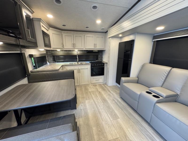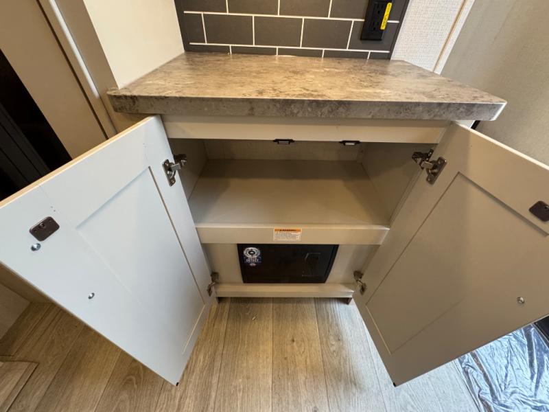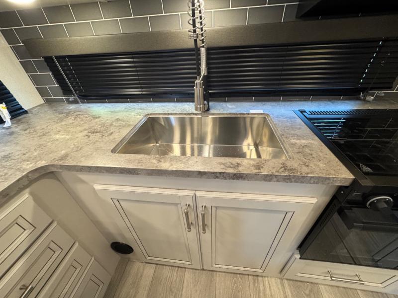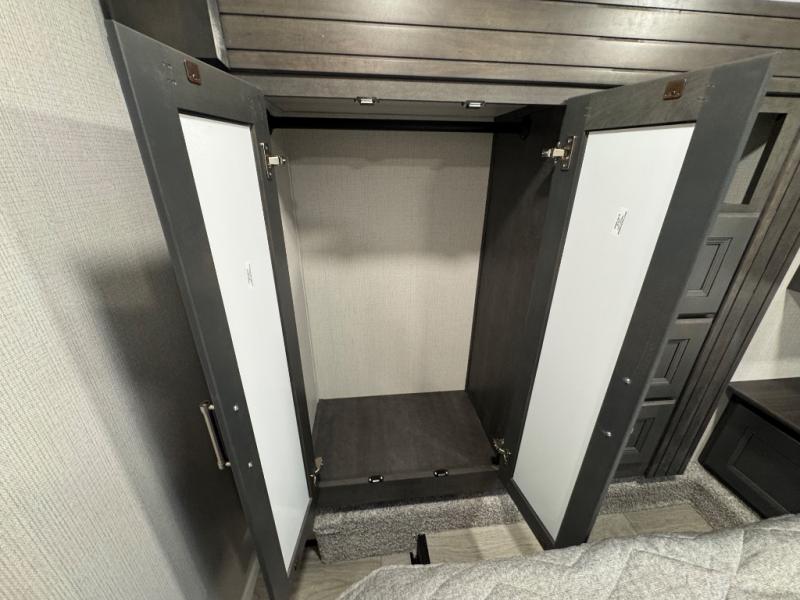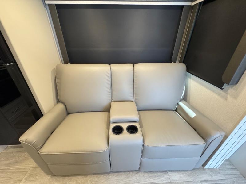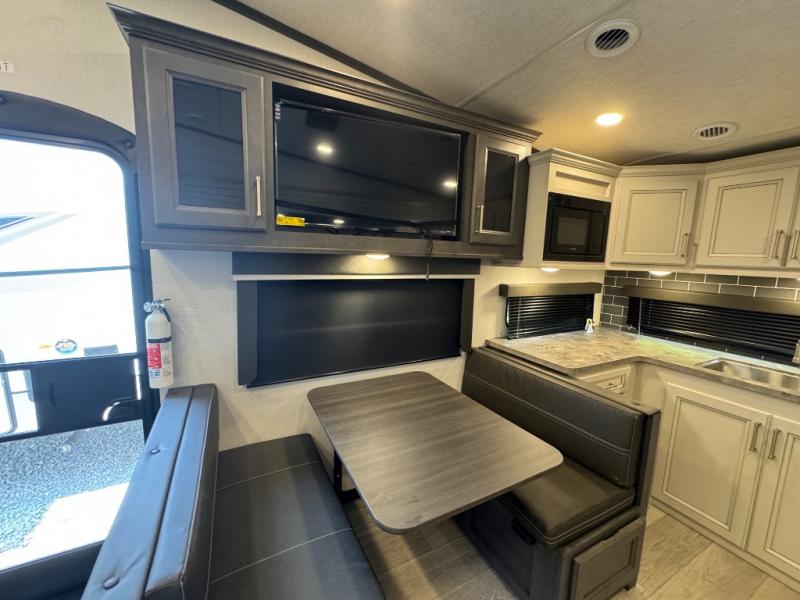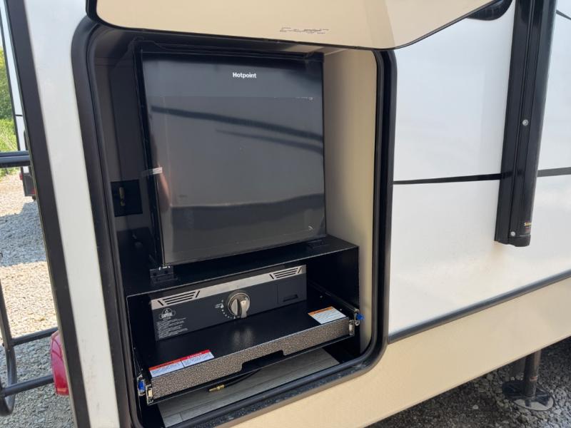 If you are looking for a fifth wheel that sleeps four to six with inside and outside cooking then check this unit out! This unit offers a short, mid-living layout with a bedroom wardrobe slide and combined 12 volt refrigerator and 68" tri-fold sofa sleeper slide for added floorspace to move about. Up front, you will enjoy a private bedroom with a queen bed and bedside wardrobe/nightstands as well as a larger wardrobe that slides out along the curbside wall. A complete bath provides a large shower, toilet and sink, plus linen storage which you are sure to appreciate as you travel. There are plenty of options for this unit making it easy to customize to your use and style. The theater seating and free standing dinette options can be selected in place of the sleeper sofa and booth dinette if you prefer. If you enjoy spending time outdoors, imagine making breakfast for your friends and family using the outside griddle. There is also a 16' awning to create even more living space to enjoy, and the unobstructed pass-through storage compartment can easily house all of your outdoor camping gear like lawn chairs and yard games.