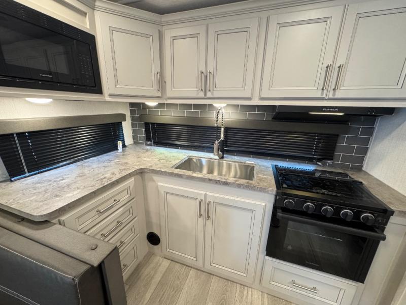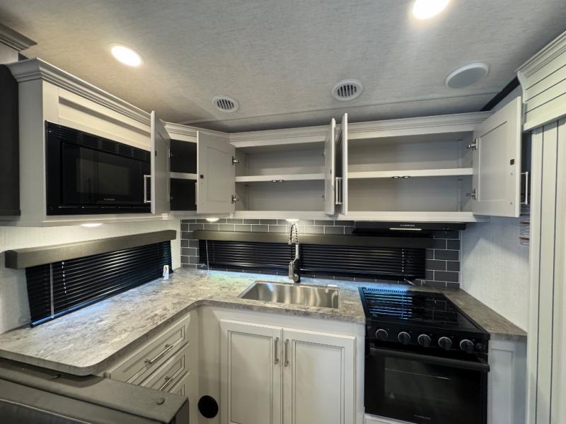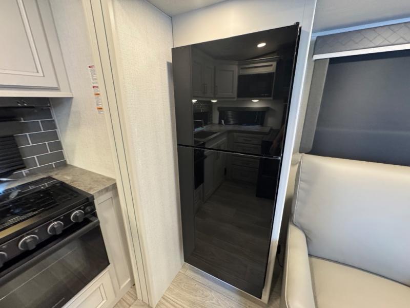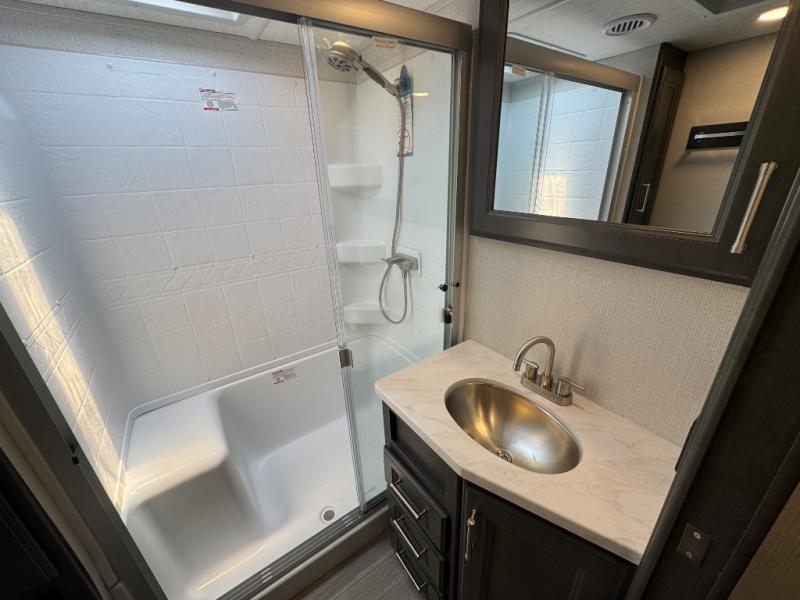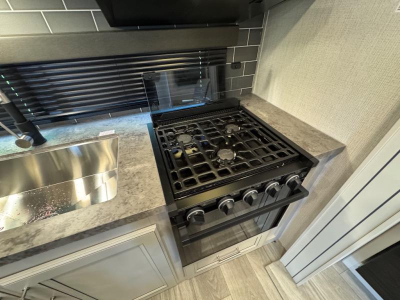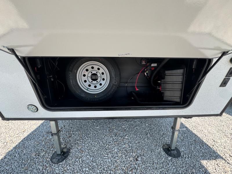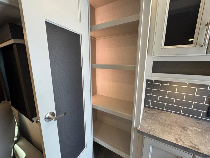 If you are looking for a fifth wheel that sleeps four to six with inside and outside cooking then check this unit out! This unit offers a short, mid-living layout with a bedroom wardrobe slide and combined 12 volt refrigerator and 68" tri-fold sofa sleeper slide for added floorspace to move about. Up front, you will enjoy a private bedroom with a queen bed and bedside wardrobe/nightstands as well as a larger wardrobe that slides out along the curbside wall. A complete bath provides a large shower, toilet and sink, plus linen storage which you are sure to appreciate as you travel. There are plenty of options for this unit making it easy to customize to your use and style. The theater seating and free standing dinette options can be selected in place of the sleeper sofa and booth dinette if you prefer. If you enjoy spending time outdoors, imagine making breakfast for your friends and family using the outside griddle. There is also a 16' awning to create even more living space to enjoy, and the unobstructed pass-through storage compartment can easily house all of your outdoor camping gear like lawn chairs and yard games.