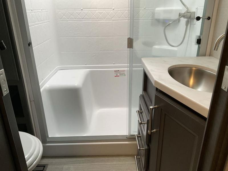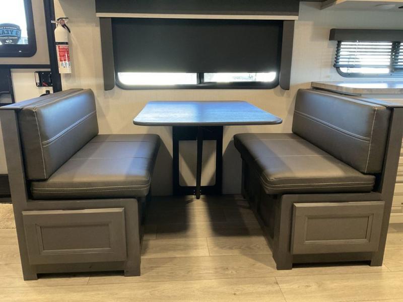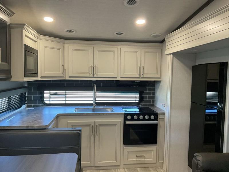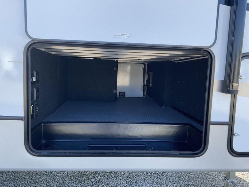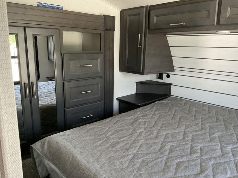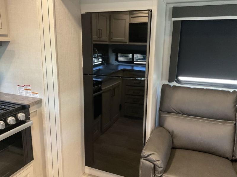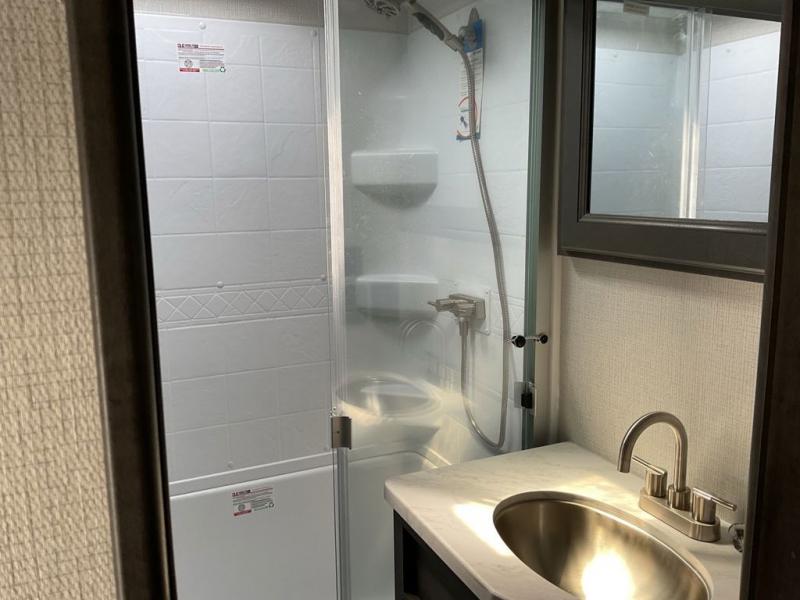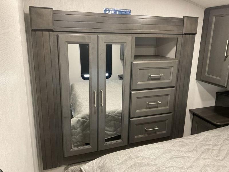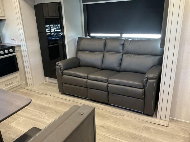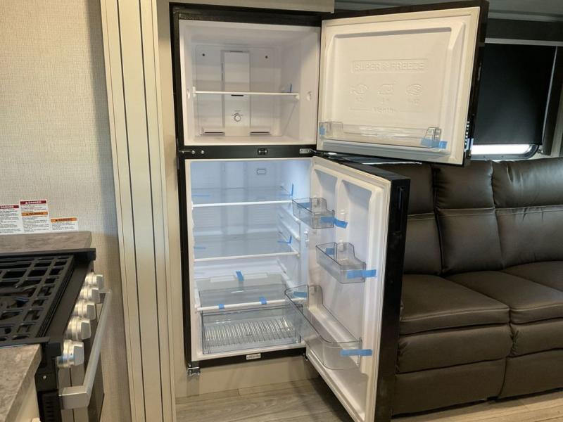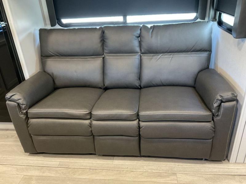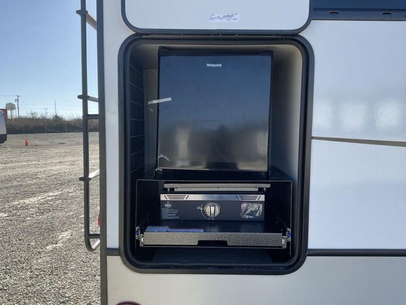 If you are looking for a fifth wheel that sleeps four to six with inside and outside cooking then check this unit out! This unit offers a short, mid-living layout with a bedroom wardrobe slide and combined 12 volt refrigerator and 68" tri-fold sofa sleeper slide for added floorspace to move about. Up front, you will enjoy a private bedroom with a queen bed and bedside wardrobe/nightstands as well as a larger wardrobe that slides out along the curbside wall. A complete bath provides a large shower, toilet and sink, plus linen storage which you are sure to appreciate as you travel. There are plenty of options for this unit making it easy to customize to your use and style. The theater seating and free standing dinette options can be selected in place of the sleeper sofa and booth dinette if you prefer. If you enjoy spending time outdoors, imagine making breakfast for your friends and family using the outside griddle. There is also a 16' awning to create even more living space to enjoy, and the unobstructed pass-through storage compartment can easily house all of your outdoor camping gear like lawn chairs and yard games.