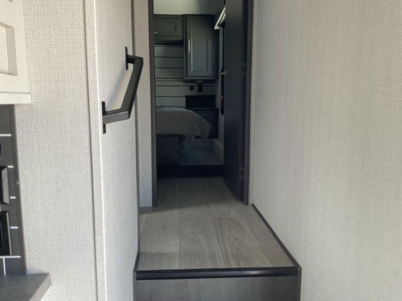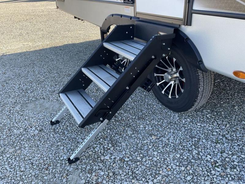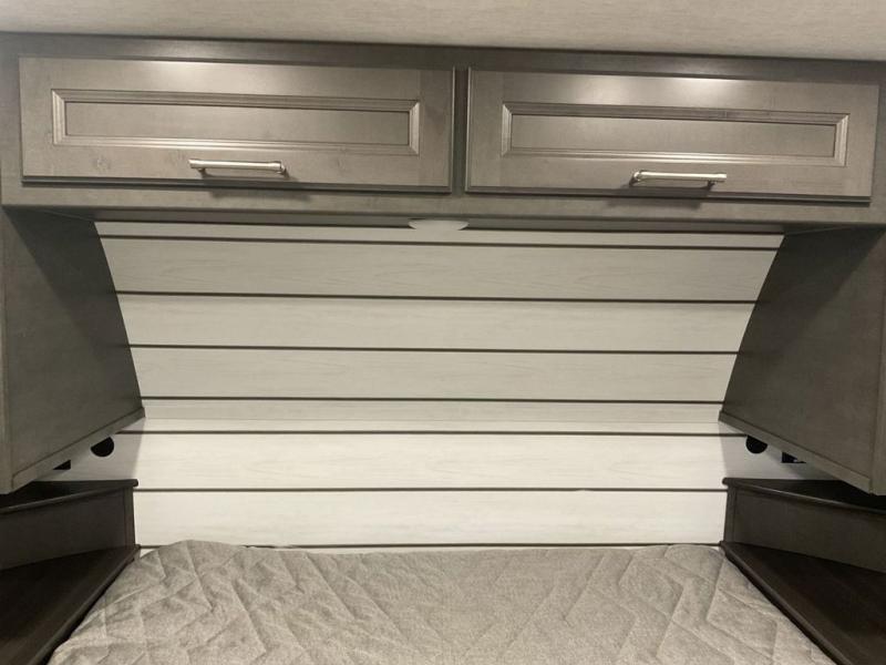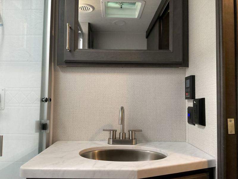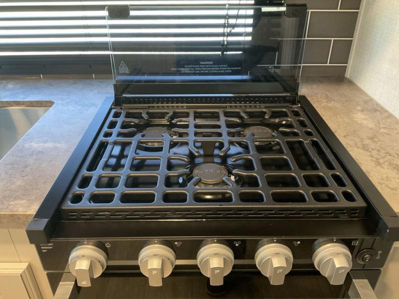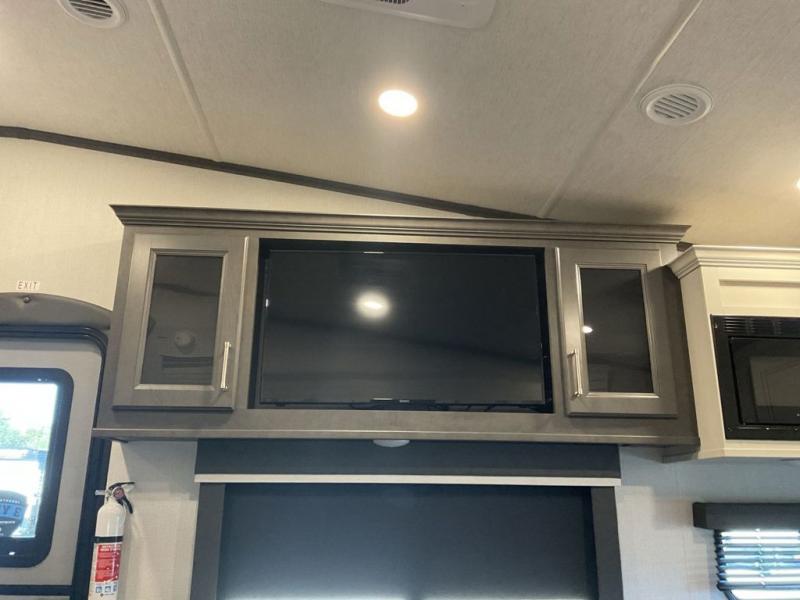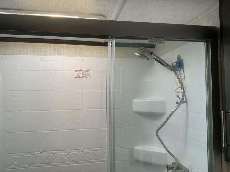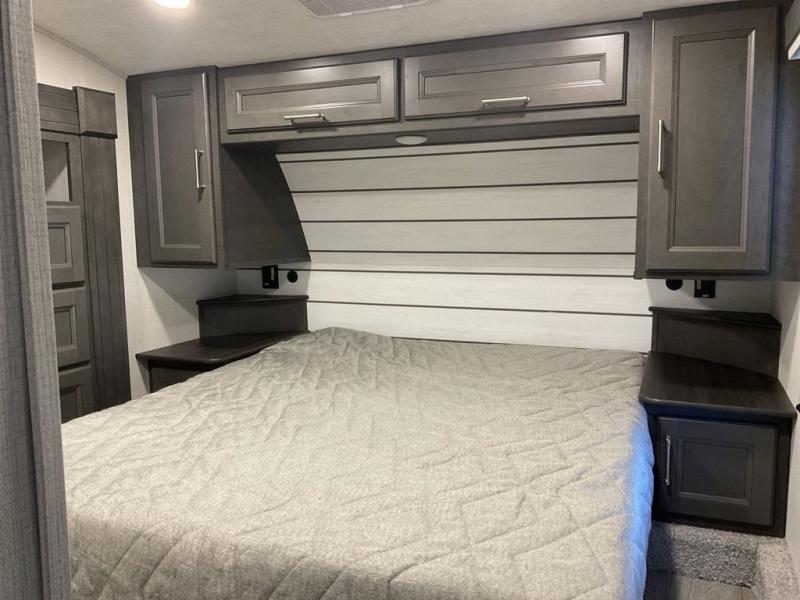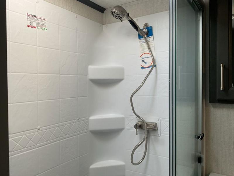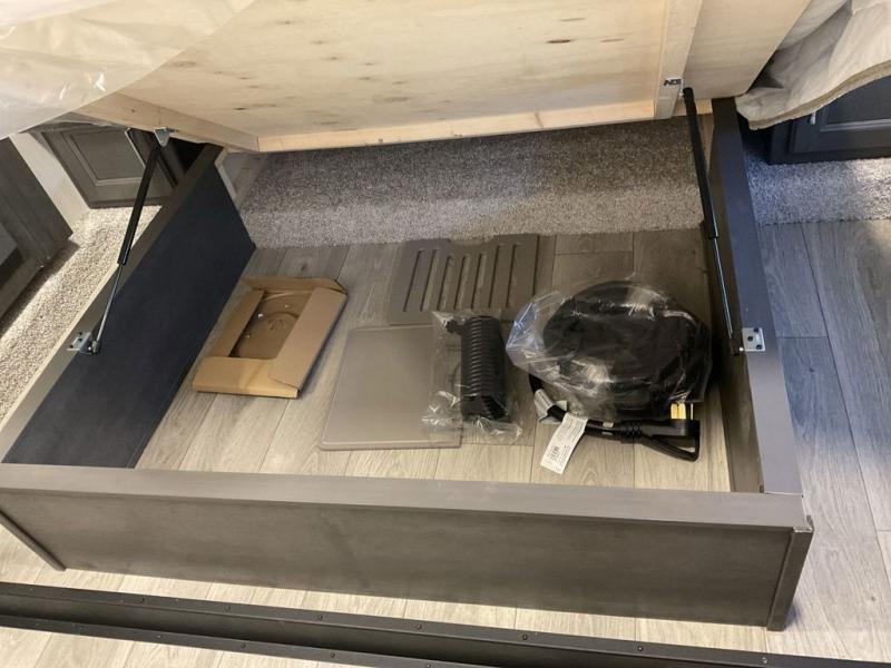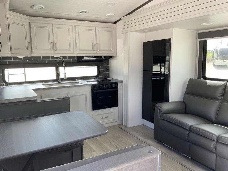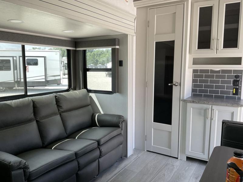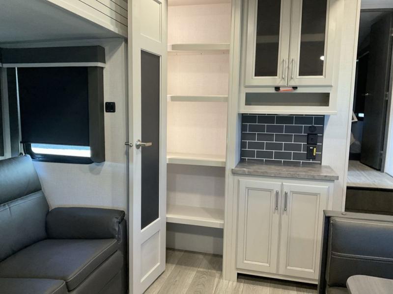 If you are looking for a fifth wheel that sleeps four to six with inside and outside cooking then check this unit out! This unit offers a short, mid-living layout with a bedroom wardrobe slide and combined 12 volt refrigerator and 68" tri-fold sofa sleeper slide for added floorspace to move about. Up front, you will enjoy a private bedroom with a queen bed and bedside wardrobe/nightstands as well as a larger wardrobe that slides out along the curbside wall. A complete bath provides a large shower, toilet and sink, plus linen storage which you are sure to appreciate as you travel. There are plenty of options for this unit making it easy to customize to your use and style. The theater seating and free standing dinette options can be selected in place of the sleeper sofa and booth dinette if you prefer. If you enjoy spending time outdoors, imagine making breakfast for your friends and family using the outside griddle. There is also a 16' awning to create even more living space to enjoy, and the unobstructed pass-through storage compartment can easily house all of your outdoor camping gear like lawn chairs and yard games.