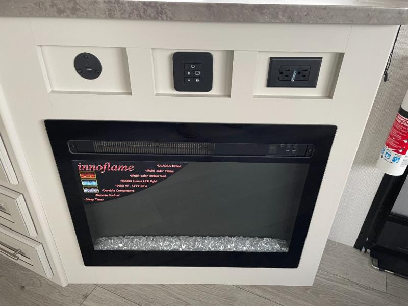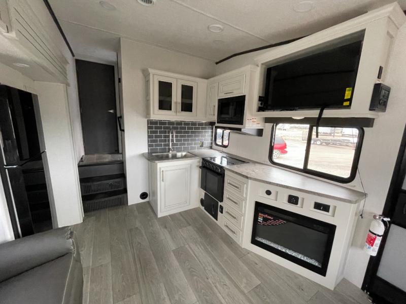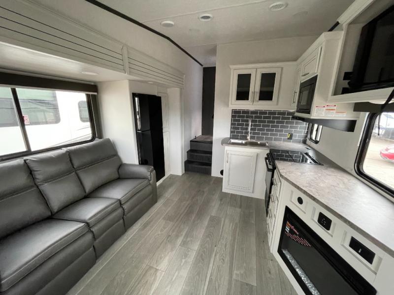 Spend your weekends in comfort with this Cougar Half-Ton fifth wheel! A full bathroom with a linen closet and shower with seat will provide convenience no matter where you've chosen to camp. You'll also be grateful to find a full kitchen with a 21" Furrion range with Piezo ignition and microwave so that you can get dinner ready in no time at all, and the private bedroom up front is where you will want to be at the end of a long day. You'll also love the fireplace in the main living area to make your space feel more like home!