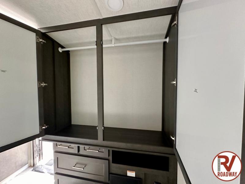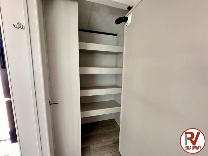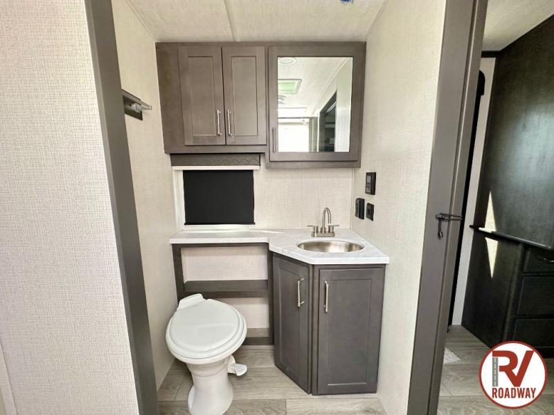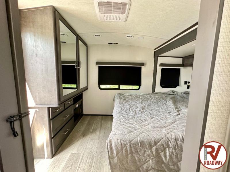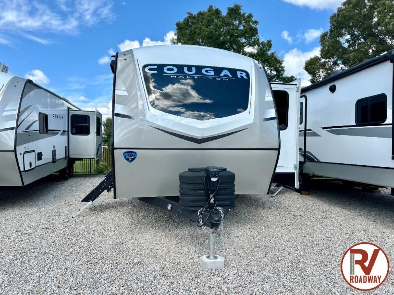 With a king-size bed, this Cougar Half-Ton travel trailer shows that you can still be comfortable even while you're away from home! The bed slides out to provide more walking around space and there is a wardrobe and dresser opposite near the private entry door. The main entry up front leads into a spacious combined kitchen and living area with the front kitchen offering plenty of counter space, a pantry, and overhead storage. There is a 12-volt refrigerator to the left of the entry door, and access to a walk-in second pantry is right around the corner from the swiveling entertainment center opposite a tri-fold sofa sleeper and booth dinette slide. This unit also features a full-width walk-thru bath giving you plenty of room to shower and change.