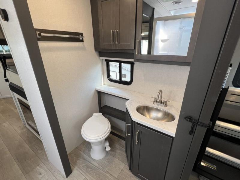 With a queen-size bed and a king bed option, this Cougar Half-Ton travel trailer shows that you can still be comfortable even while you're away from home! The bed slides out to provide more walking around space and there is a wardrobe and dresser opposite near the private entry door. The main entry up front leads into a spacious combined kitchen and living area with the front kitchen offering plenty of counter space, a pantry, and overhead storage. There is a 12-volt refrigerator to the left of the entry door, and access to a walk-in second pantry is right around the corner from the swiveling entertainment center opposite a tri-fold sofa sleeper and booth dinette slide. This unit also features a full-width walk-thru bath giving you plenty of room to shower and change.