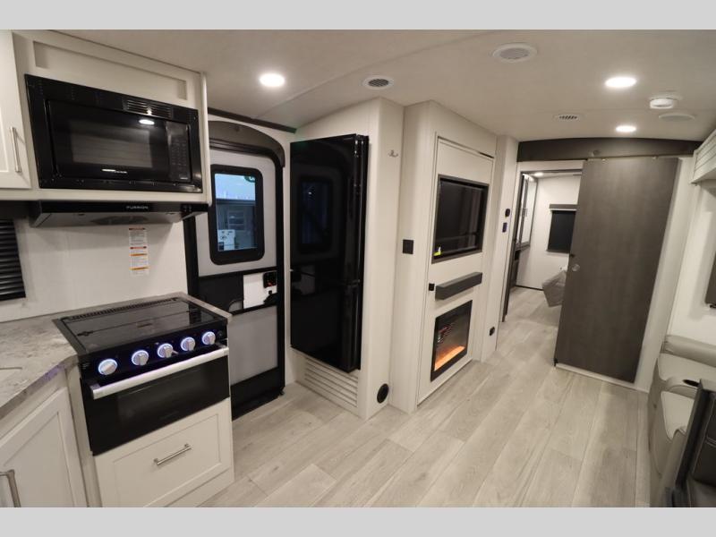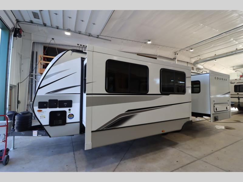 The Keystone Cougar Half-Ton fifth wheel and travel trailers are known as one of America's favorites for a reason! Some of those reasons are the exclusive features that come from Keystone, like the Winegard Air 360+ omni-directional rooftop antenna, the in-floor heating ducts, and the Hyper Deck flooring. The Cougar Half-Ton has a Climate Guard protection package to keep you safe during inclement weather, along with two roof attic vents, PEX plumbing and more. Use the 17" Furrion range with Piezo ignition to create all of those familiar meals from home, and enjoy endless hot showers with the Girard tankless on-demand water heater!