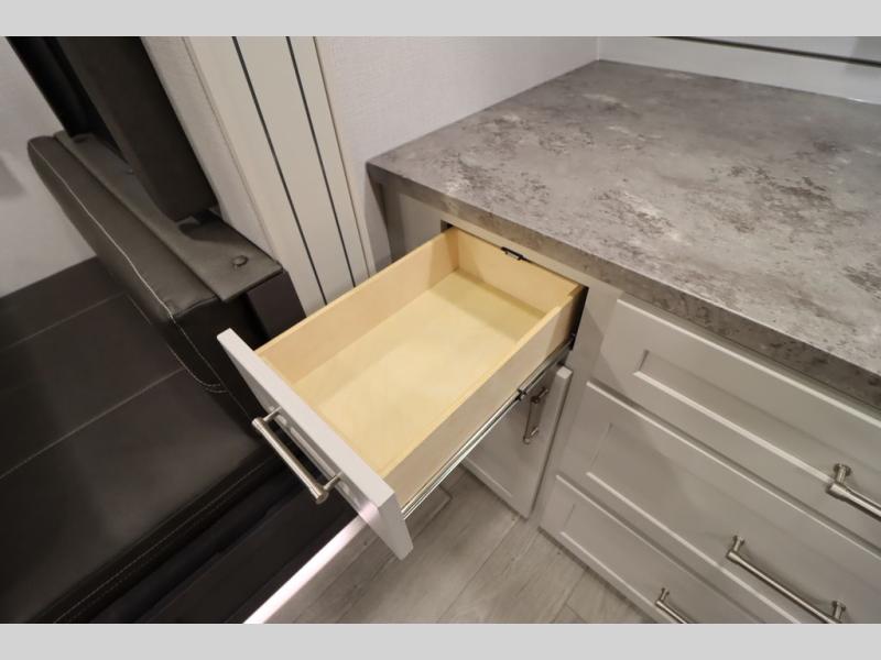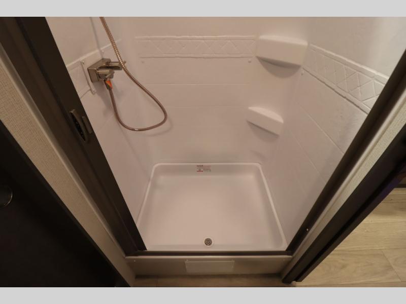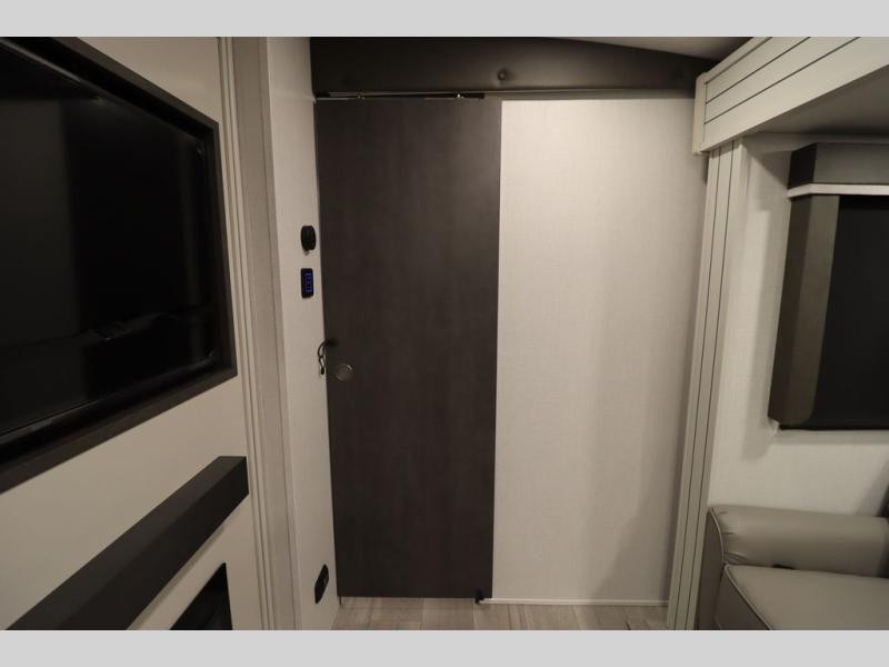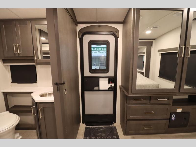 With a queen-size bed and a king bed option, this Cougar Half-Ton travel trailer shows that you can still be comfortable even while you're away from home! The bed slides out to provide more walking around space and there is a wardrobe and dresser opposite near the private entry door. The main entry up front leads into a spacious combined kitchen and living area with the front kitchen offering plenty of counter space, a pantry, and overhead storage. There is a 12-volt refrigerator to the left of the entry door, and access to a walk-in second pantry is right around the corner from the swiveling entertainment center opposite a tri-fold sofa sleeper and booth dinette slide. This unit also features a full-width walk-thru bath giving you plenty of room to shower and change.