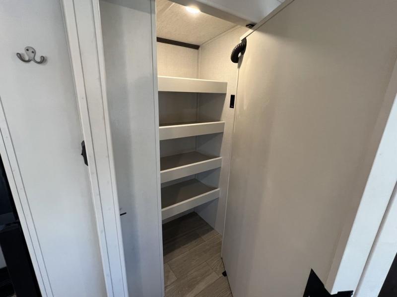 With a queen-size bed and a king bed option, this Cougar Half-Ton travel trailer shows that you can still be comfortable even while you're away from home! The bed slides out to provide more walking around space and there is a wardrobe and dresser opposite near the private entry door. The main entry up front leads into a spacious combined kitchen and living area with the front kitchen offering plenty of counter space, a pantry, and overhead storage. There is a 12-volt refrigerator to the left of the entry door, and access to a walk-in second pantry is right around the corner from the swiveling entertainment center opposite a tri-fold sofa sleeper and booth dinette slide. This unit also features a full-width walk-thru bath giving you plenty of room to shower and change.