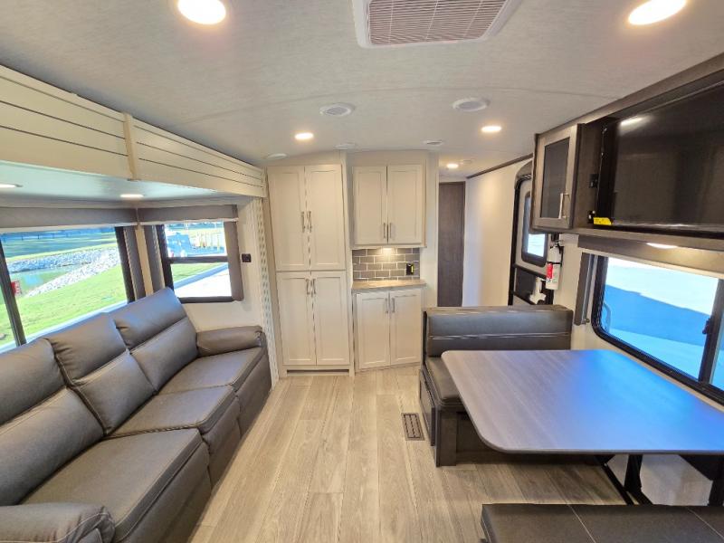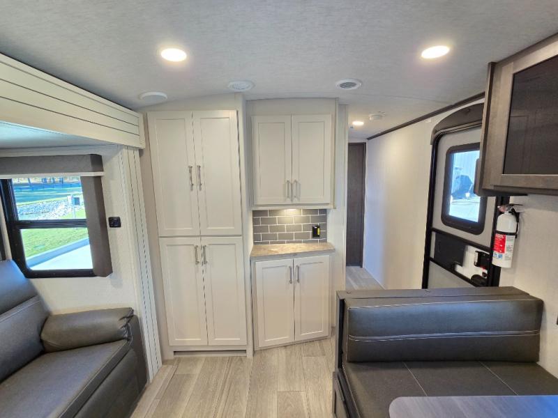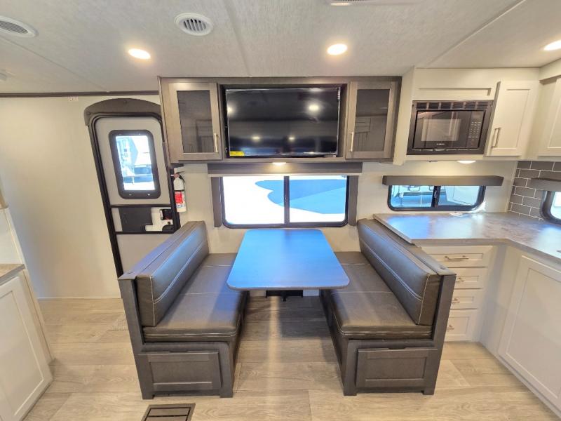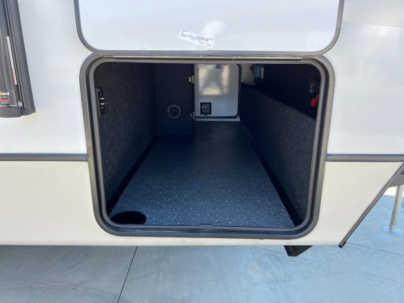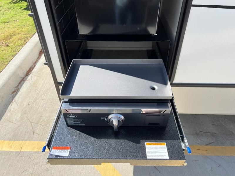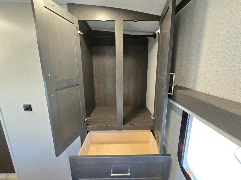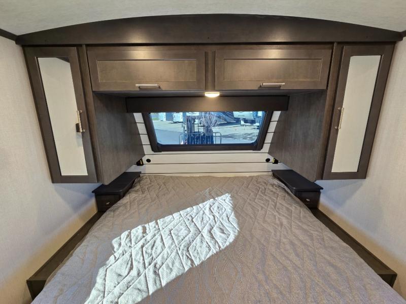 If you're ready for fun summers at the lake, make your adventures complete with this travel trailer in tow. The rear kitchen includes ample counter space to prep burgers, and you can take your preparations outside to cook on the outdoor kitchen! If the weather is nice, you might just want to eat outside too under the 18' power awning, or dine inside at the booth dinette. There is also a tri-fold sleeper sofa within the large slide out and an LED HDTV for movie nights. You'll find plenty of storage throughout, including a kitchen pantry, overhead cabinets, plus dual bedroom wardrobes on either side of the king bed!
