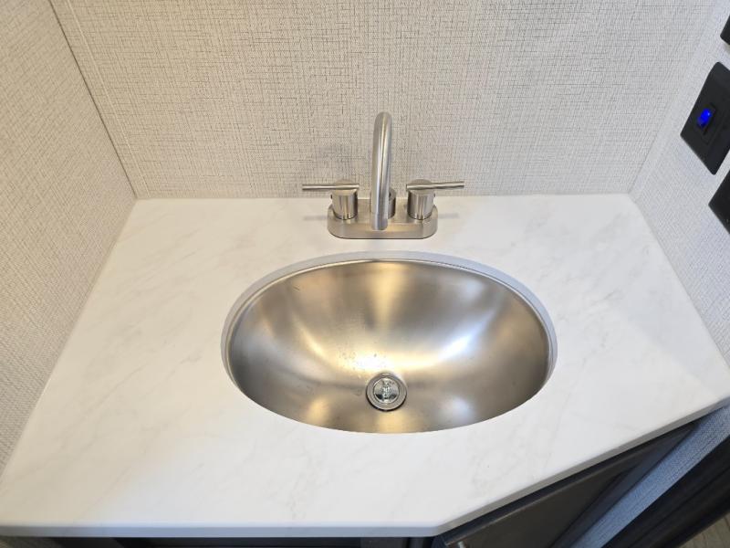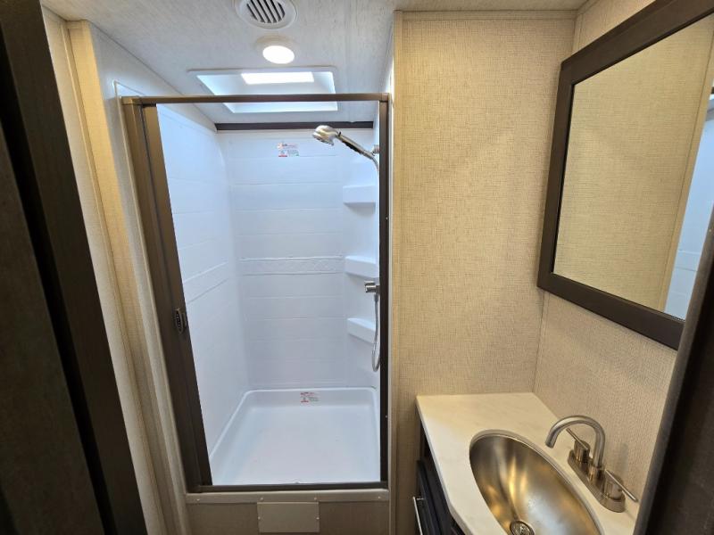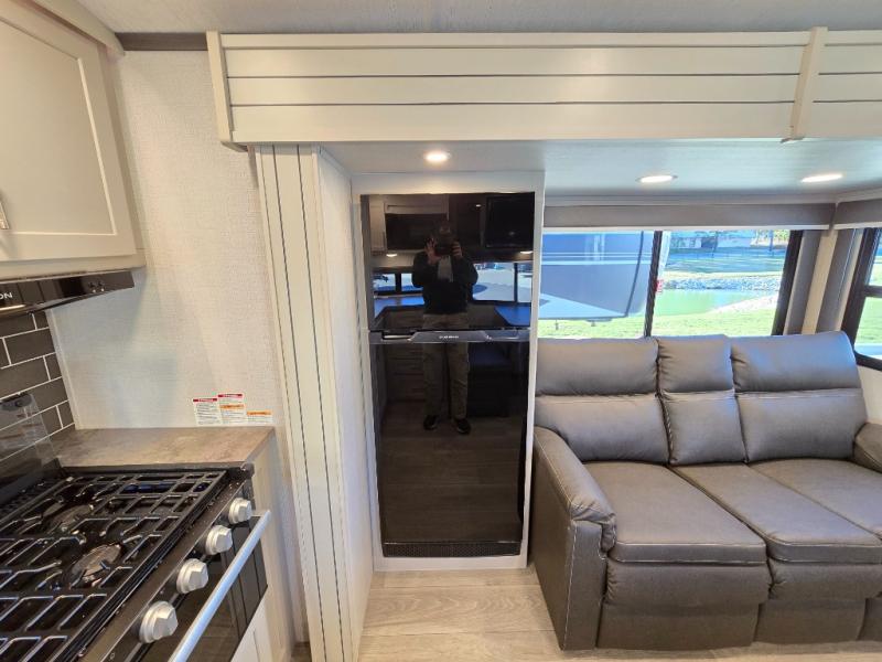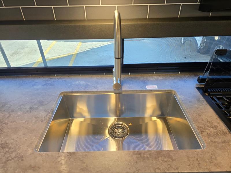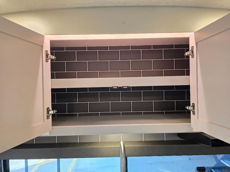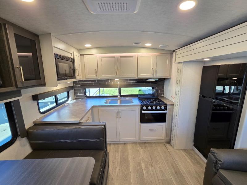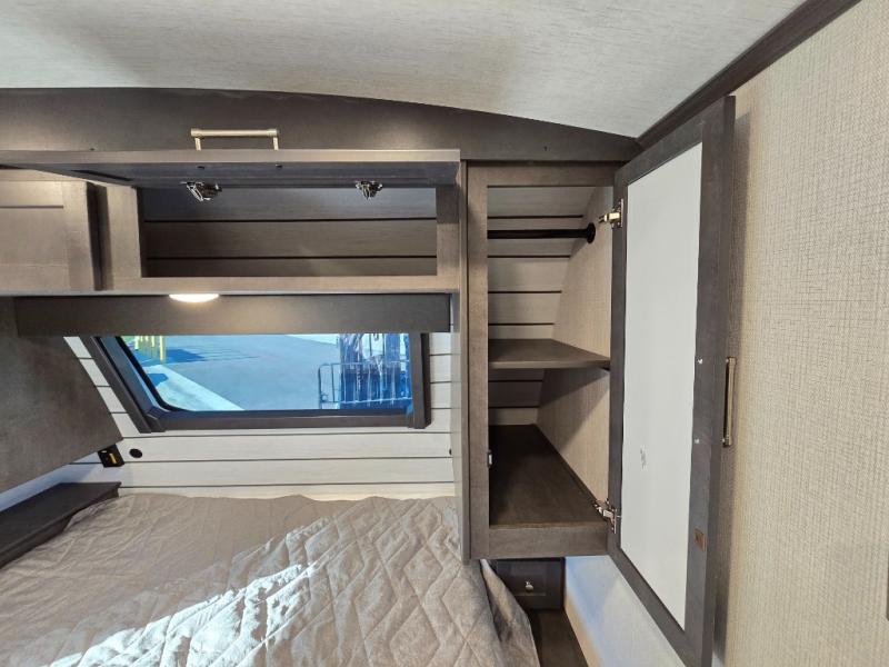 If you're ready for fun summers at the lake, make your adventures complete with this travel trailer in tow. The rear kitchen includes ample counter space to prep burgers, and you can take your preparations outside to cook on the outdoor kitchen! If the weather is nice, you might just want to eat outside too under the 18' power awning, or dine inside at the booth dinette. There is also a tri-fold sleeper sofa within the large slide out and an LED HDTV for movie nights. You'll find plenty of storage throughout, including a kitchen pantry, overhead cabinets, plus dual bedroom wardrobes on either side of the king bed!