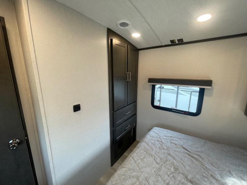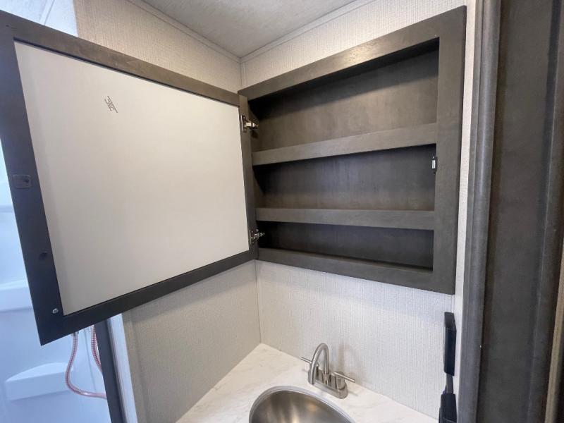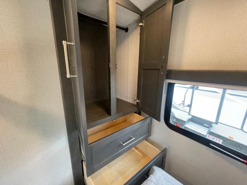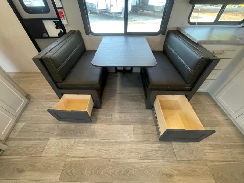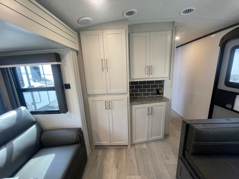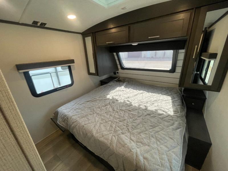 If you're ready for fun summers at the lake, make your adventures complete with this travel trailer in tow. The rear kitchen includes ample counter space to prep burgers, and you can take your preparations outside to cook on the outdoor kitchen! If the weather is nice, you might just want to eat outside too under the 18' power awning, or dine inside at the booth dinette. There is also a tri-fold sleeper sofa within the large slide out and an LED HDTV for movie nights. You'll find plenty of storage throughout, including a kitchen pantry, overhead cabinets, plus dual bedroom wardrobes on either side of the king bed!