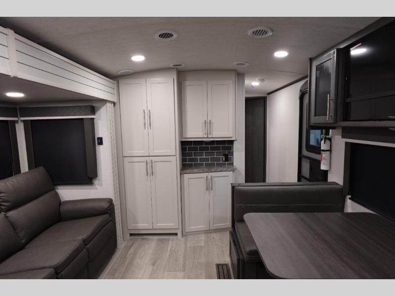 If you're ready for fun summers at the lake, make your adventures complete with this travel trailer in tow. The rear kitchen includes ample counter space to prep burgers, and you can take your preparations outside to cook on the outdoor kitchen! If the weather is nice, you might just want to eat outside too under the 18' power awning, or dine inside at the booth dinette. There is also a tri-fold sleeper sofa within the large slide out and an LED HDTV for movie nights. You'll find plenty of storage throughout, including a kitchen pantry, overhead cabinets, plus dual bedroom wardrobes on either side of the king bed!