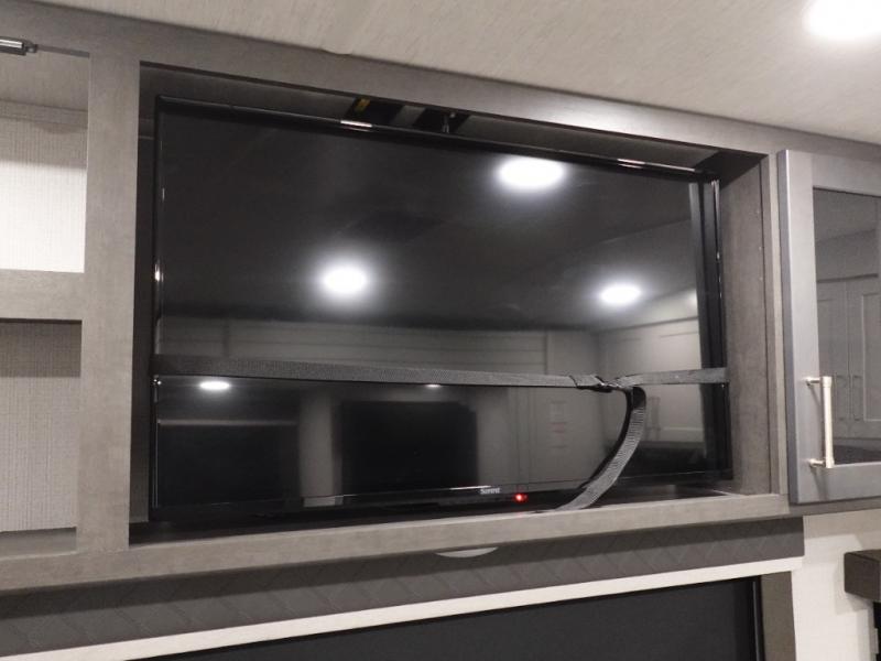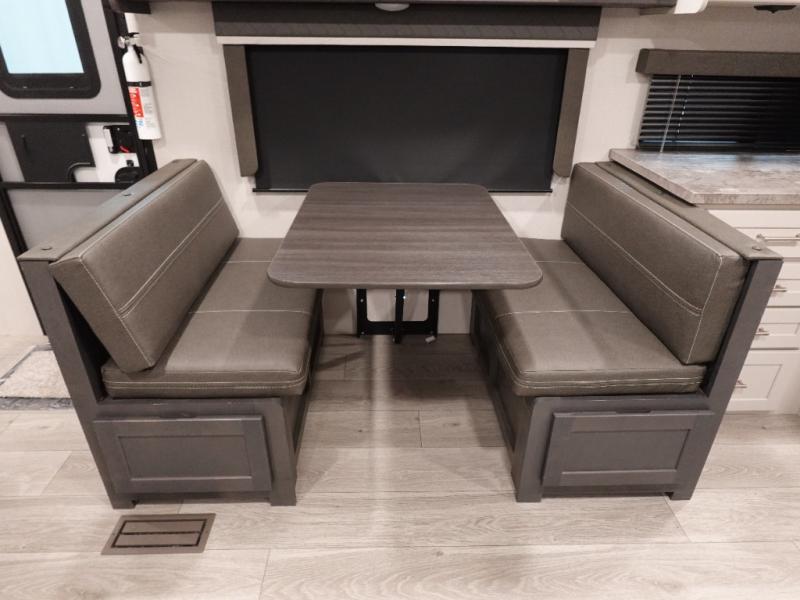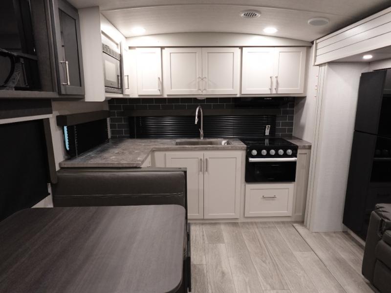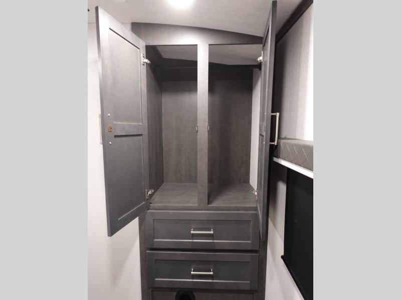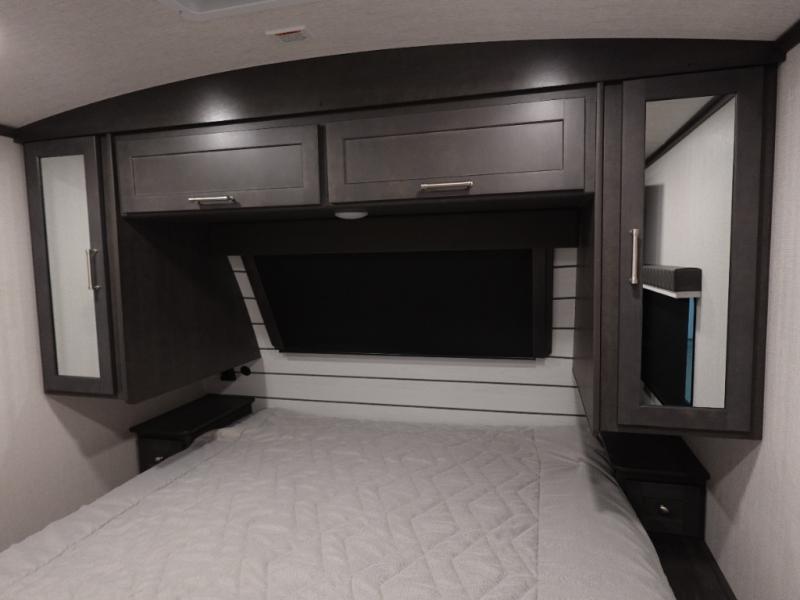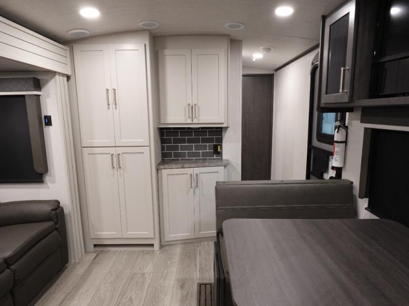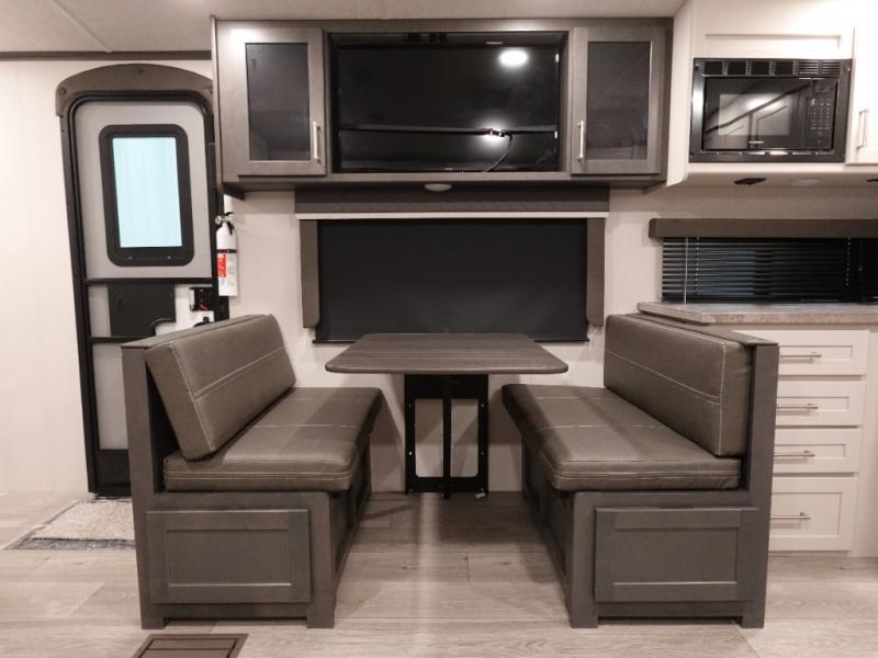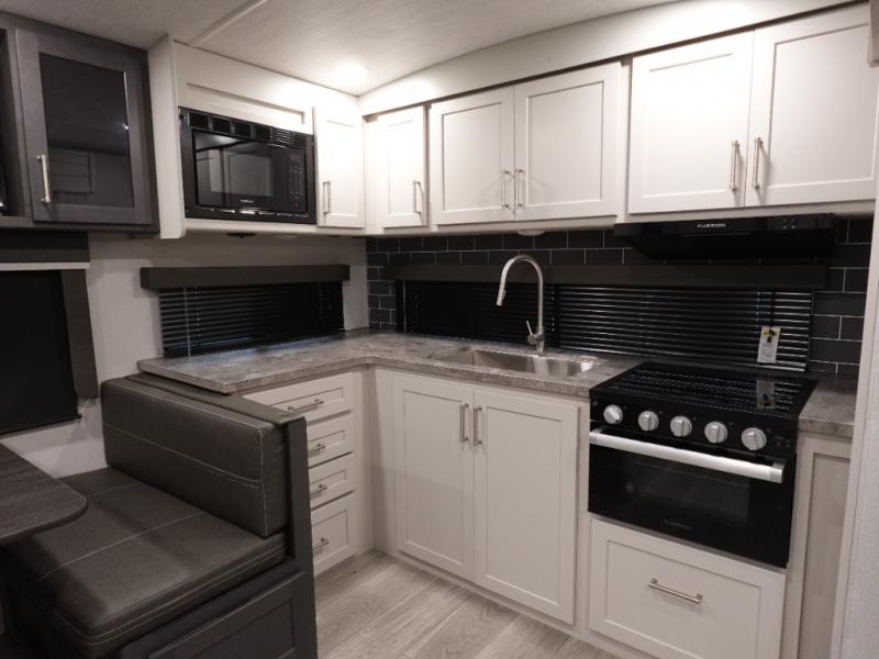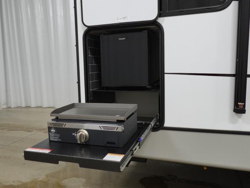 If you're ready for fun summers at the lake, make your adventures complete with this travel trailer in tow. The rear kitchen includes ample counter space to prep burgers, and you can take your preparations outside to cook on the outdoor kitchen! If the weather is nice, you might just want to eat outside too under the 18' power awning, or dine inside at the booth dinette. You'll find plenty of storage throughout, including a kitchen pantry, overhead cabinets, plus dual bedroom wardrobes on either side of the king bed!
