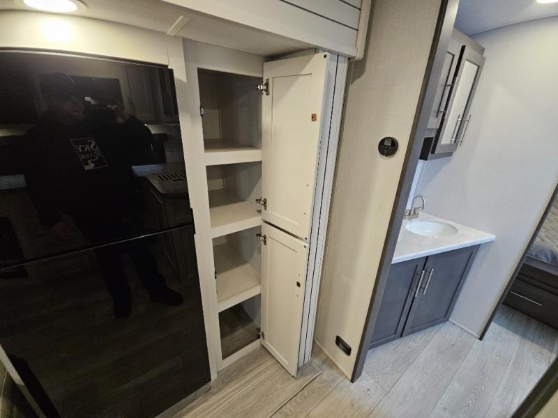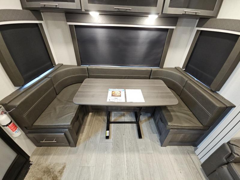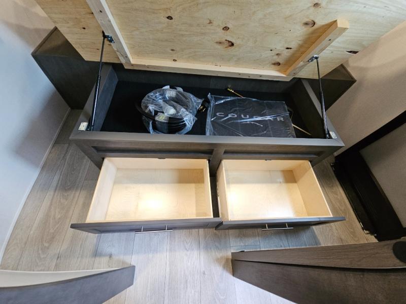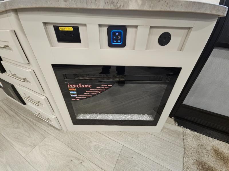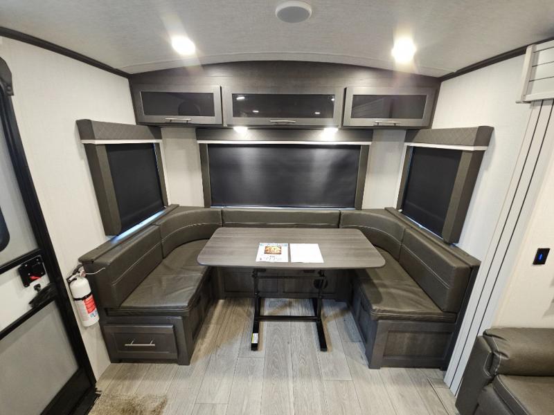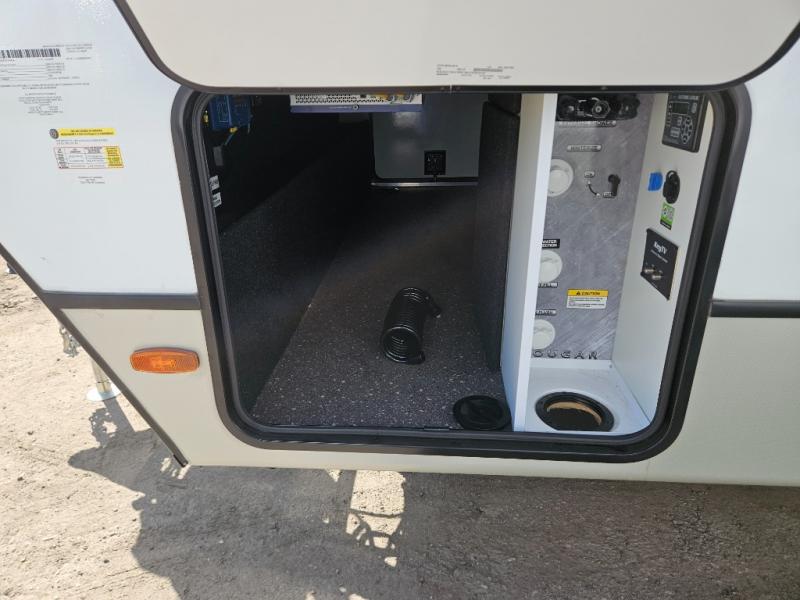 You will enjoy all of your adventures with this Cougar Half-Ton travel trailer in tow! Inside, you will find ample space and seating with a large slide that includes a tri-fold sofa sleeper along one side and a U-shaped dinette across the entire back of the unit making mealtime and game time loads of fun. These features will allow you to easily entertain your RV park friends and overnight guests too. The tri-fold sofa sleeper can comfortably sleep two guests who will also enjoy the cozy electric fireplace on a cool chilly night. A private front bedroom including a king-size bed will ensure that you have a great night's rest, and the private second entry door into the front bedroom makes it easy to slip out for a morning walk before your guests awake. This unit also features ample storage both inside and out with a front pass-through compartment, wardrobes and overhead cabinetry throughout, and a pantry for your non-perishables.