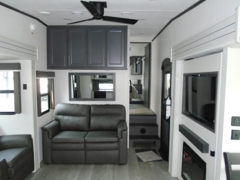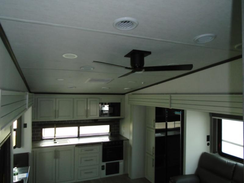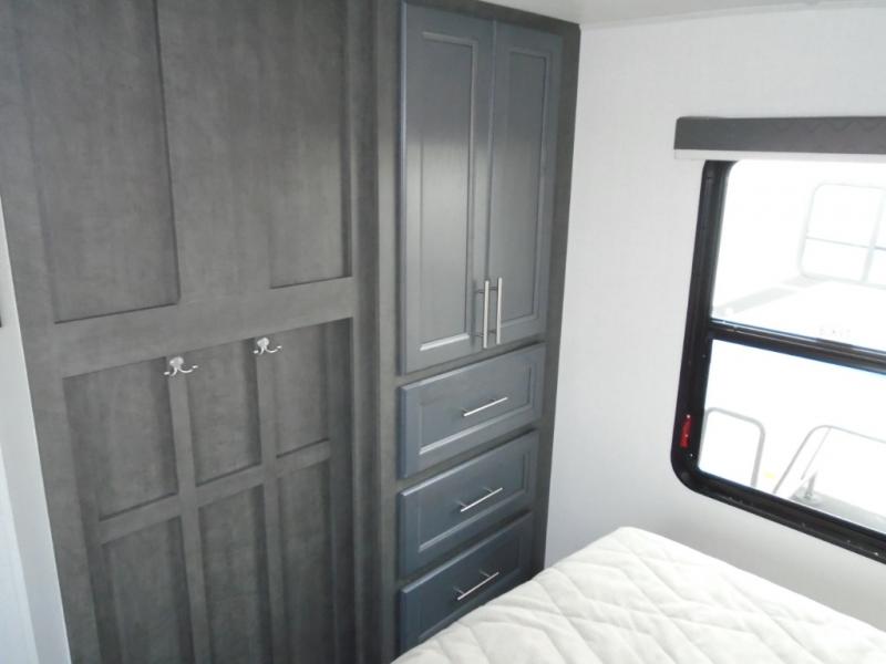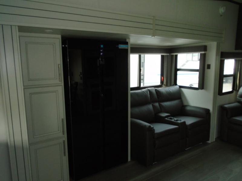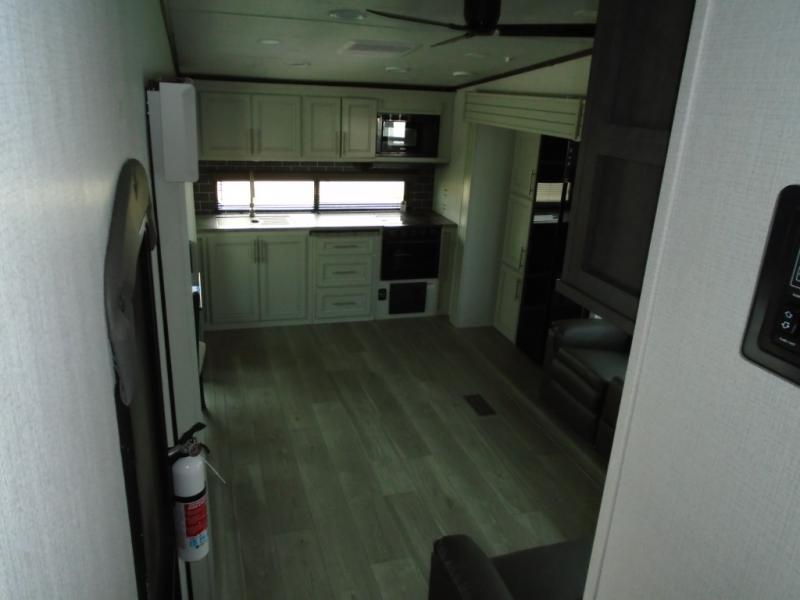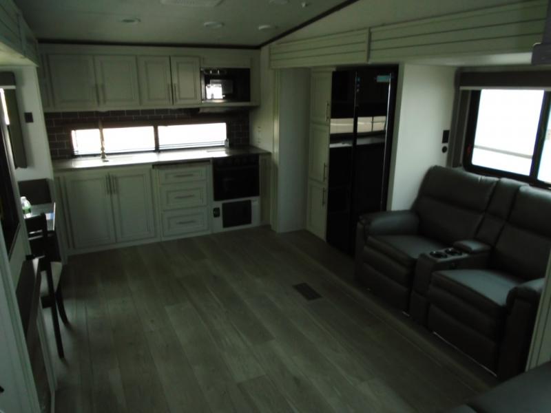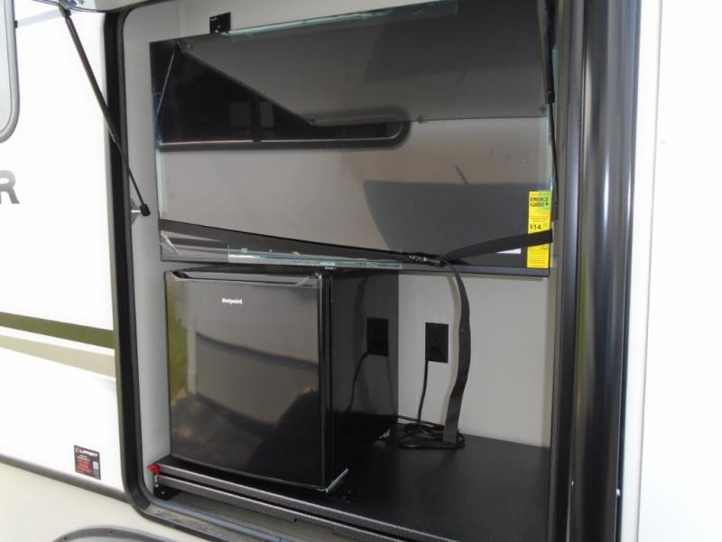 Time spent at the campground in this fifth wheel will be time well spent! Once you arrive, you can unload the unobstructed pass-thru storage, put out the two power awnings, and grab a cold drink from the outdoor mini refrigerator. Head inside to relax on the tri-fold sleeper sofa or theater seating across from the LED HDTV. The rear kitchen includes everything you need to make meals each day, including a pull-out countertop for more space plus a pantry and 16 cu. ft. refrigerator for food storage. The full bath with a 30" x 36" shower will let you freshen up before bed, and speaking of bedtime, the queen bed in the front private bedroom is sure to bring a great night's rest. There are also dual wardrobes and nightstands here for your things, plus a third wardrobe with washer and dryer prep if you want to add these appliances.