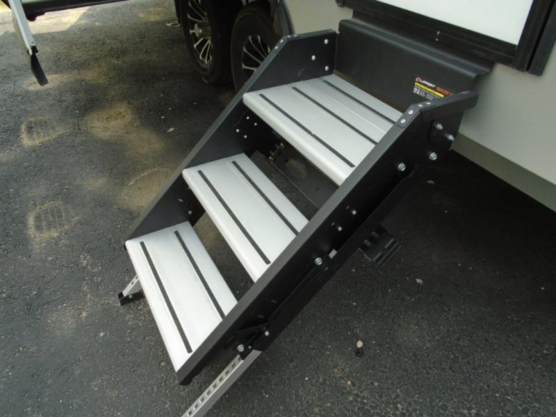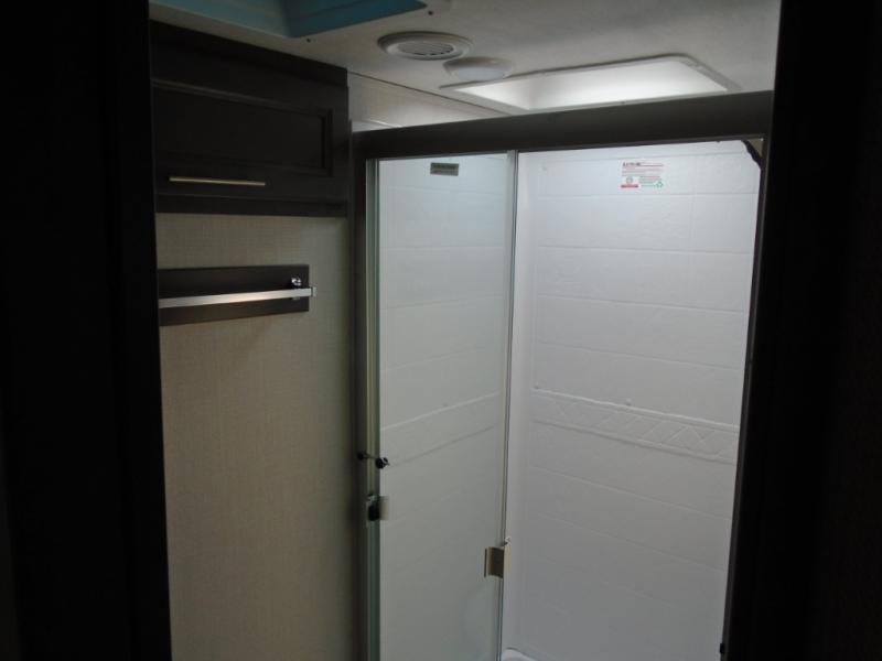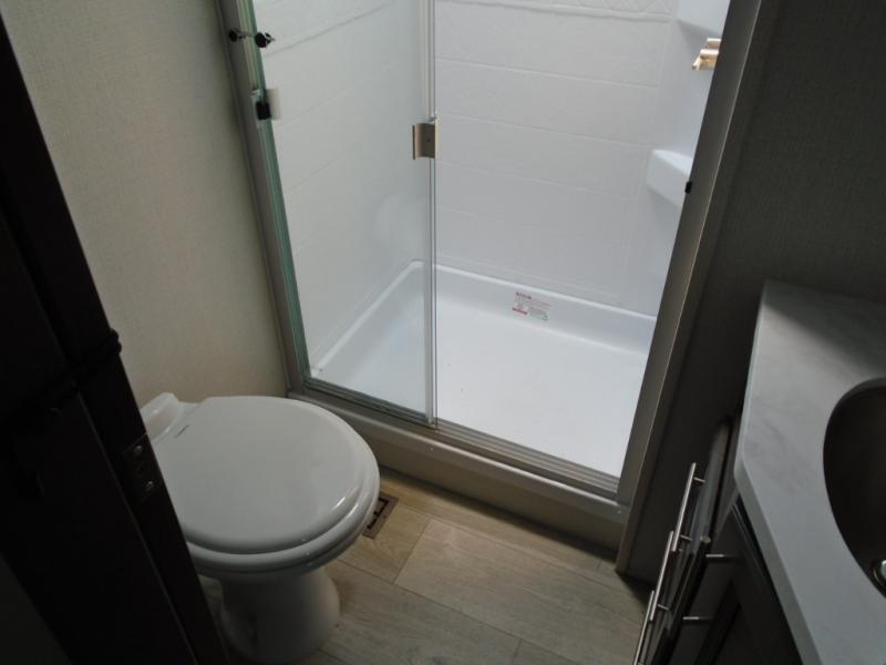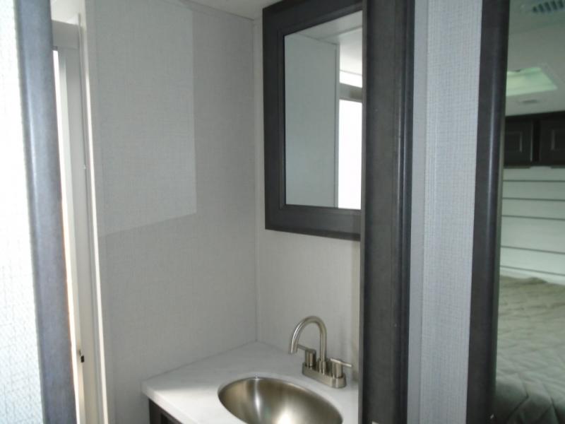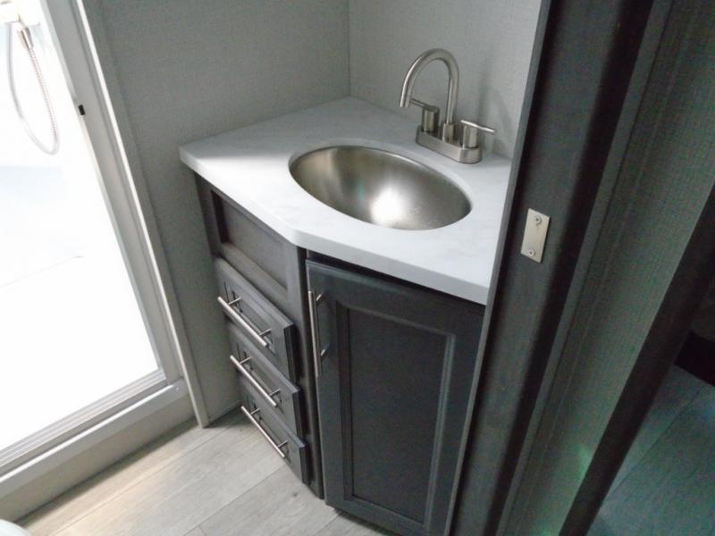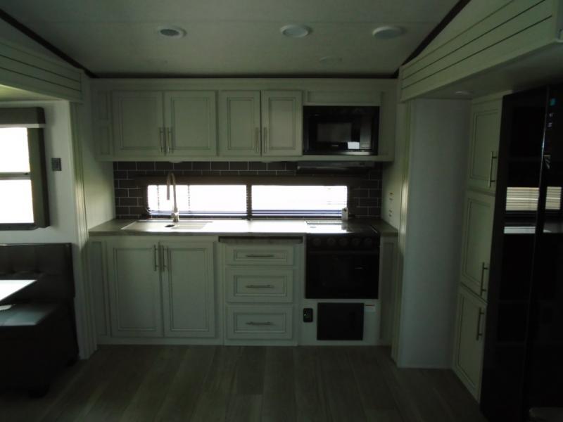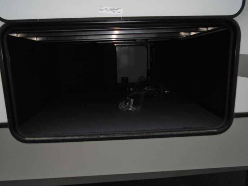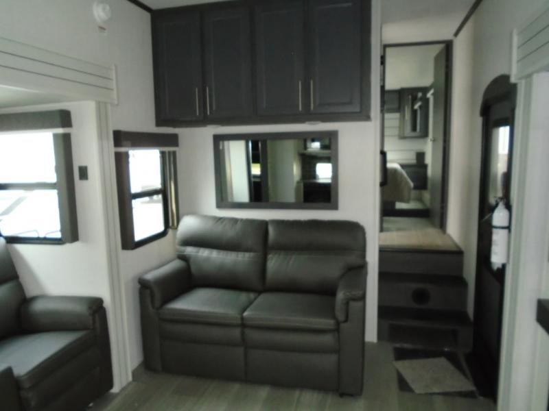 Time spent at the campground in this fifth wheel will be time well spent! Once you arrive, you can unload the unobstructed pass-thru storage, put out the two power awnings, and grab a cold drink from the outdoor mini refrigerator. Head inside to relax on the tri-fold sleeper sofa or theater seating across from the LED HDTV. The rear kitchen includes everything you need to make meals each day, including a pull-out countertop for more space plus a pantry and 16 cu. ft. refrigerator for food storage. The full bath with a 30" x 36" shower will let you freshen up before bed, and speaking of bedtime, the queen bed in the front private bedroom is sure to bring a great night's rest. There are also dual wardrobes and nightstands here for your things, plus a third wardrobe with washer and dryer prep if you want to add these appliances.