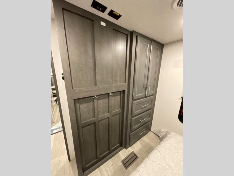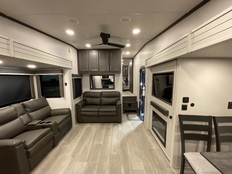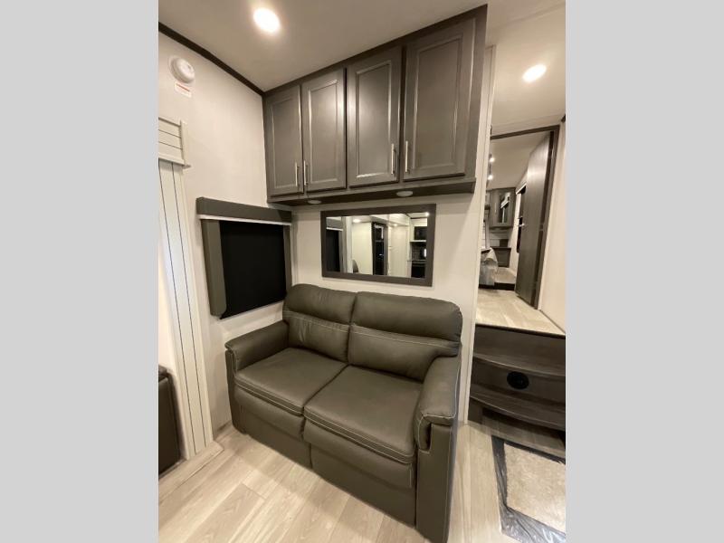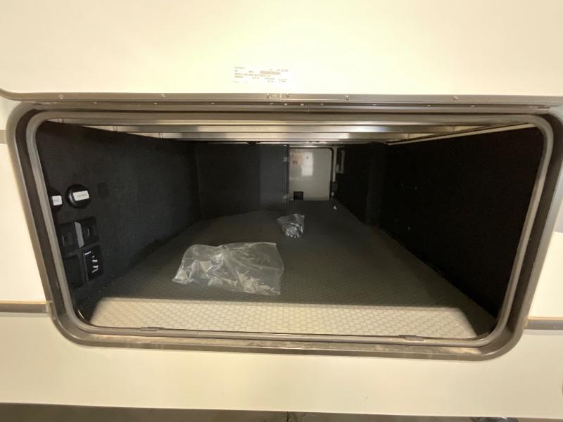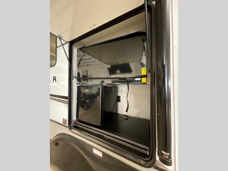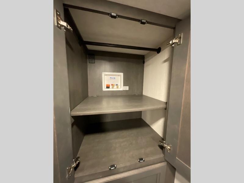 Time spent at the campground in this fifth wheel will be time well spent! Once you arrive, you can unload the unobstructed pass-thru storage, put out the two power awnings, and grab a cold drink from the outdoor mini refrigerator. Head inside to relax on the tri-fold sleeper sofa or theater seating across from the LED HDTV. The rear kitchen includes everything you need to make meals each day, including a pull-out countertop for more space plus a pantry and 16 cu. ft. refrigerator for food storage. The full bath with a 30" x 36" shower will let you freshen up before bed, and speaking of bedtime, the queen bed in the front private bedroom is sure to bring a great night's rest. There are also dual wardrobes and nightstands here for your things, plus a third wardrobe with washer and dryer prep if you want to add these appliances.