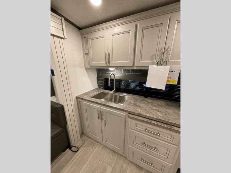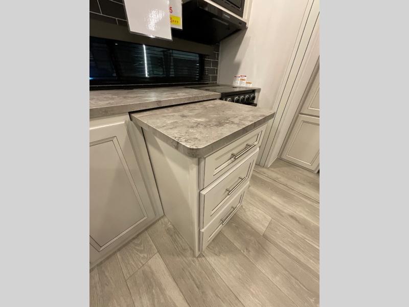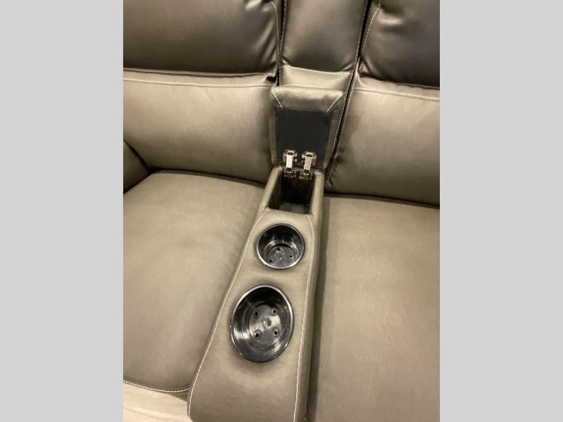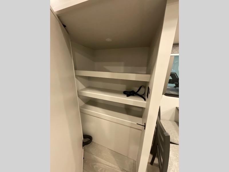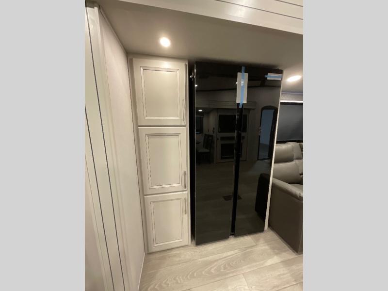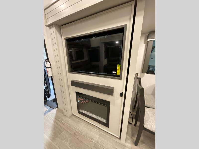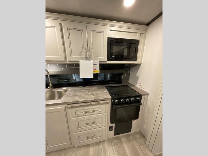 Time spent at the campground in this fifth wheel will be time well spent! Once you arrive, you can unload the unobstructed pass-thru storage, put out the two power awnings, and grab a cold drink from the outdoor mini refrigerator. Head inside to relax on the tri-fold sleeper sofa or theater seating across from the LED HDTV. The rear kitchen includes everything you need to make meals each day, including a pull-out countertop for more space plus a pantry and 16 cu. ft. refrigerator for food storage. The full bath with a 30" x 36" shower will let you freshen up before bed, and speaking of bedtime, the queen bed in the front private bedroom is sure to bring a great night's rest. There are also dual wardrobes and nightstands here for your things, plus a third wardrobe with washer and dryer prep if you want to add these appliances.