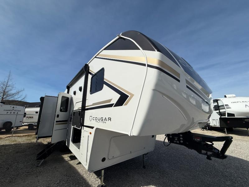 The Keystone Cougar Half-Ton fifth wheel and travel trailers are known as one of America's favorites for a reason! Some of those reasons are the exclusive features that come from Keystone, like the Winegard Air 360+ omni-directional rooftop antenna, the in-floor heating ducts, and the Hyper Deck flooring. The Cougar Half-Ton has a Climate Guard protection package to keep you safe during inclement weather, along with two roof attic vents, PEX plumbing and more. Use the 21" Furrion range with Piezo ignition to create all of those familiar meals from home, and enjoy endless hot showers with the Girard tankless on-demand water heater!