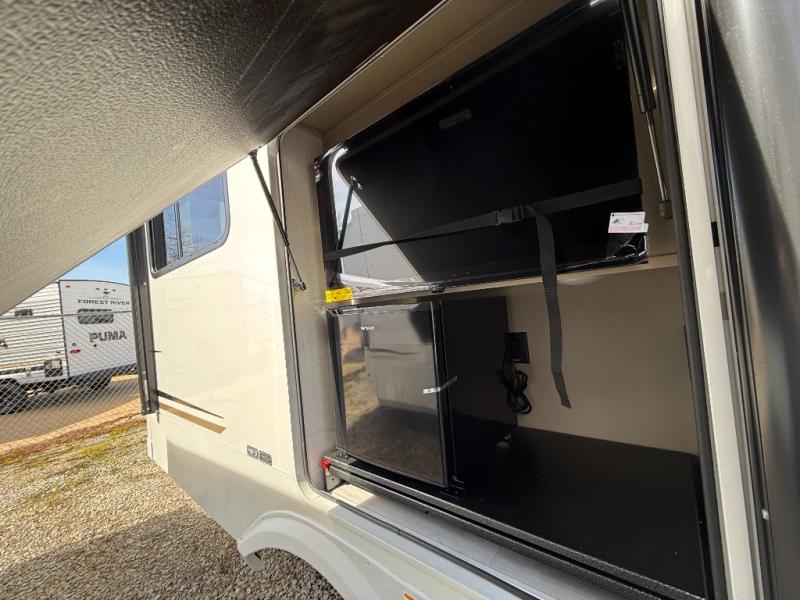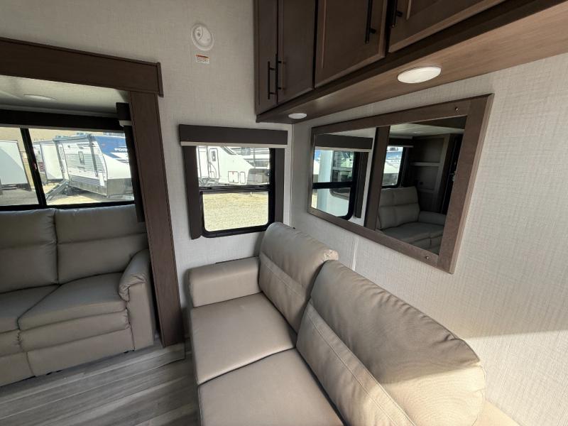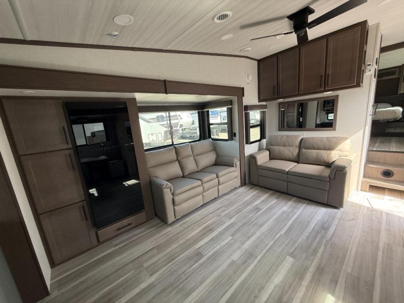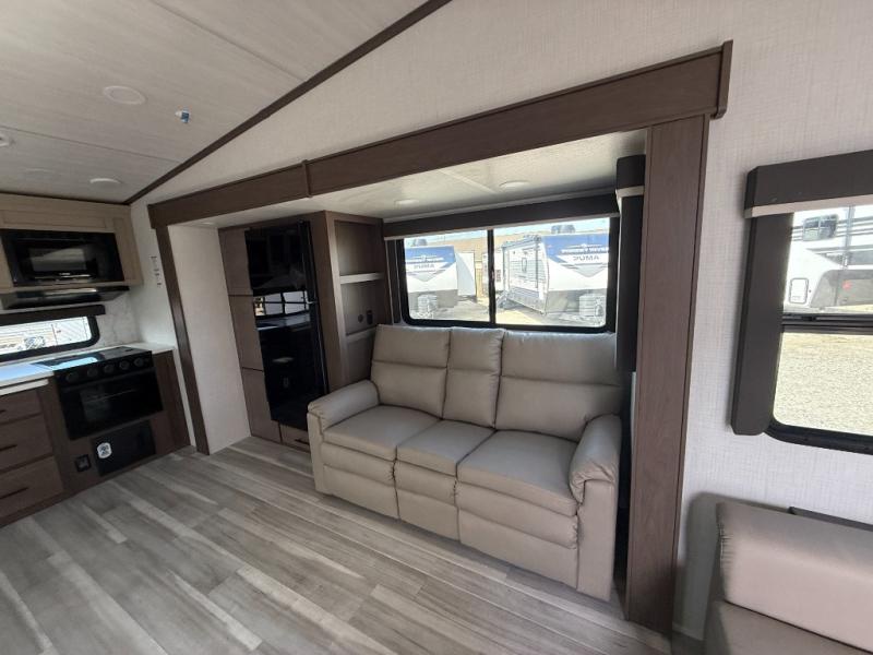 Time spent at the campground in this fifth wheel will be time well spent! Once you arrive, you can unload the unobstructed pass-thru storage, put out the two power awnings, and grab a cold drink from the outdoor mini refrigerator. Head inside to relax on the tri-fold sleeper sofa or theater seating across from the LED HDTV. The rear kitchen includes everything you need to make meals each day, including a pull-out countertop for more space plus a pantry and 16 cu. ft. refrigerator for food storage. The full bath with a 30" x 36" shower will let you freshen up before bed, and speaking of bedtime, the queen bed in the front private bedroom is sure to bring a great night's rest. There are also dual wardrobes and nightstands here for your things, plus a third wardrobe with washer and dryer prep if you want to add these appliances.