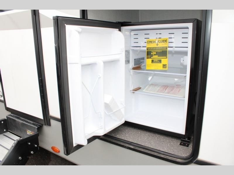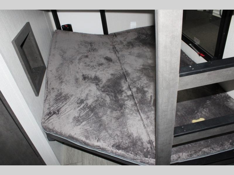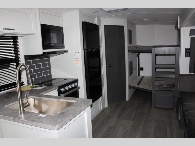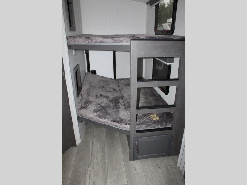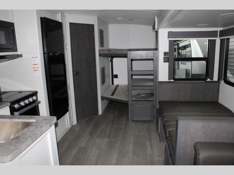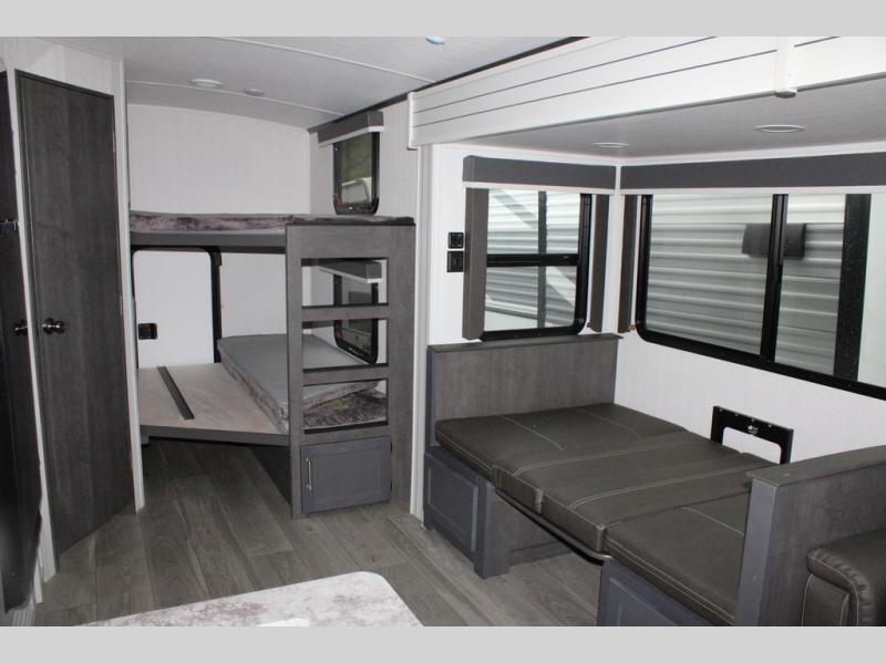 With dual entry doors in this travel trailer, you can enter in through the main living area or the full bath for convenience! Once inside, the sleeper sofa and booth dinette provide places to relax, eat, and play games, plus there is an entertainment center with hidden storage behind to keep movies organized. A full kitchen with a three burner cooktop and 12V refrigerator will allow you to cook and store food, or you can head outdoors to cook on the outdoor kitchen. There is also drop-frame storage outside for fishing poles and hiking gear, and the 21' electric awning provides shade as you relax. When it's time to call it a night, the king bed in the front private bedroom is sure to bring comfort, while the little ones take the double-size bunks, and any other guests can sleep on the living room furniture!