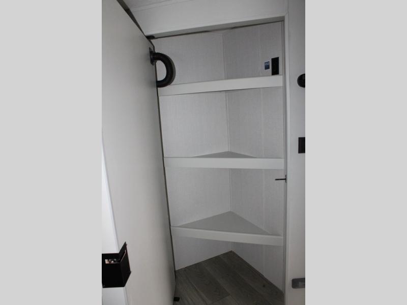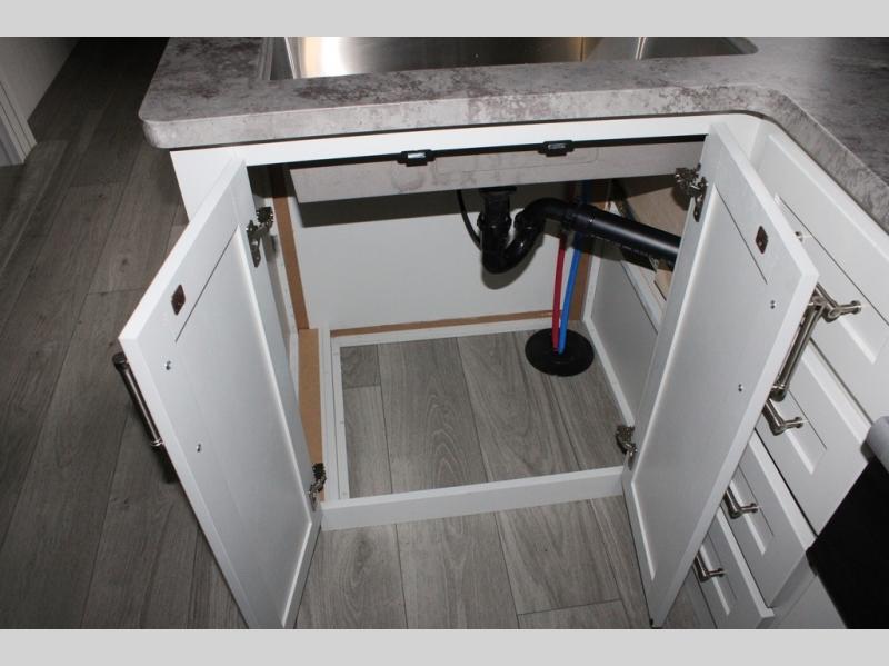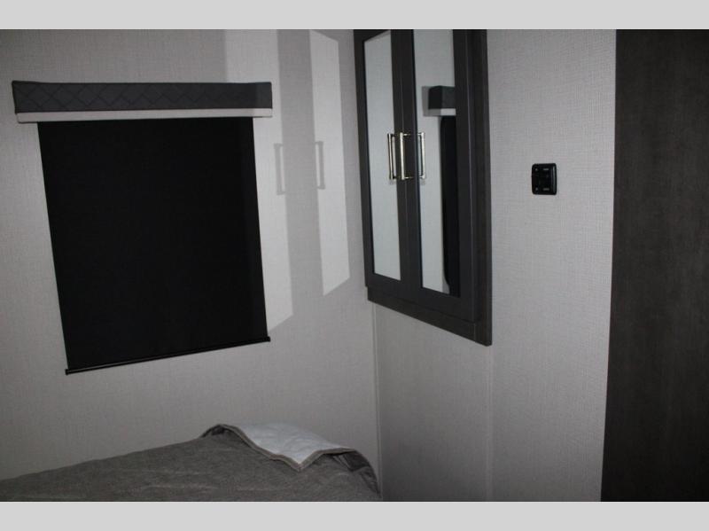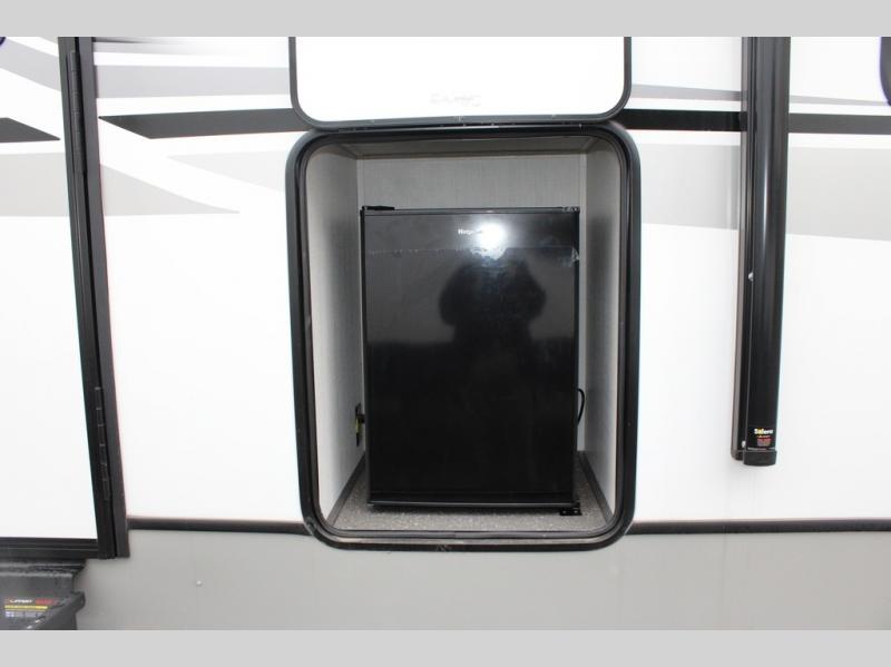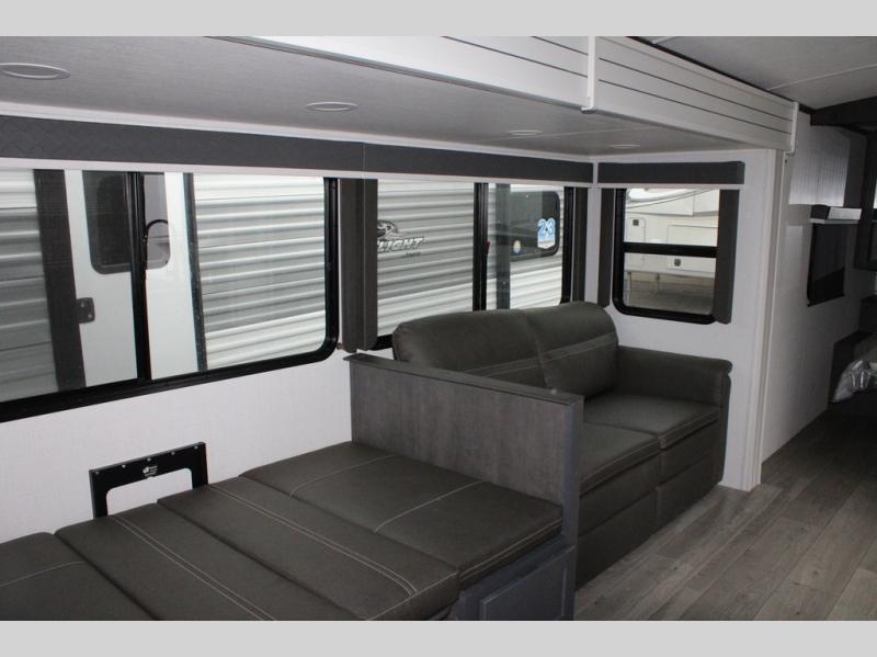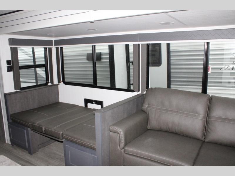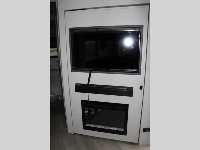 With dual entry doors in this travel trailer, you can enter in through the main living area or the full bath for convenience! Once inside, the sleeper sofa and booth dinette provide places to relax, eat, and play games, plus there is an entertainment center with hidden storage behind to keep movies organized. A full kitchen with a three burner cooktop and 12V refrigerator will allow you to cook and store food, or you can head outdoors to cook on the outdoor kitchen. There is also drop-frame storage outside for fishing poles and hiking gear, and the 21' electric awning provides shade as you relax. When it's time to call it a night, the king bed in the front private bedroom is sure to bring comfort, while the little ones take the double-size bunks, and any other guests can sleep on the living room furniture!