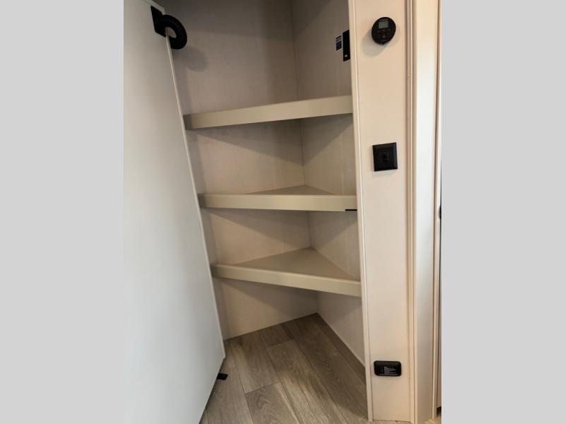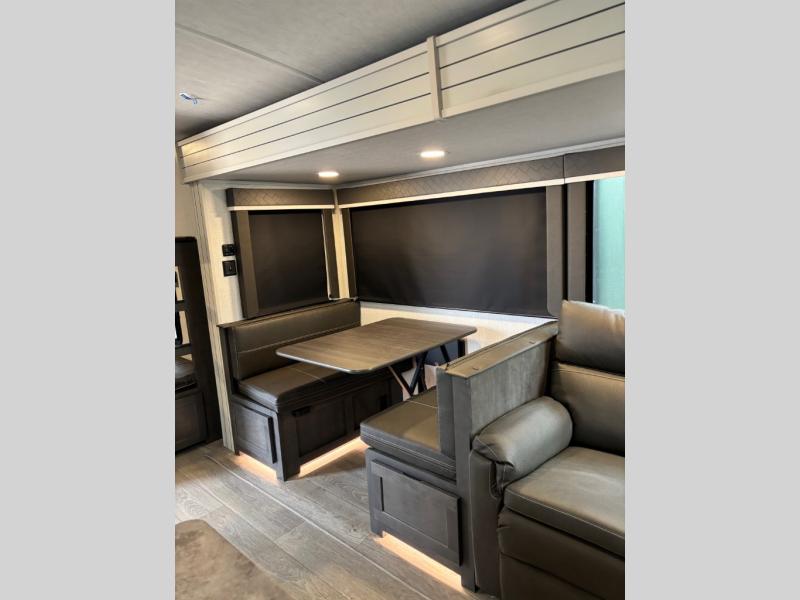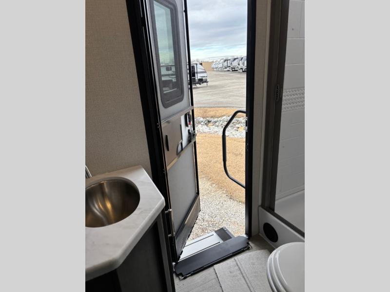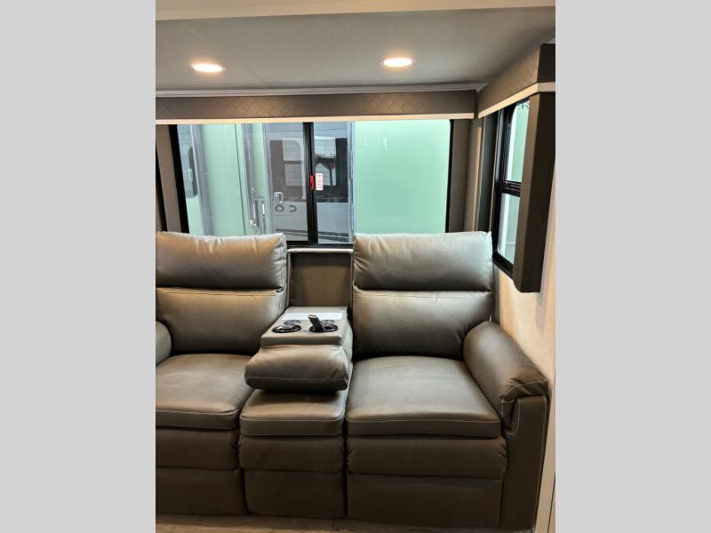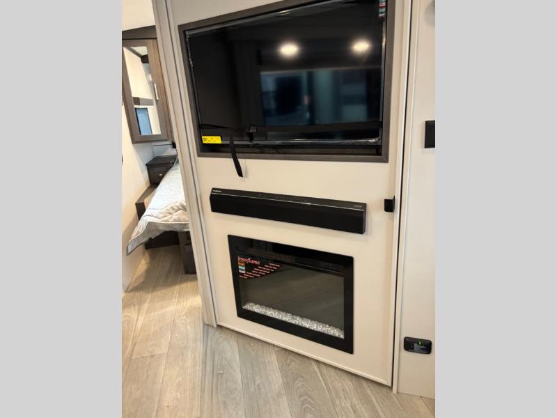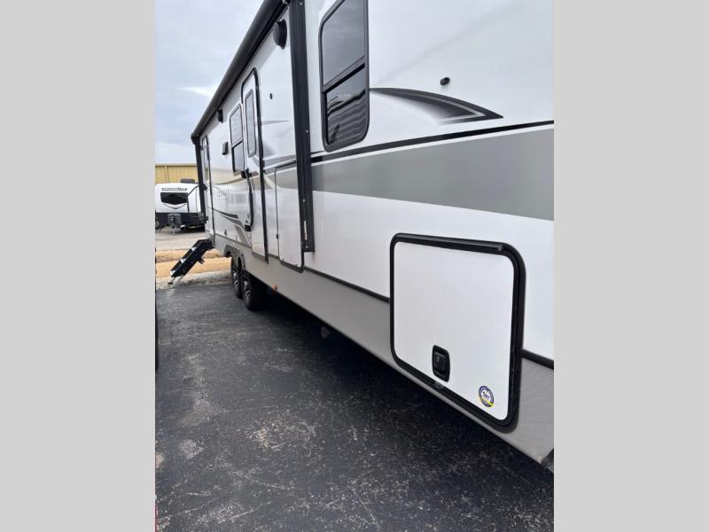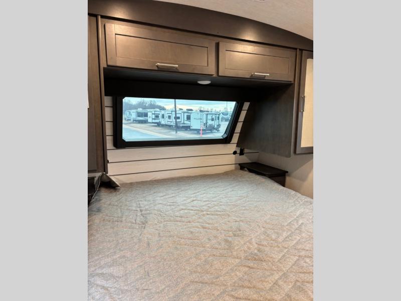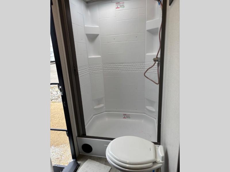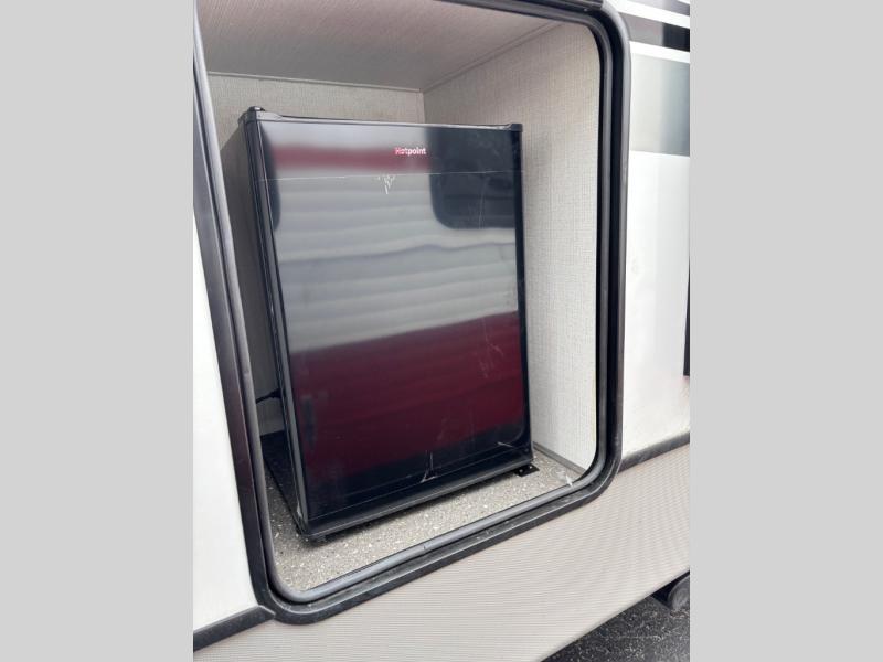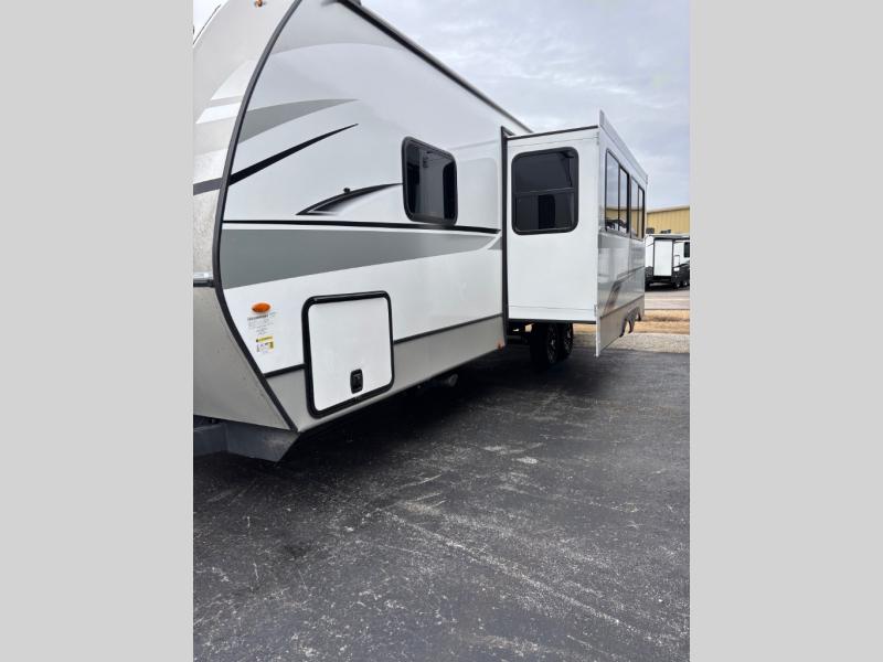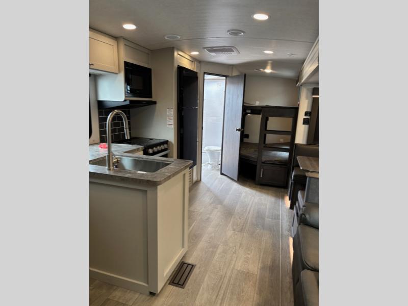 With dual entry doors in this travel trailer, you can enter in through the main living area or the full bath for convenience! Once inside, the sleeper sofa and booth dinette provide places to relax, eat, and play games, plus there is an entertainment center with hidden storage behind to keep movies organized. A full kitchen with a three burner cooktop and 12V refrigerator will allow you to cook and store food, or you can head outdoors to cook on the outdoor kitchen. There is also drop-frame storage outside for fishing poles and hiking gear, and the 21' electric awning provides shade as you relax. When it's time to call it a night, the king bed in the front private bedroom is sure to bring comfort, while the little ones take the double-size bunks, and any other guests can sleep on the living room furniture!