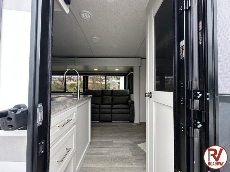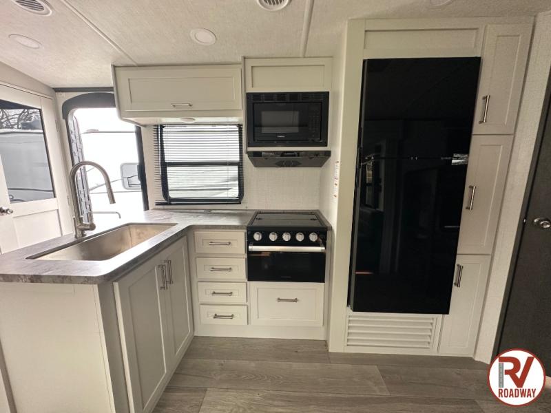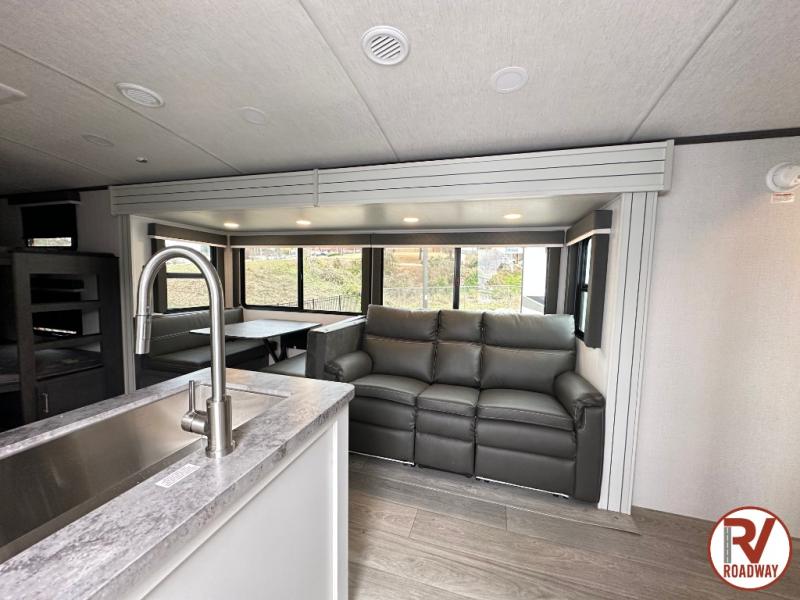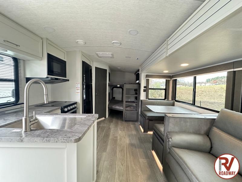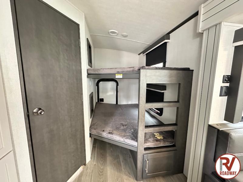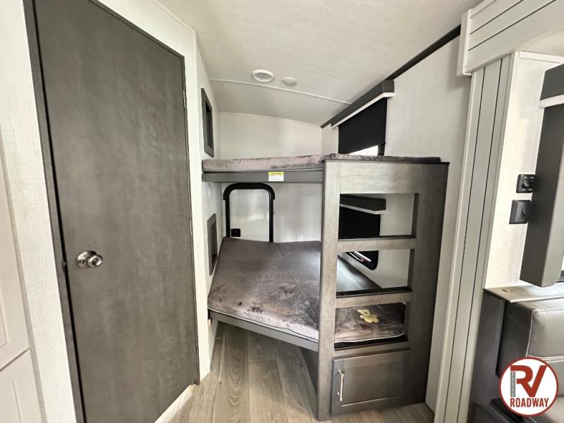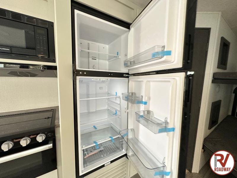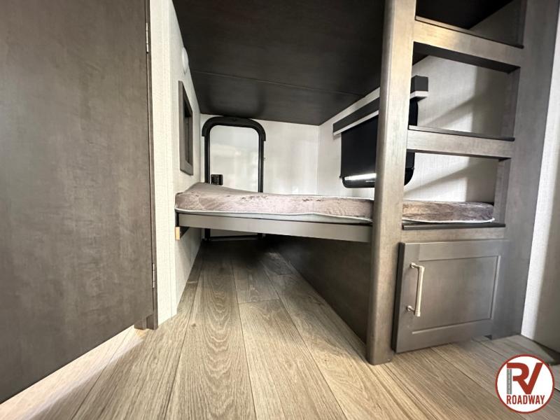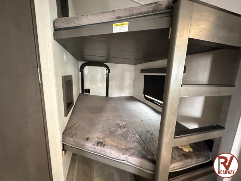 With dual entry doors in this travel trailer, you can enter in through the main living area or the full bath for convenience! Once inside, the sleeper sofa and booth dinette provide places to relax, eat, and play games, plus there is an entertainment center with hidden storage behind to keep movies organized. A full kitchen with a three burner cooktop and 12V refrigerator will allow you to cook and store food, or you can head outdoors to cook on the outdoor kitchen. There is also drop-frame storage outside for fishing poles and hiking gear, and the 21' electric awning provides shade as you relax. When it's time to call it a night, the king bed in the front private bedroom is sure to bring comfort, while the little ones take the double-size bunks, and any other guests can sleep on the living room furniture!