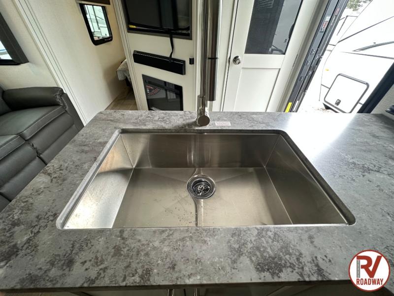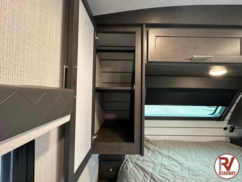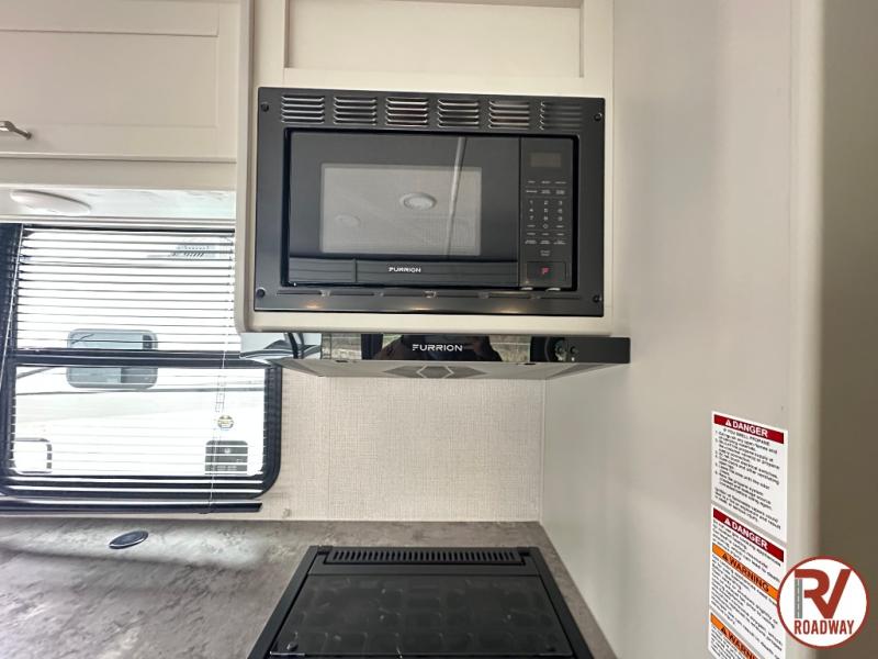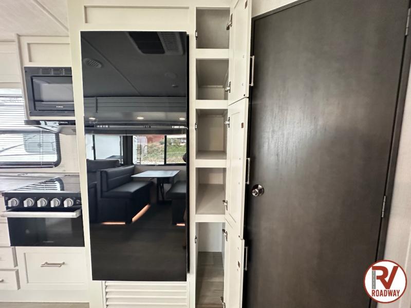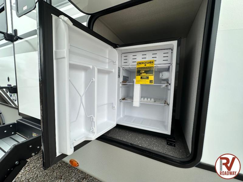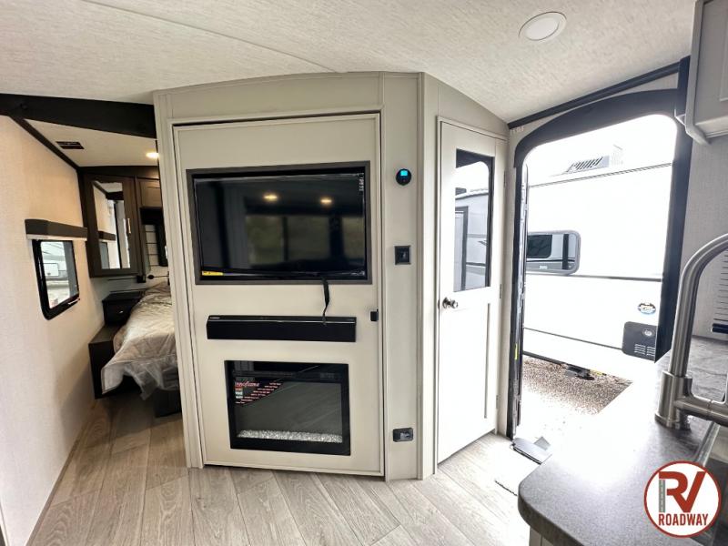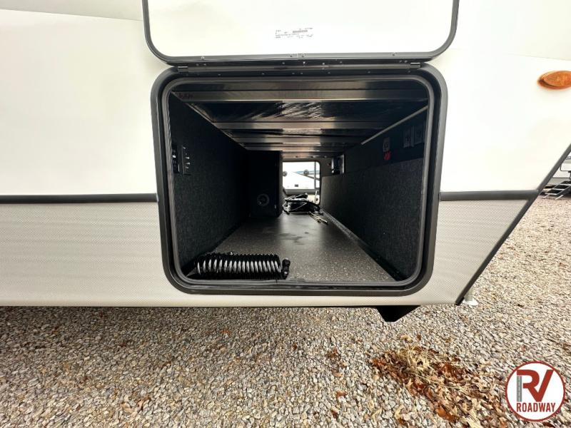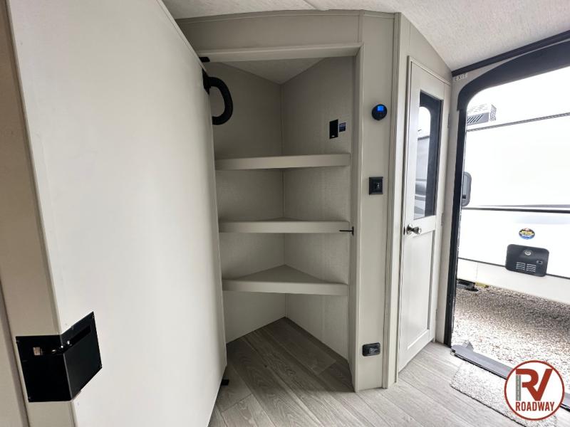 With dual entry doors in this travel trailer, you can enter in through the main living area or the full bath for convenience! Once inside, the sleeper sofa and booth dinette provide places to relax, eat, and play games, plus there is an entertainment center with hidden storage behind to keep movies organized. A full kitchen with a three burner cooktop and 12V refrigerator will allow you to cook and store food, or you can head outdoors to cook on the outdoor kitchen. There is also drop-frame storage outside for fishing poles and hiking gear, and the 21' electric awning provides shade as you relax. When it's time to call it a night, the king bed in the front private bedroom is sure to bring comfort, while the little ones take the double-size bunks, and any other guests can sleep on the living room furniture!