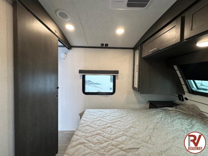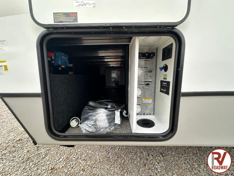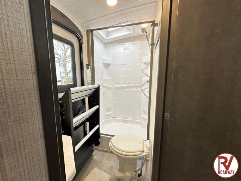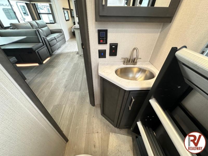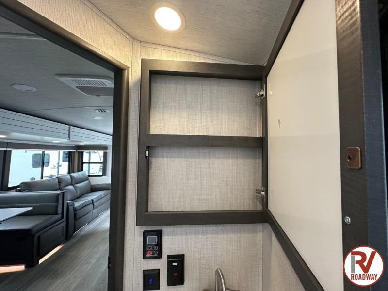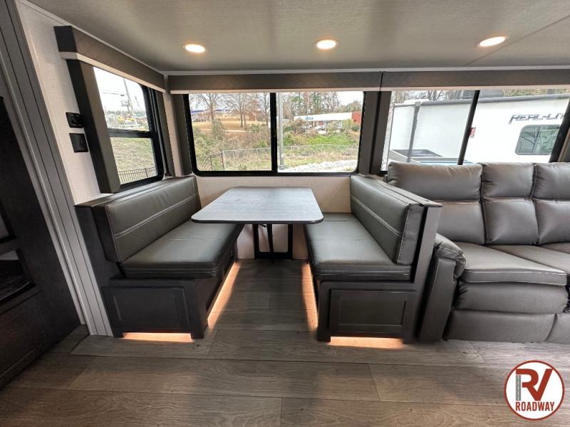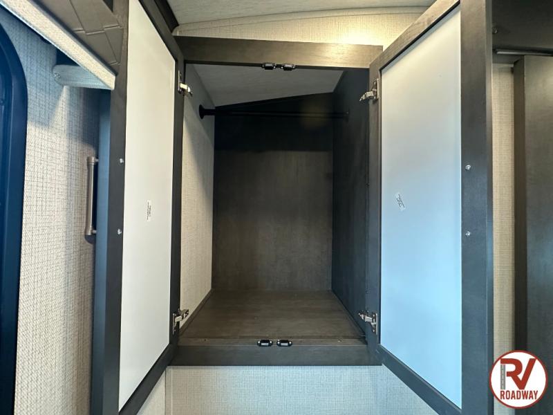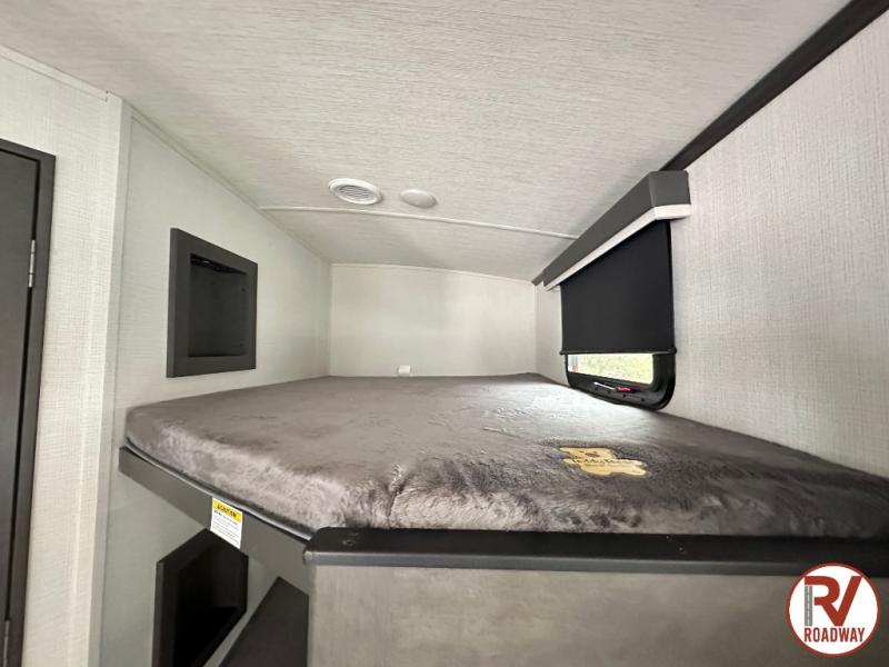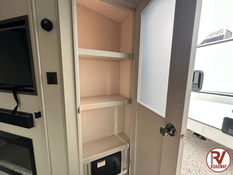 With dual entry doors in this travel trailer, you can enter in through the main living area or the full bath for convenience! Once inside, the sleeper sofa and booth dinette provide places to relax, eat, and play games, plus there is an entertainment center with hidden storage behind to keep movies organized. A full kitchen with a three burner cooktop and 12V refrigerator will allow you to cook and store food, or you can head outdoors to cook on the outdoor kitchen. There is also drop-frame storage outside for fishing poles and hiking gear, and the 21' electric awning provides shade as you relax. When it's time to call it a night, the king bed in the front private bedroom is sure to bring comfort, while the little ones take the double-size bunks, and any other guests can sleep on the living room furniture!
