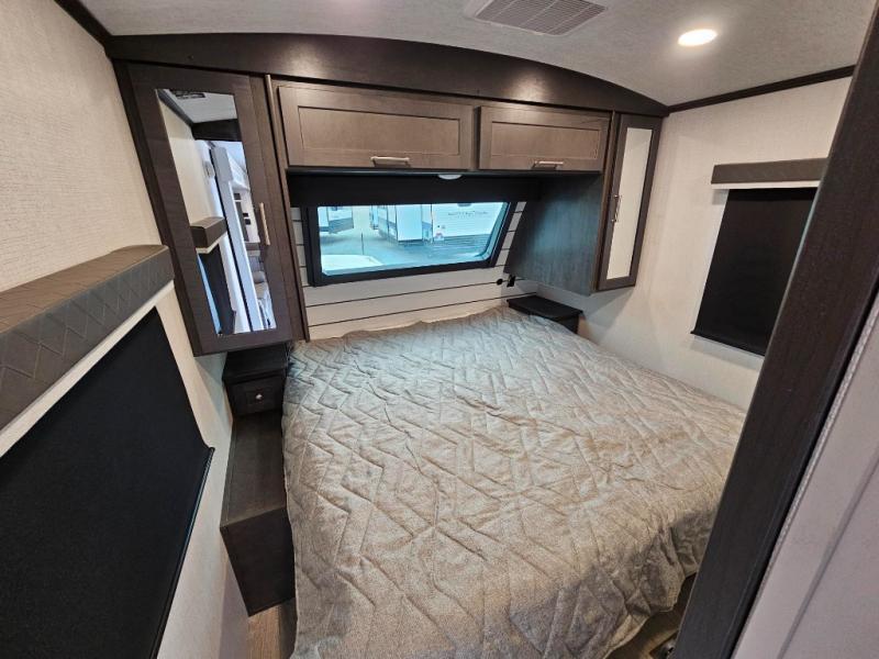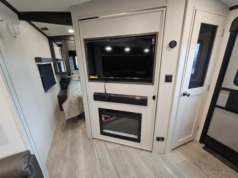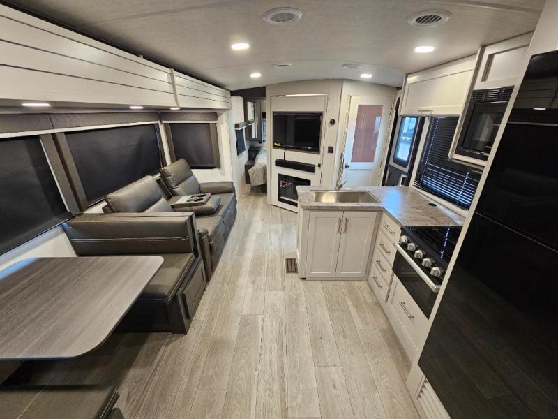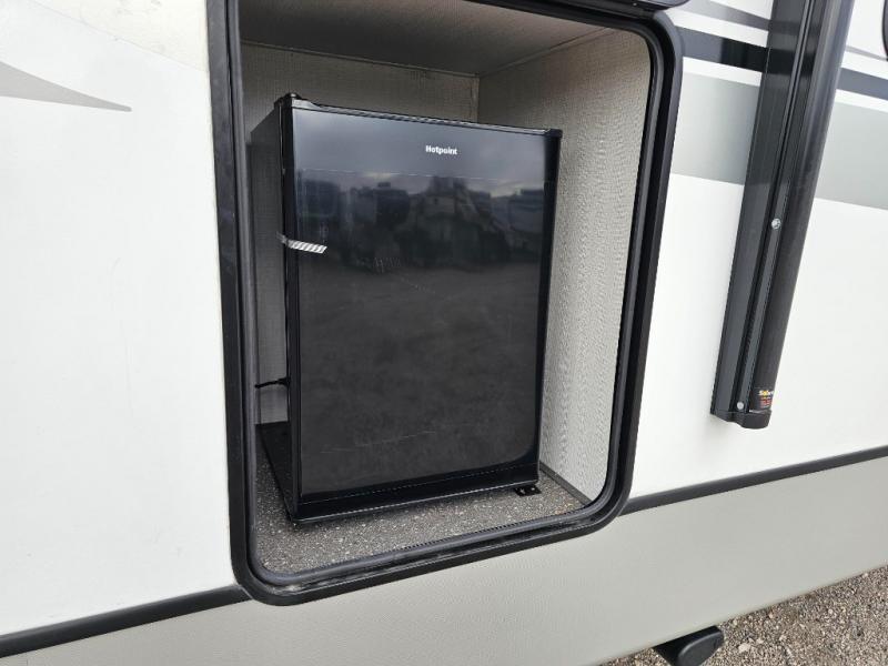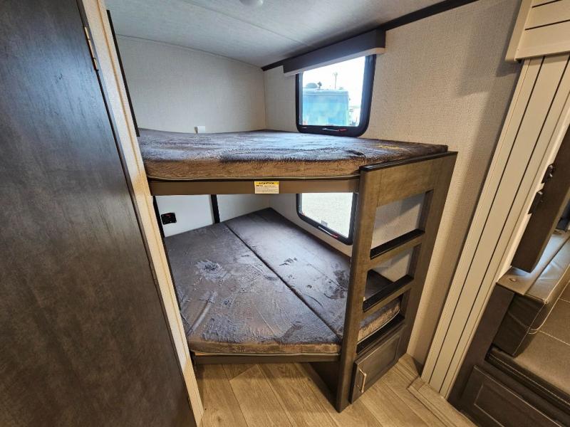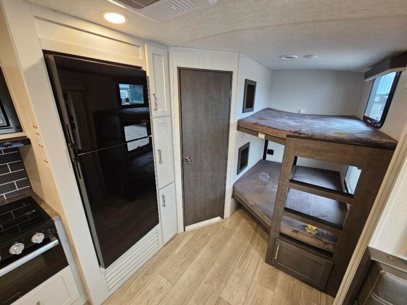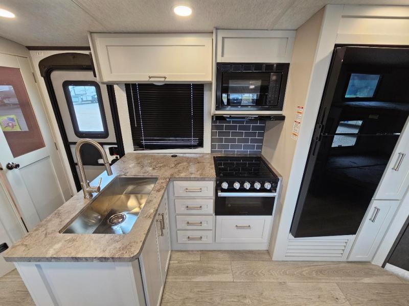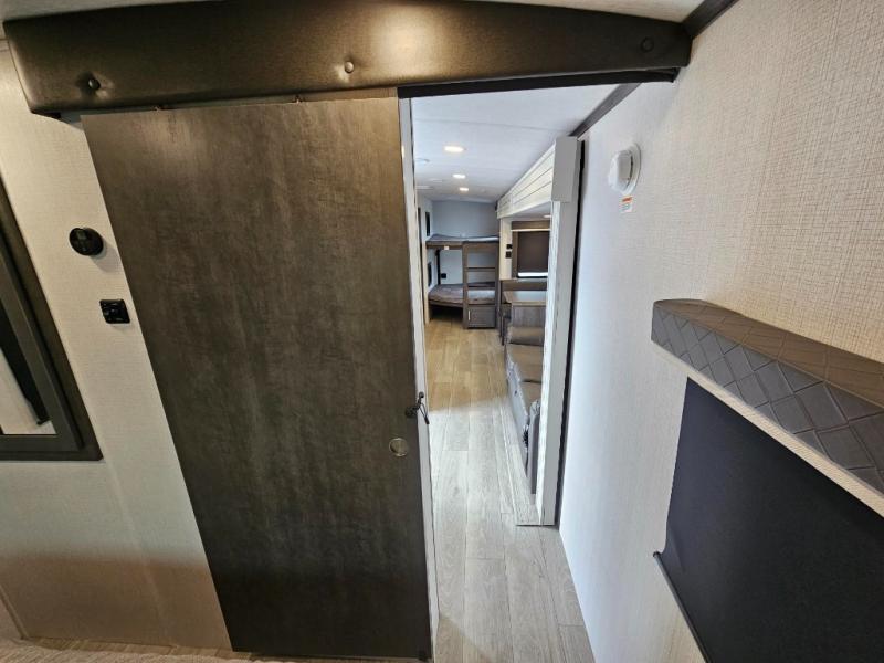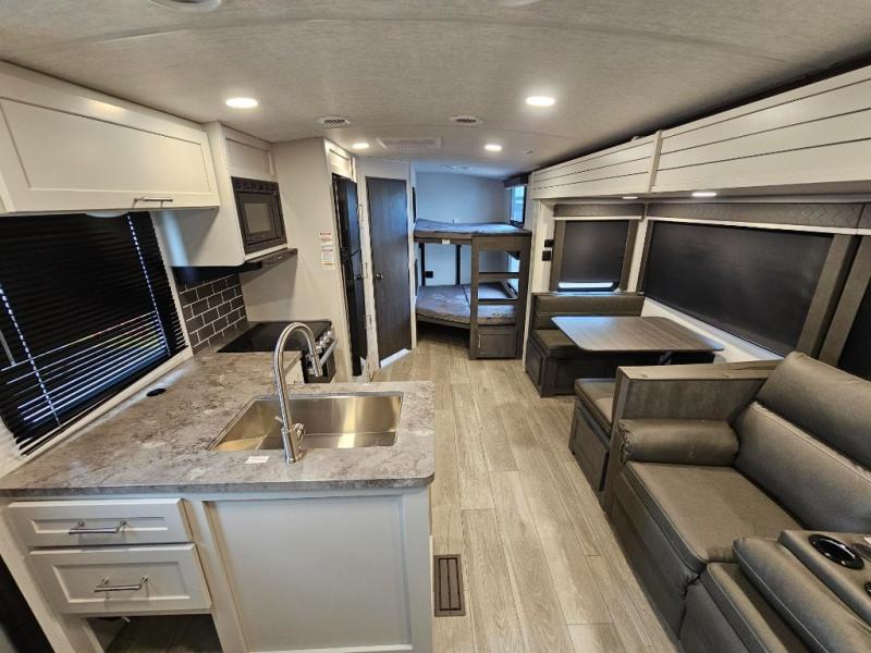 With dual entry doors in this travel trailer, you can enter in through the main living area or the full bath for convenience! Once inside, the sleeper sofa and booth dinette provide places to relax, eat, and play games, plus there is an entertainment center with hidden storage behind to keep movies organized. A full kitchen with a three burner cooktop and 12V refrigerator will allow you to cook and store food, or you can head outdoors to cook on the outdoor kitchen. There is also drop-frame storage outside for fishing poles and hiking gear, and the 21' electric awning provides shade as you relax. When it's time to call it a night, the king bed in the front private bedroom is sure to bring comfort, while the little ones take the double-size bunks, and any other guests can sleep on the living room furniture!