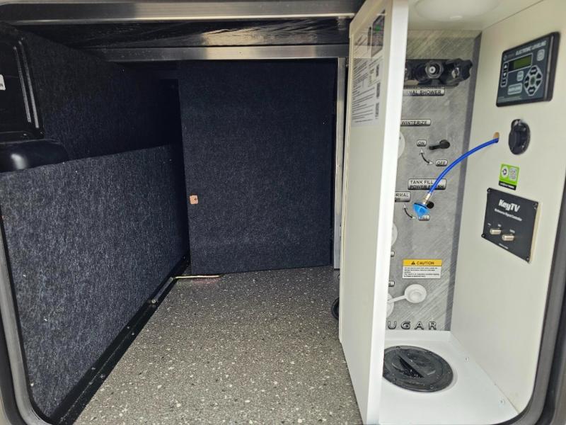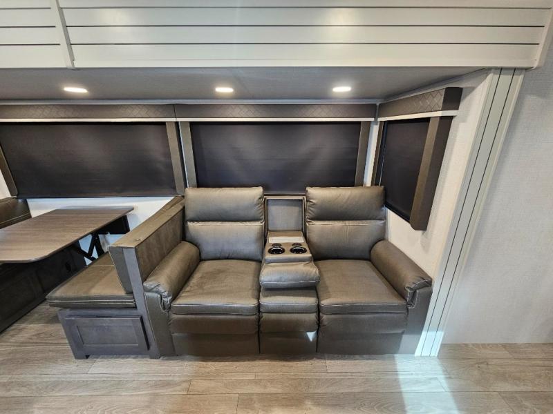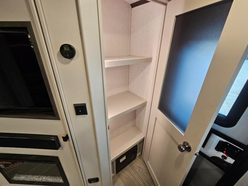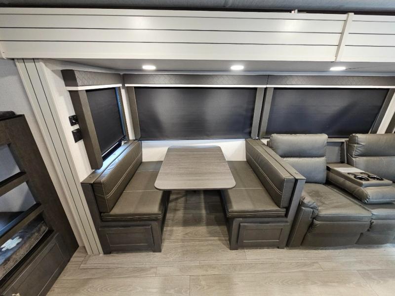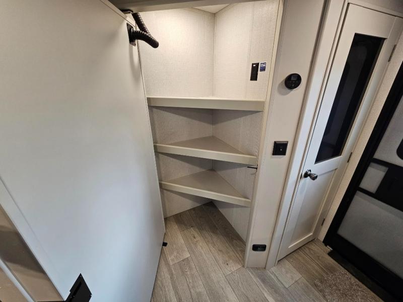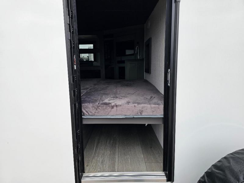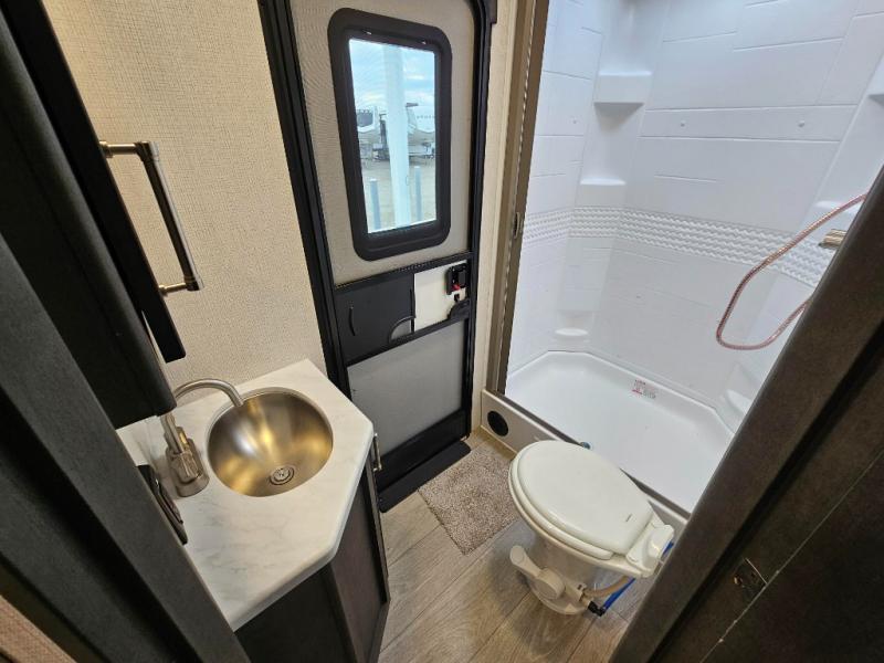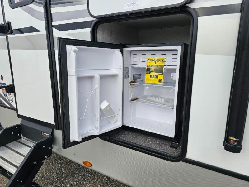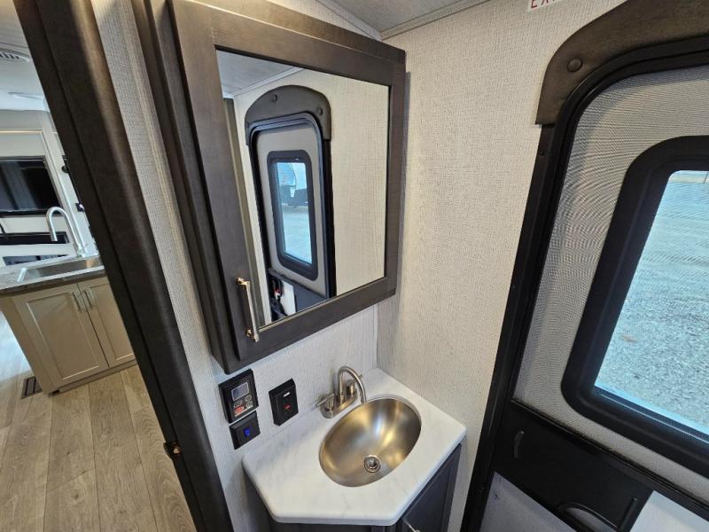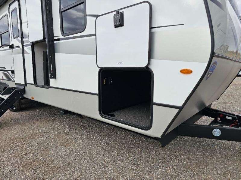 With dual entry doors in this travel trailer, you can enter in through the main living area or the full bath for convenience! Once inside, the sleeper sofa and booth dinette provide places to relax, eat, and play games, plus there is an entertainment center with hidden storage behind to keep movies organized. A full kitchen with a three burner cooktop and 12V refrigerator will allow you to cook and store food, or you can head outdoors to cook on the outdoor kitchen. There is also drop-frame storage outside for fishing poles and hiking gear, and the 21' electric awning provides shade as you relax. When it's time to call it a night, the king bed in the front private bedroom is sure to bring comfort, while the little ones take the double-size bunks, and any other guests can sleep on the living room furniture!