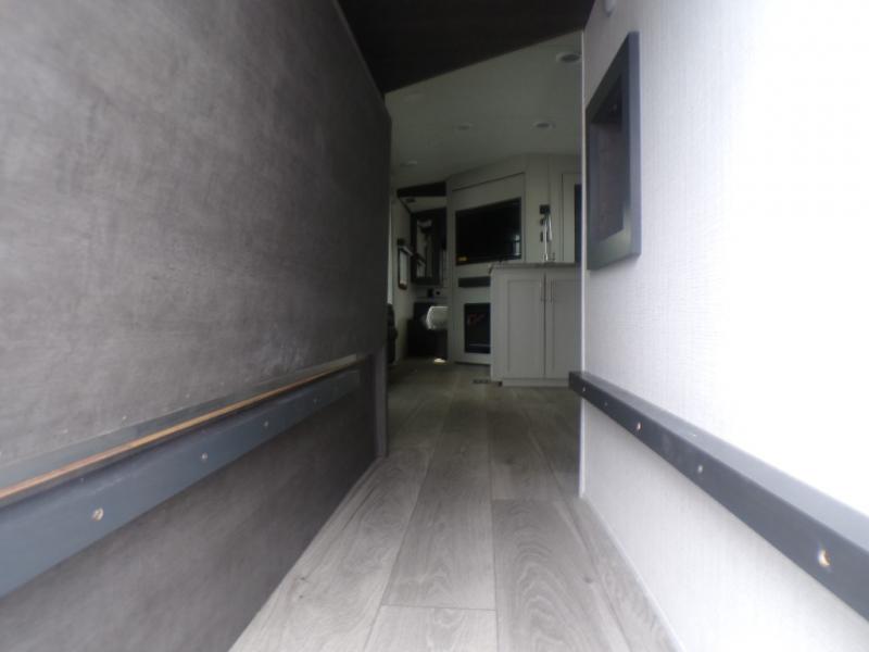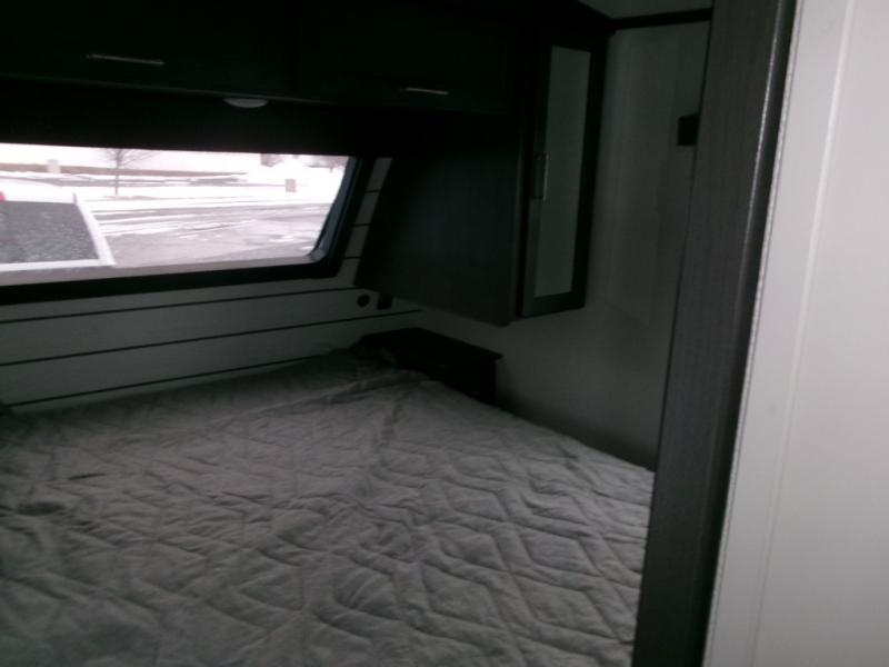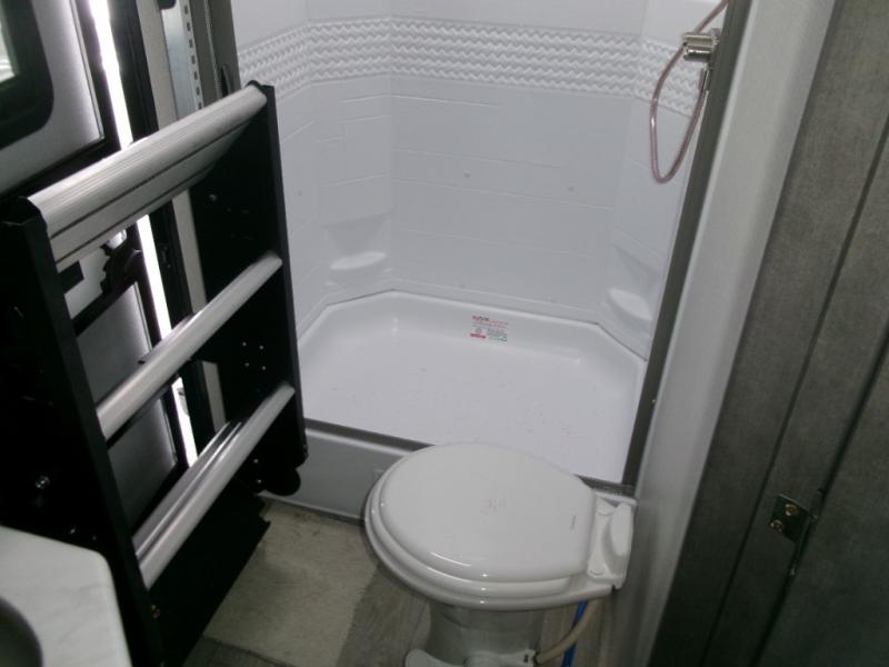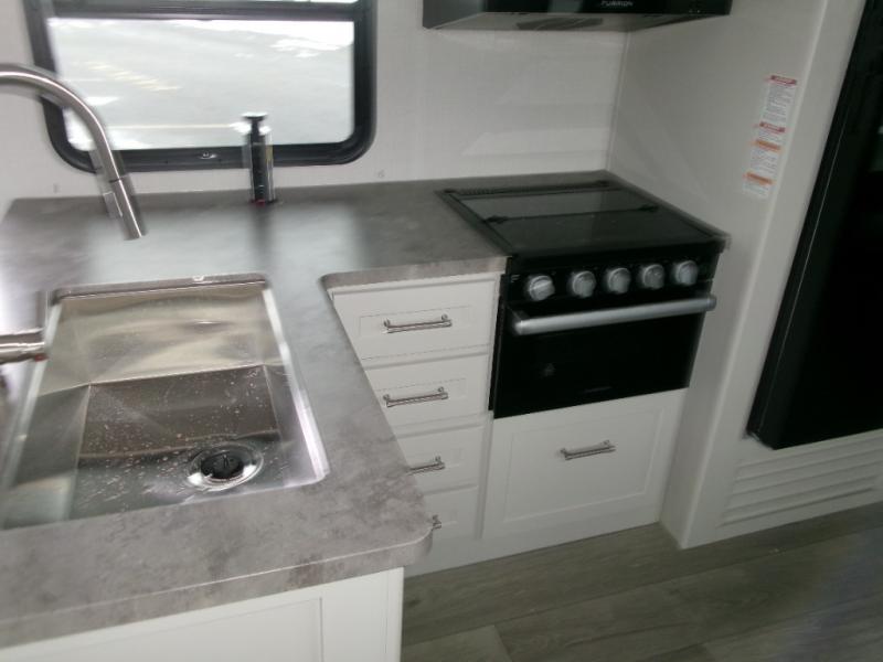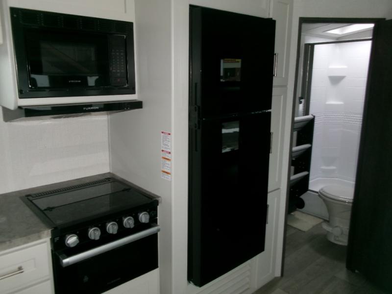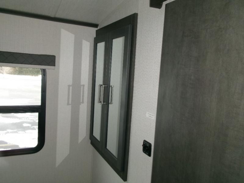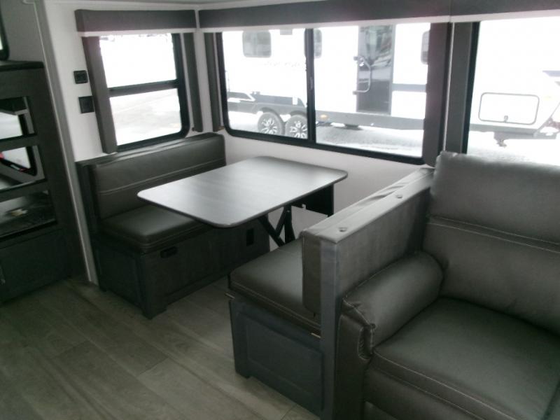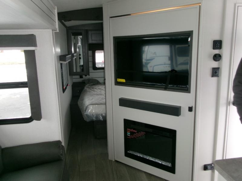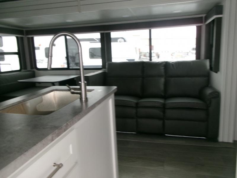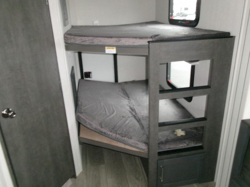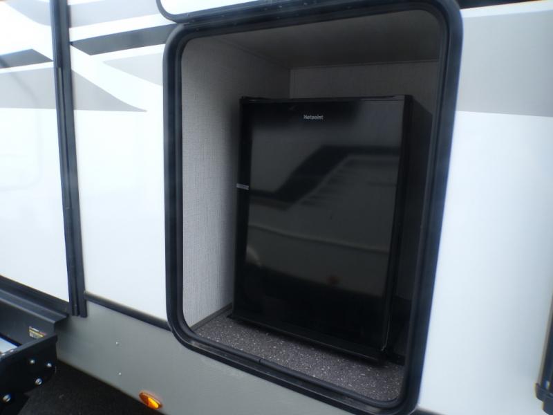 With dual entry doors in this travel trailer, you can enter in through the main living area or the full bath for convenience! Once inside, the sleeper sofa and booth dinette provide places to relax, eat, and play games, plus there is an entertainment center with hidden storage behind to keep movies organized. A full kitchen with a three burner cooktop and 12V refrigerator will allow you to cook and store food, or you can head outdoors to cook on the outdoor kitchen. There is also drop-frame storage outside for fishing poles and hiking gear, and the 21' electric awning provides shade as you relax. When it's time to call it a night, the king bed in the front private bedroom is sure to bring comfort, while the little ones take the double-size bunks, and any other guests can sleep on the living room furniture!