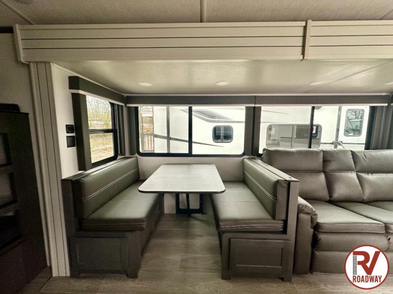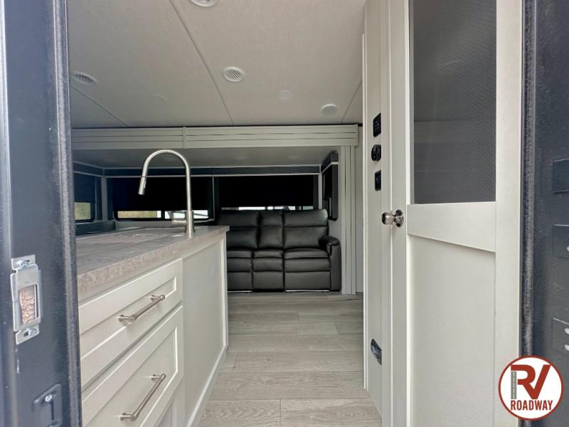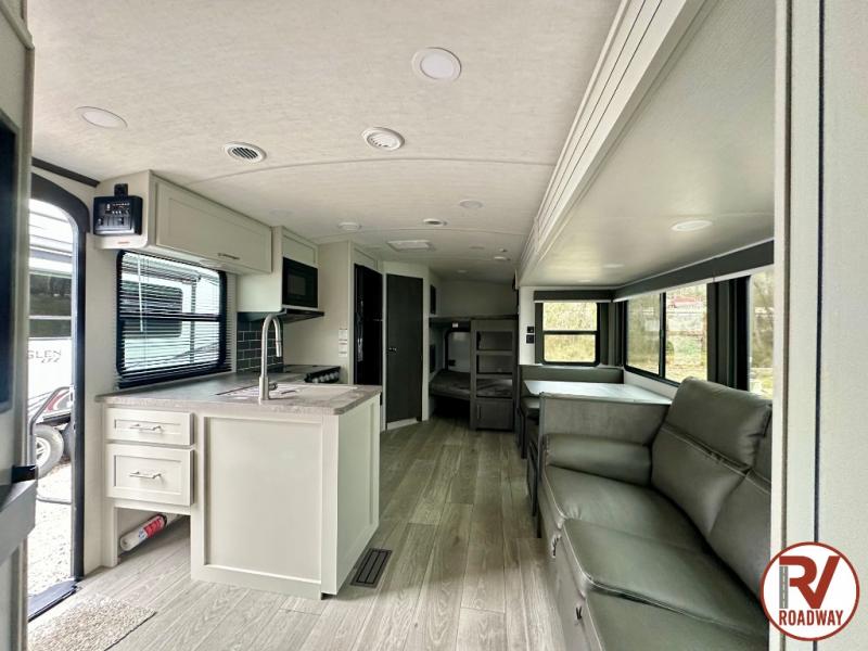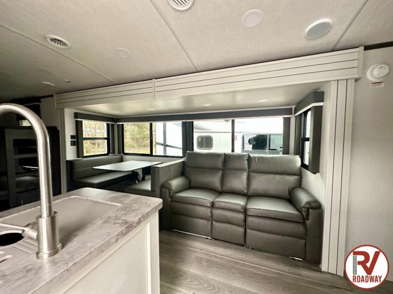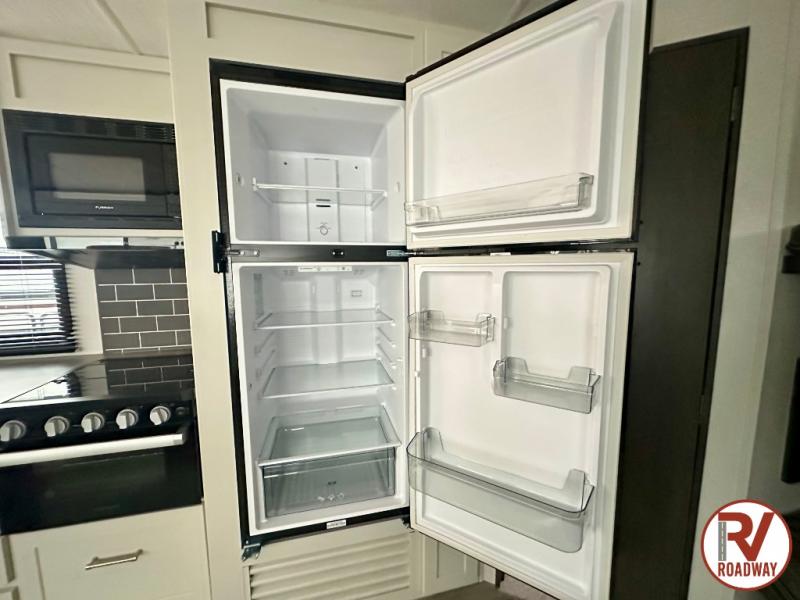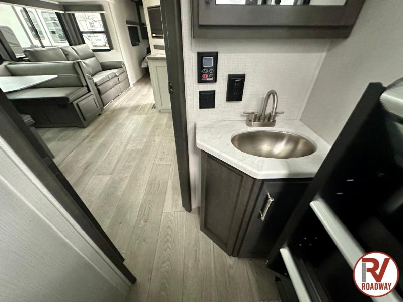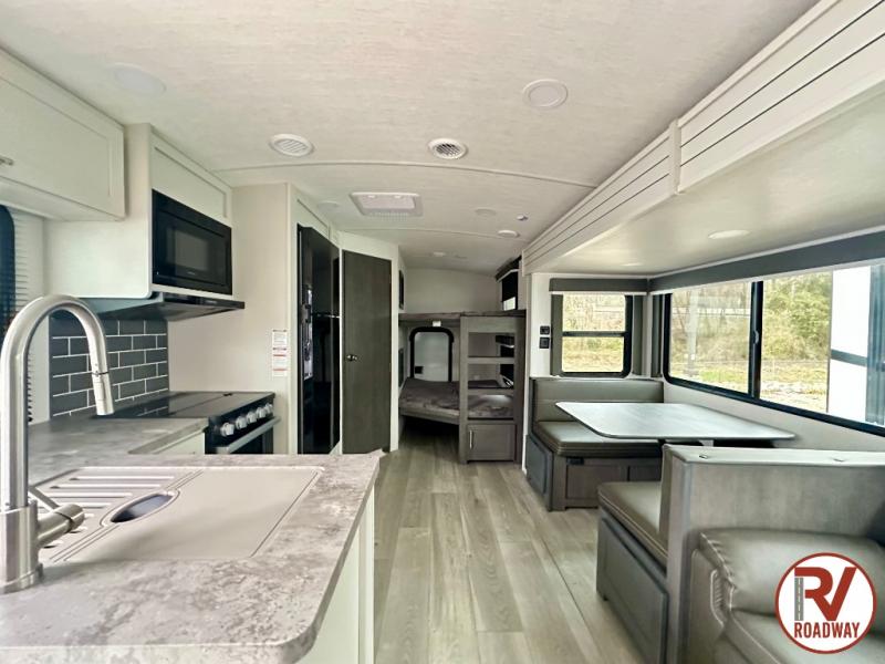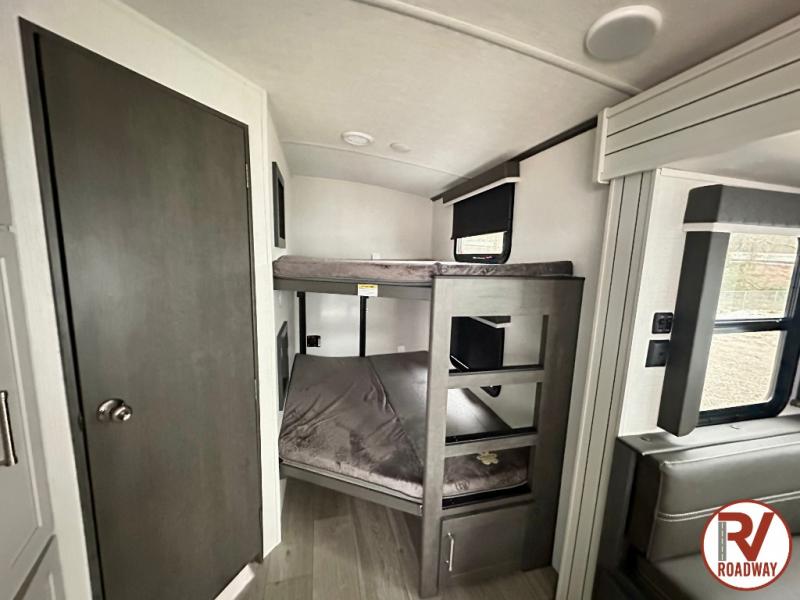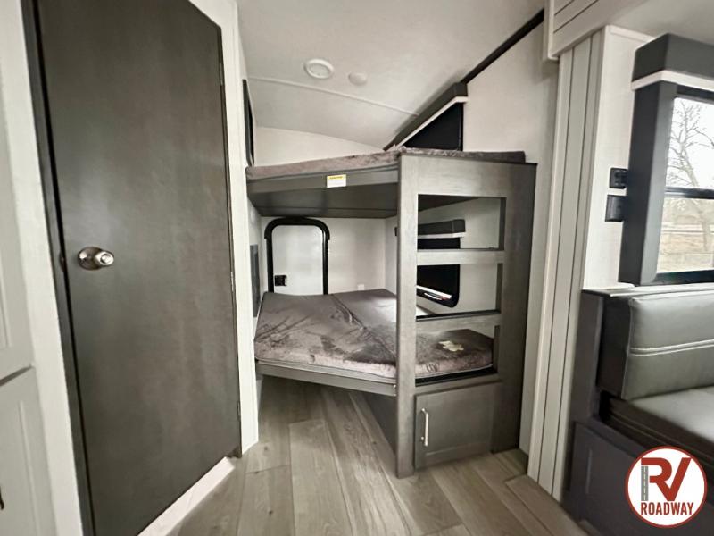 With dual entry doors in this travel trailer, you can enter in through the main living area or the full bath for convenience! Once inside, the sleeper sofa and booth dinette provide places to relax, eat, and play games, plus there is an entertainment center with hidden storage behind to keep movies organized. A full kitchen with a three burner cooktop and 12V refrigerator will allow you to cook and store food, or you can head outdoors to cook on the outdoor kitchen. There is also drop-frame storage outside for fishing poles and hiking gear, and the 21' electric awning provides shade as you relax. When it's time to call it a night, the king bed in the front private bedroom is sure to bring comfort, while the little ones take the double-size bunks, and any other guests can sleep on the living room furniture!